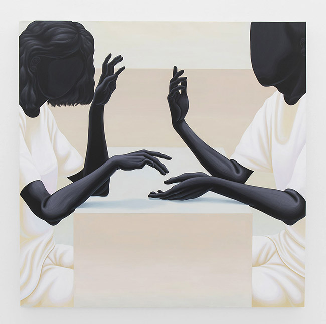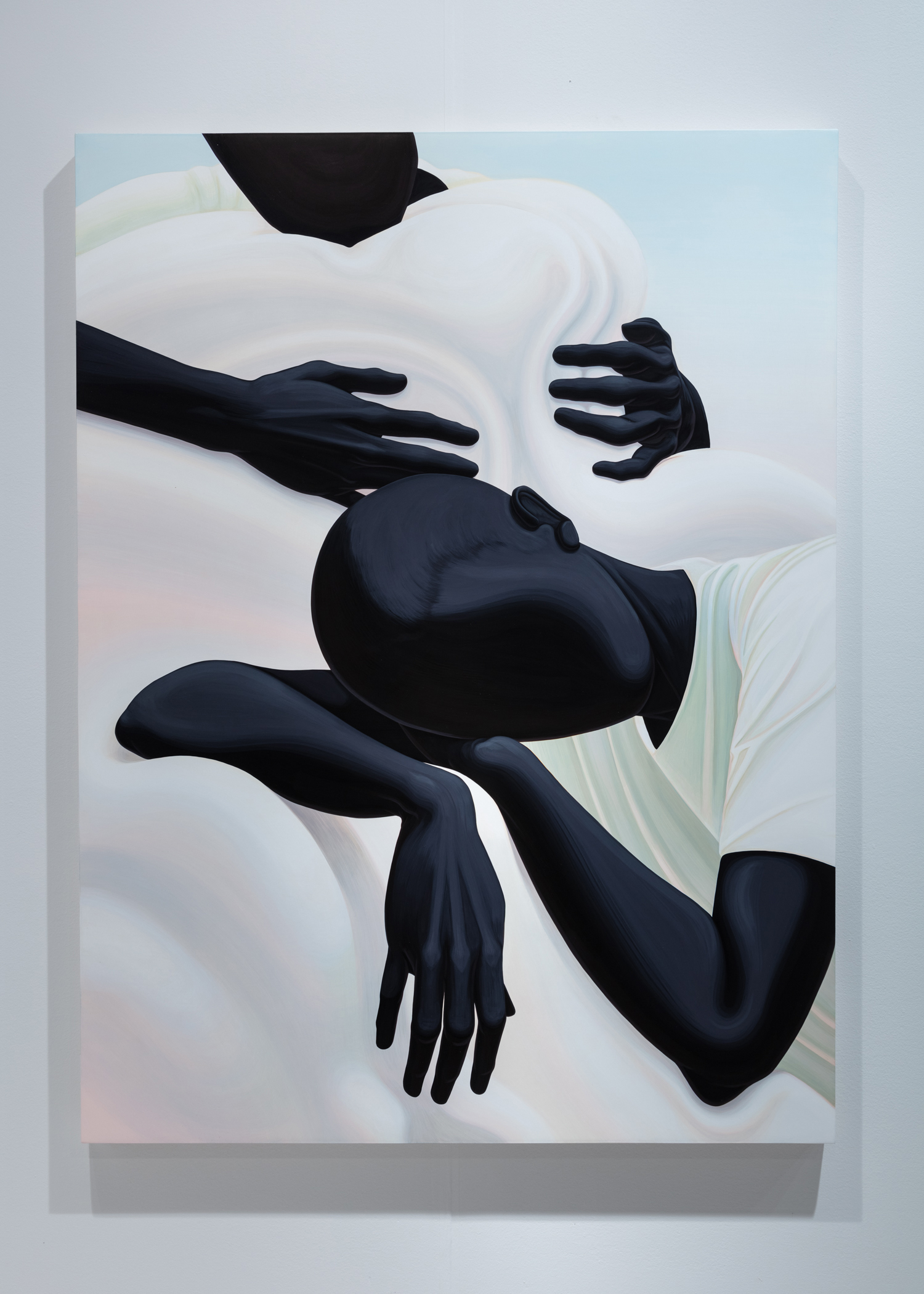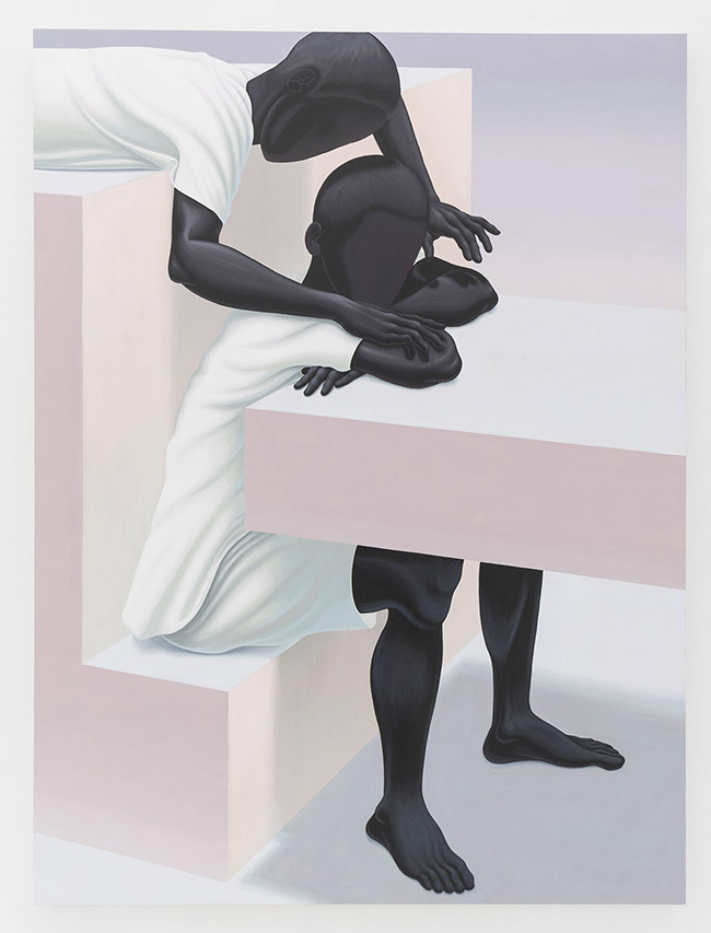 Alex Gardner is a figure painter working in acrylic to make intense and memorable scenes. His entangled ink-black bodies are draped with dramatically folding white cotton separates and posed in pastel environments where the reflections of color produce subtle gradients and thoughtful tonal shifts.
