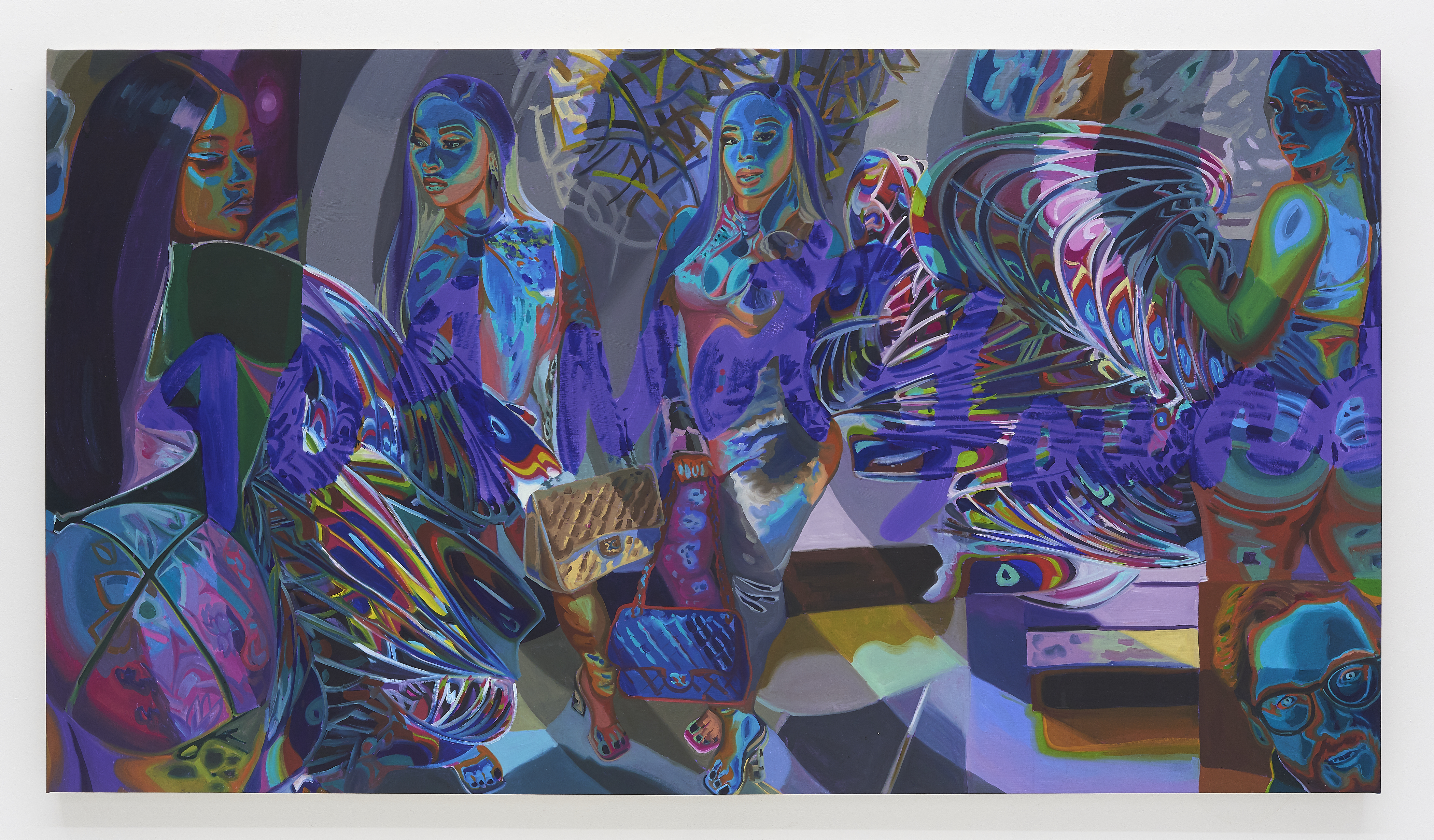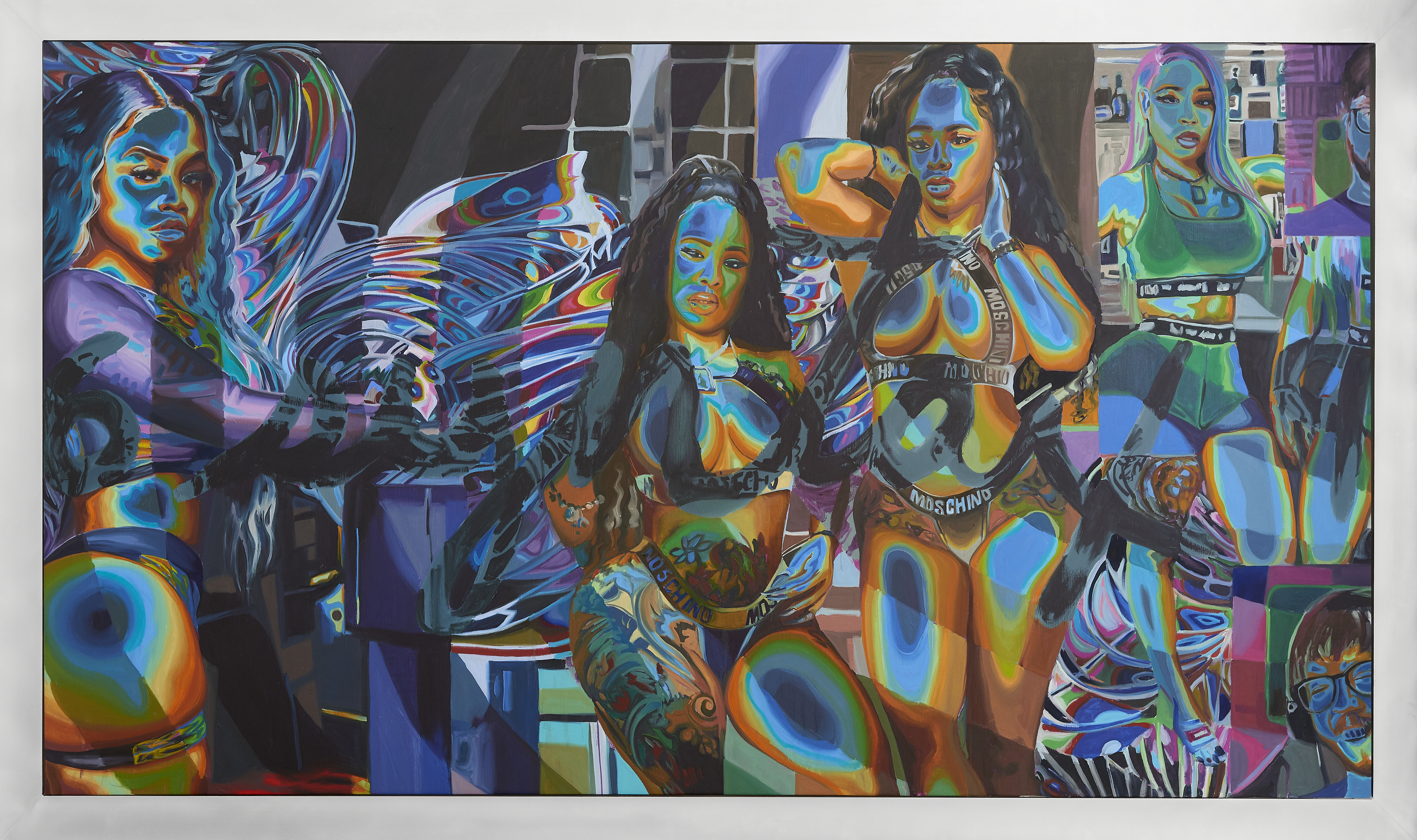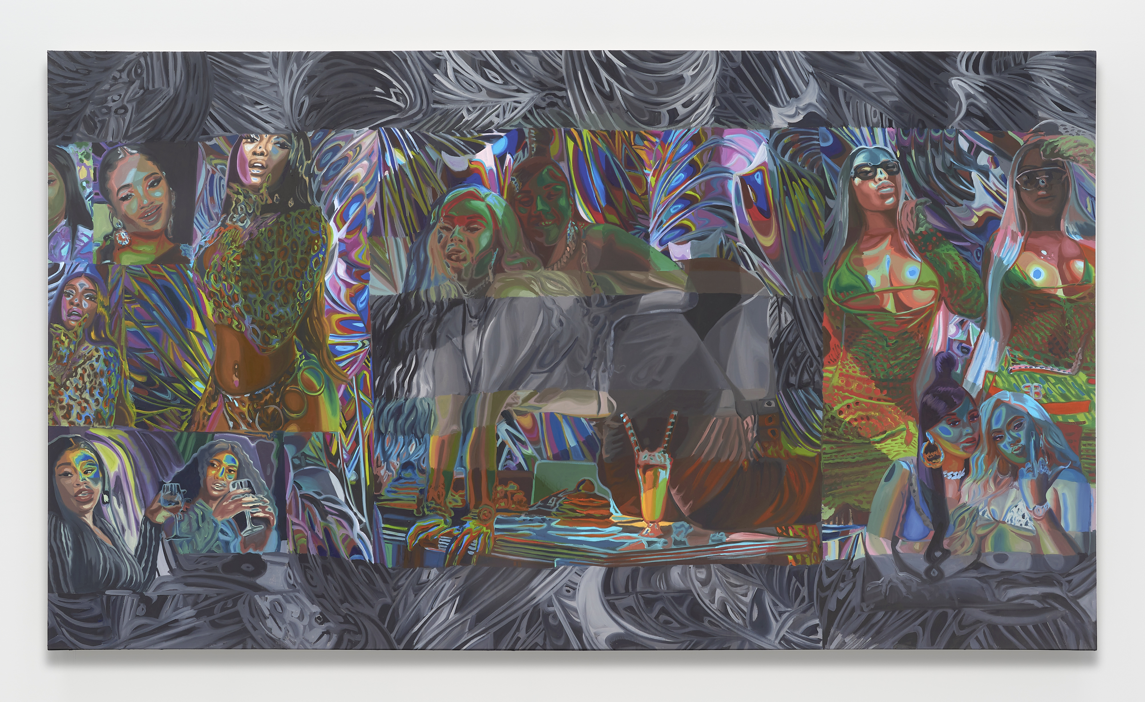 Cherry’s paintings feature larger-than-life subjects in striking color: Black femme figures, familiar composites drawn from an image culture that thrives on appropriating these women’s likeness while rarely crediting their creativity. Across her recent work, these women’s bodies are overlaid with cryptic alphanumeric symbols—kaleidoscopic incursions that refer back to the codes and algorithms that power our media landscape, fueling the algorithmic tools of Black culture’s dissemination and extraction. They also play at themes of authenticity and authentication, gesturing towards the PIN numbers and digital locks that facilitate the online sale of artificially-editioned art. While the women on view would seem to bare it all, the invocation of cryptography suggests a layer of nuance and agency—a reproach to the traditional female nude figure who passively abides her own sexualization.