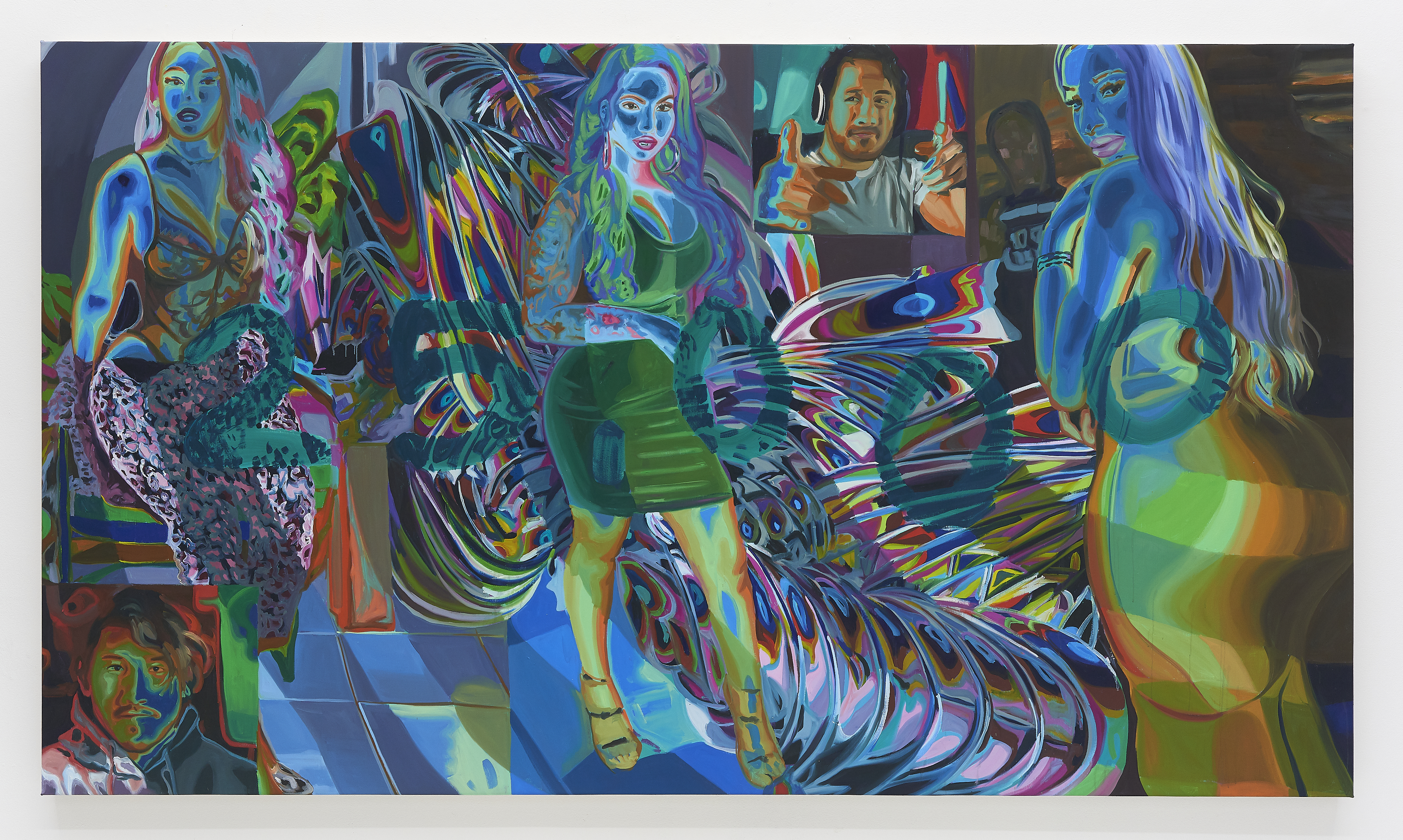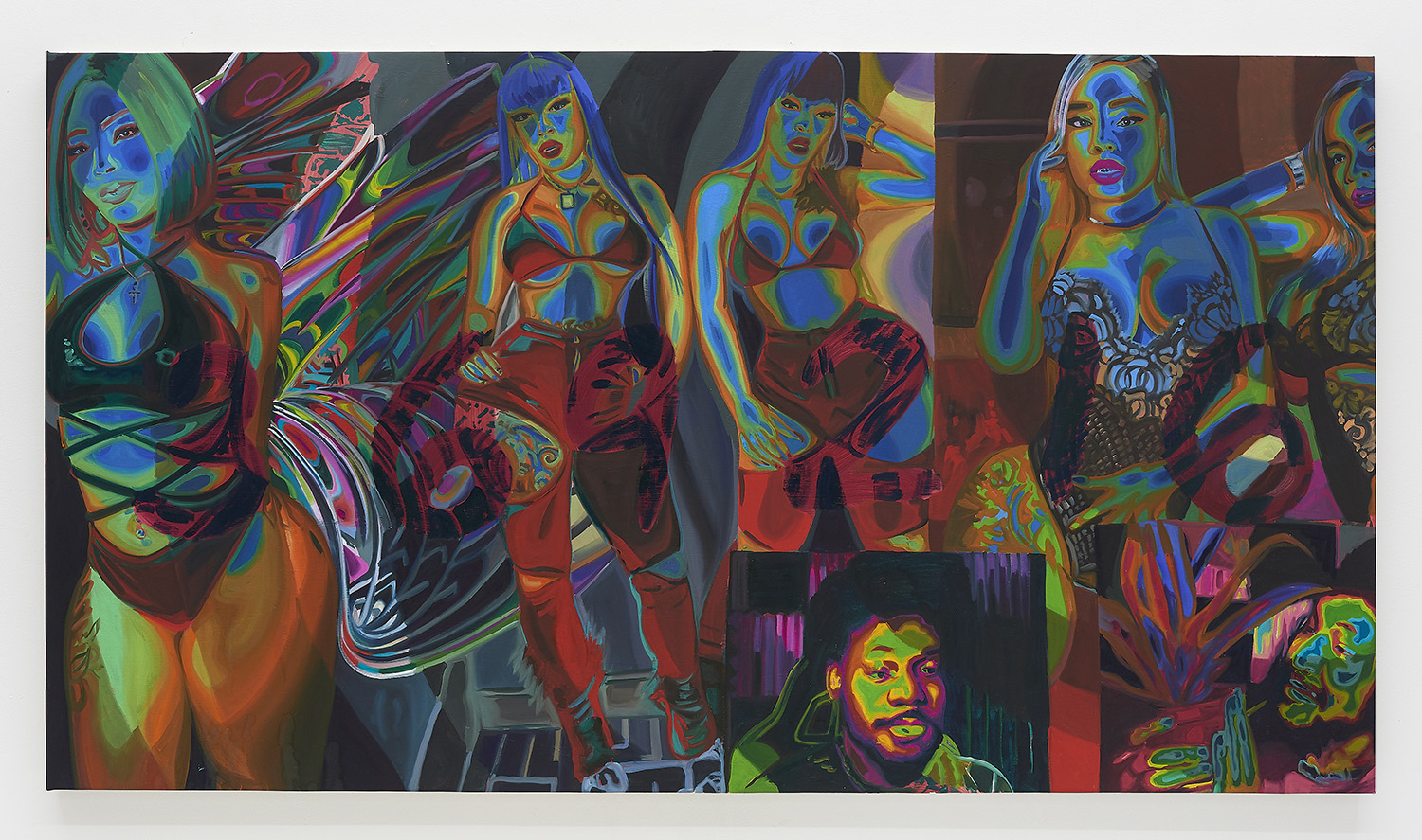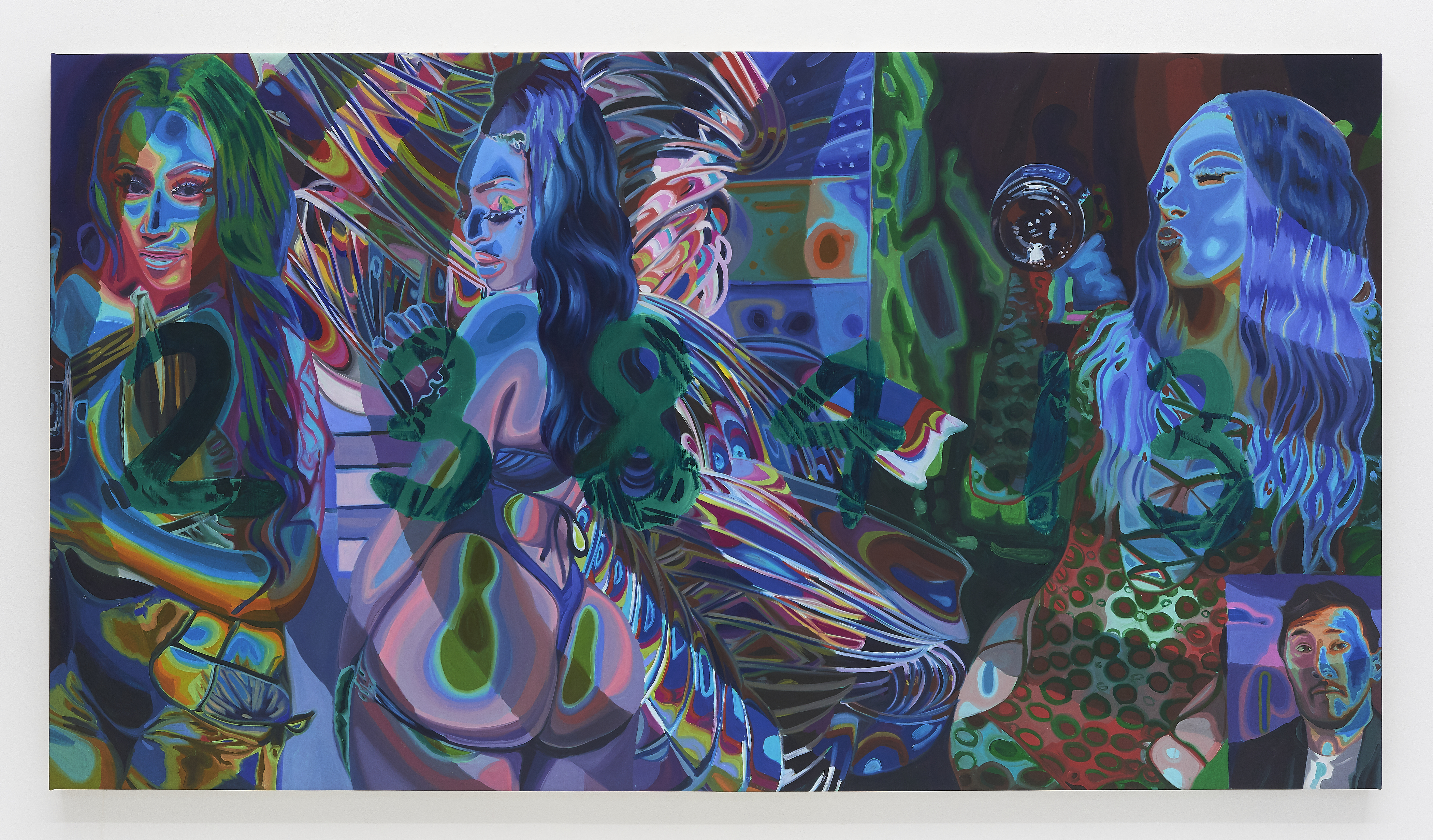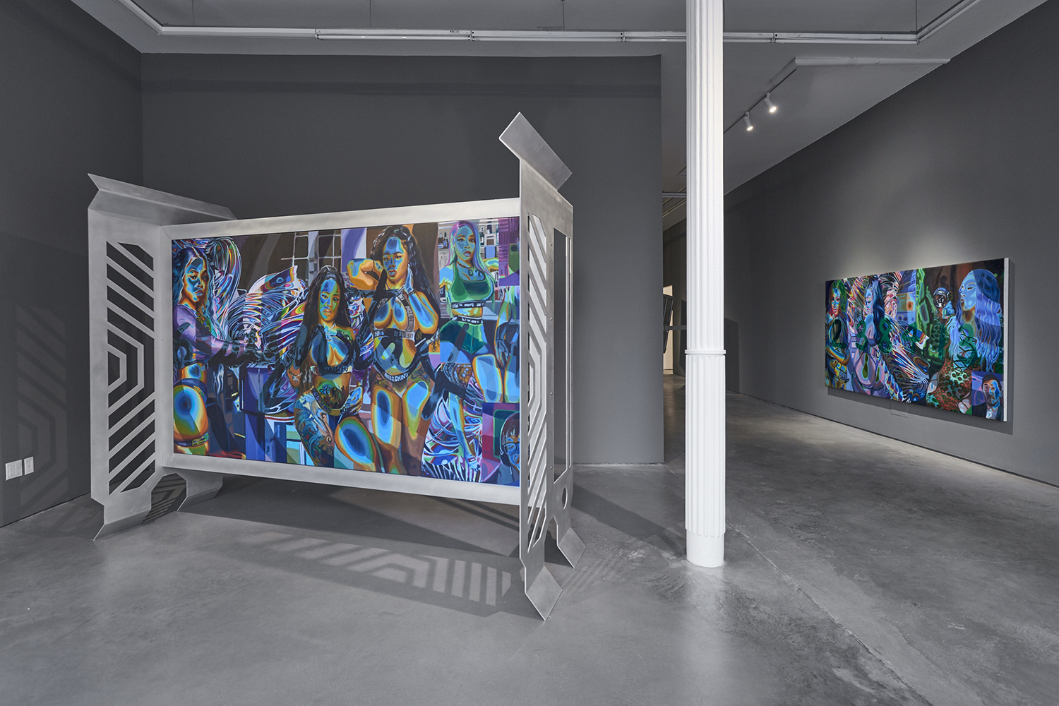 Cherry’s paintings feature larger-than-life subjects in striking color: Black femme figures, familiar composites drawn from an image culture that thrives on appropriating these women’s likeness while rarely crediting their creativity. Across her recent work, these women’s bodies are overlaid with cryptic alphanumeric symbols—kaleidoscopic incursions that refer back to the codes and algorithms that power our media landscape, fueling the algorithmic tools of Black culture’s dissemination and extraction. They also play at themes of authenticity and authentication, gesturing towards the PIN numbers and digital locks that facilitate the online sale of artificially-editioned art. While the women on view would seem to bare it all, the invocation of cryptography suggests a layer of nuance and agency—a reproach to the traditional female nude figure who passively abides her own sexualization.