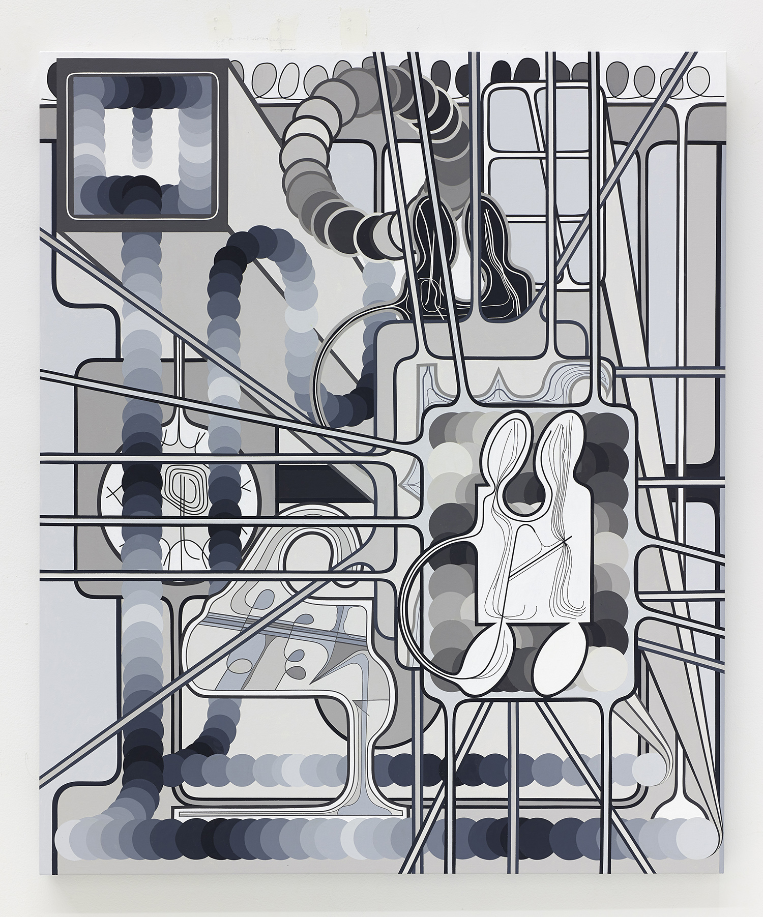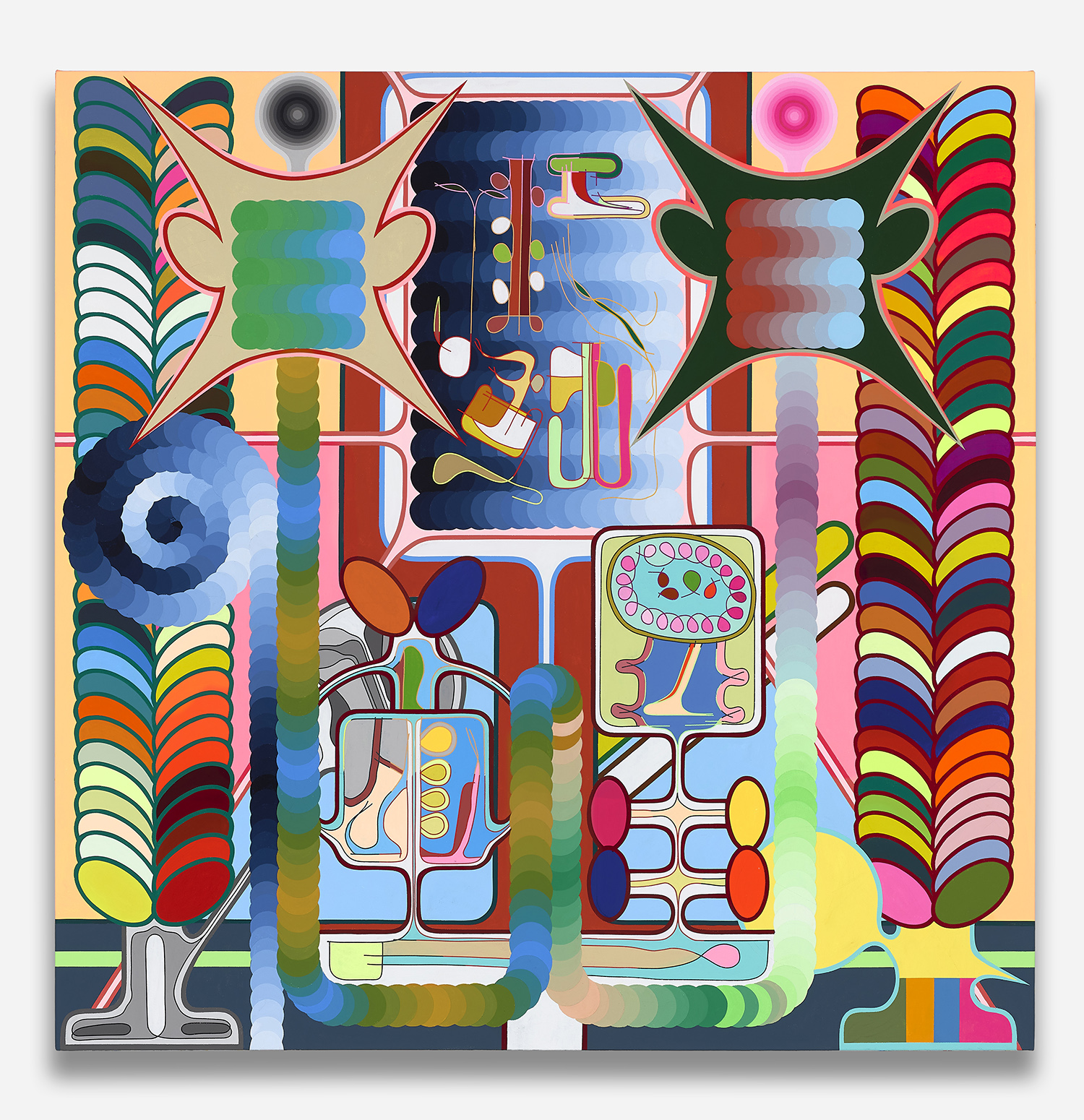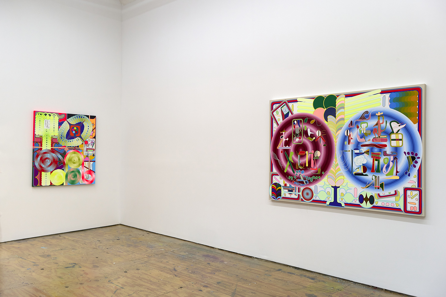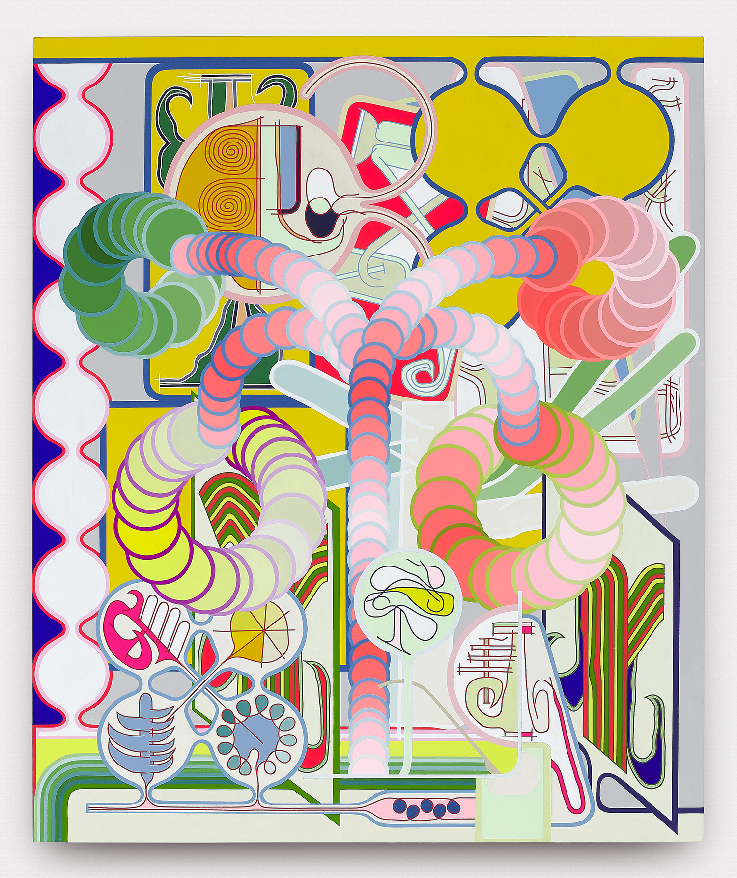 Eric Shaw is a self-taught painter whose bold geometric abstraction draws from the rich visual environment of New York City. Elements of graphic design found in street signs, logos, and advertisements are stretched and skewed as Shaw sketches out what he sees using a drawing app on his phone. The sketches are further copied, pasted and shifted using image editing tools, and then translated onto canvas by hand with acrylic paint. The final work, often incorporating several of the digital sketches in one composition, is a complex conversation between lines, shapes, and color shaped by the functionalities of the imaging tools he implements. His acrylic on canvas paintings are both highly improvisational and painstakingly precise.