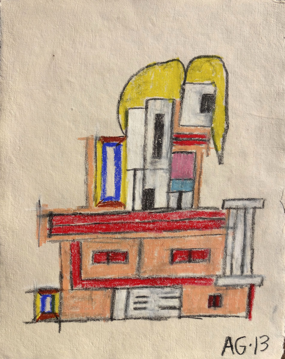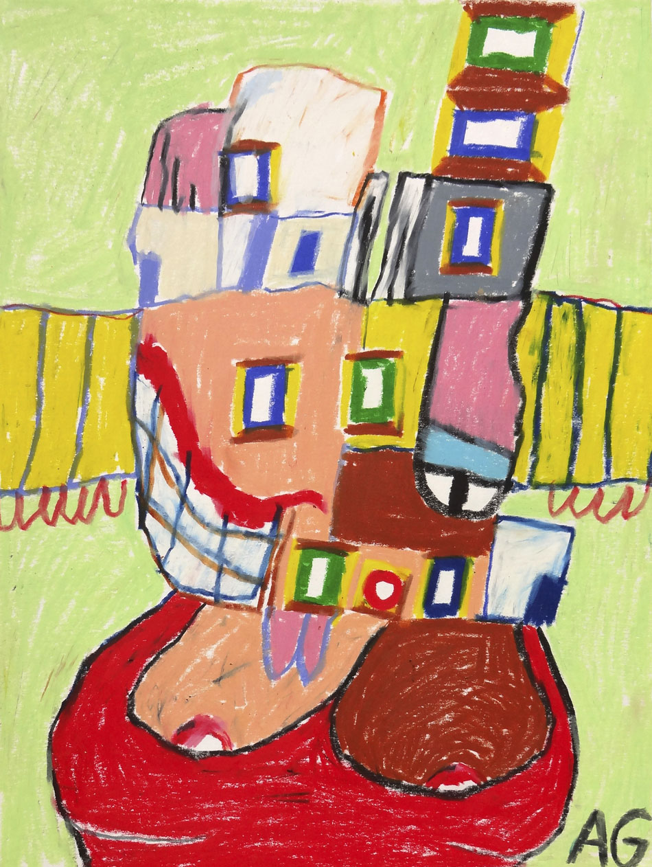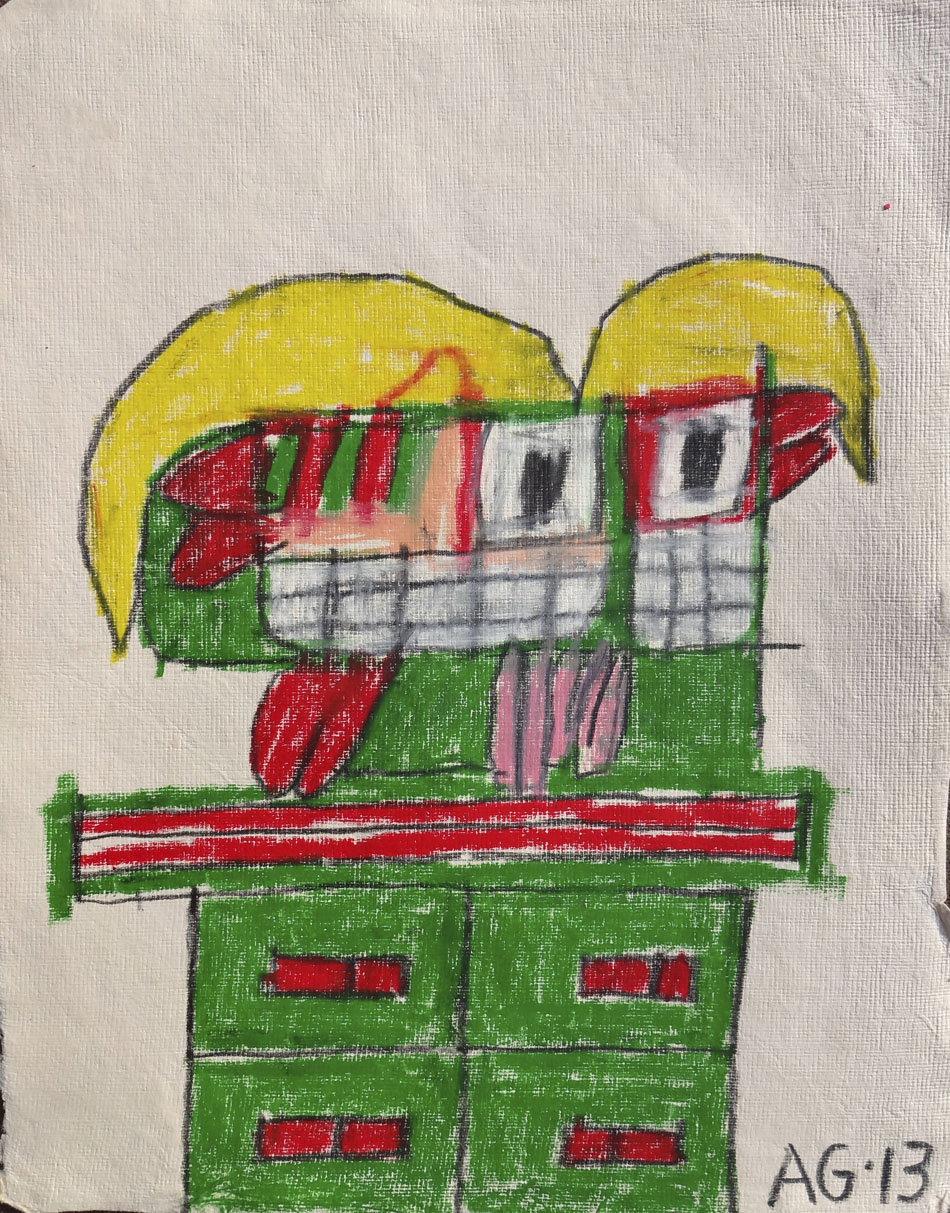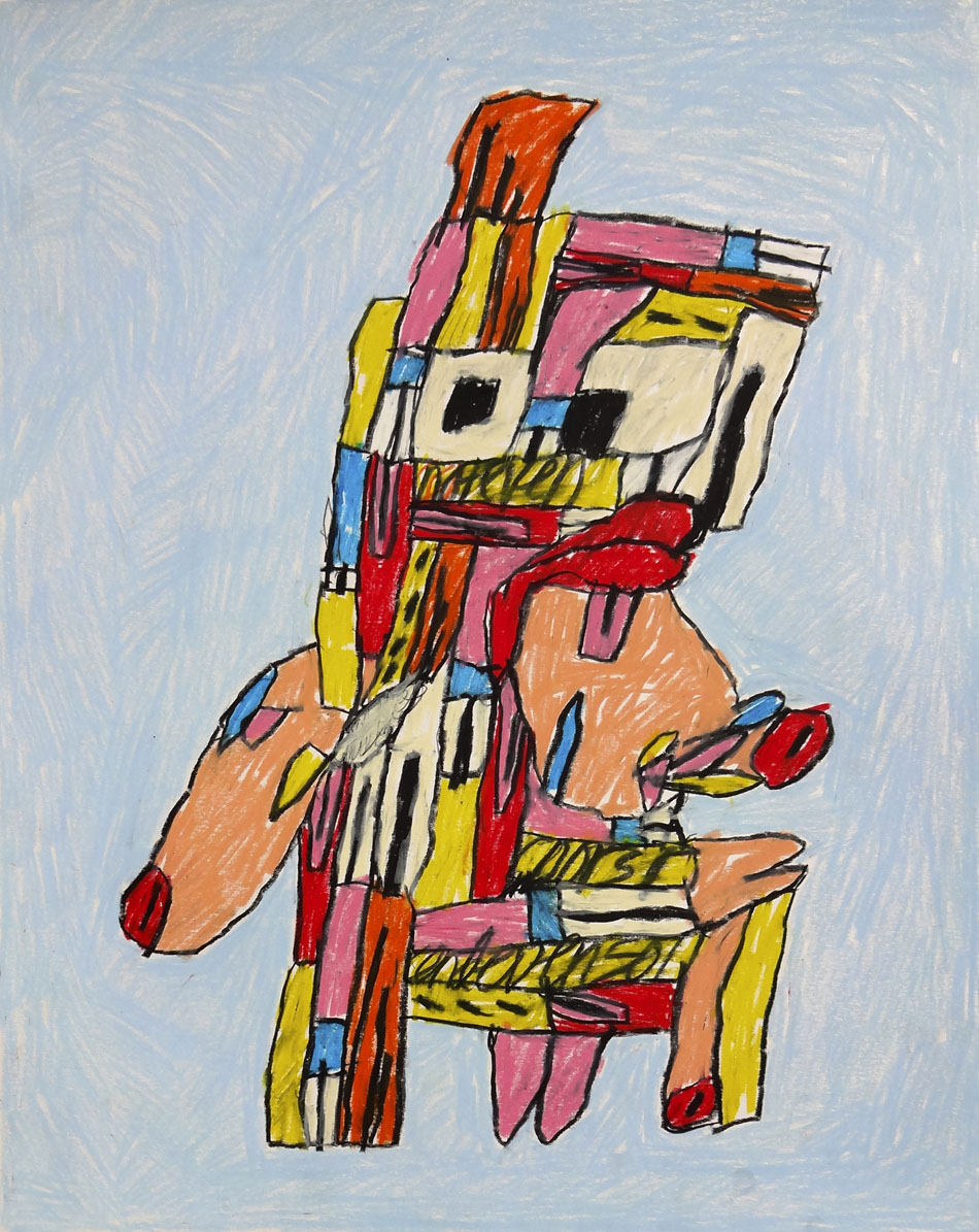 Bordering on architecture or furniture design, the works are only recognizable as female as each has at least one boob; though most have way, way too many boobs. The majority of the works in the show are a mere 12 x 9 inches, but capture in their small size the irreverence and urgency that comes from a direct link between the hand and the unconscious: and as we can see in the show, Green’s unconscious has a somewhat 8-bit sensibility. The bodies are often composed of proliferating blocks, with some including too many eye blocks, too many aforementioned boob blocks, too many mouth blocks, etc. It is as though the image inventory chip to his Nintendo cartridge was functioning properly, however the programming chip that assorted, organized and placed the blocks was malfunctioning.