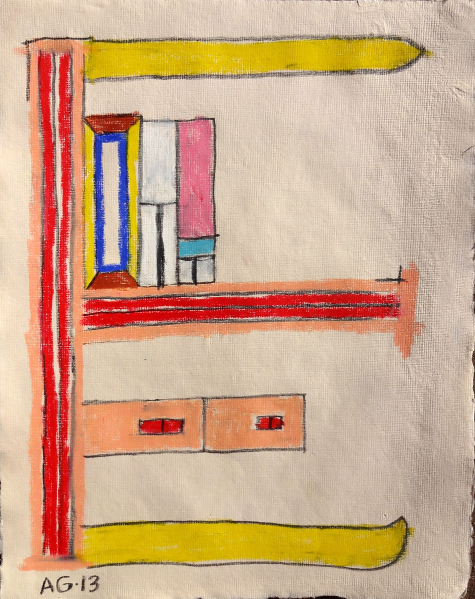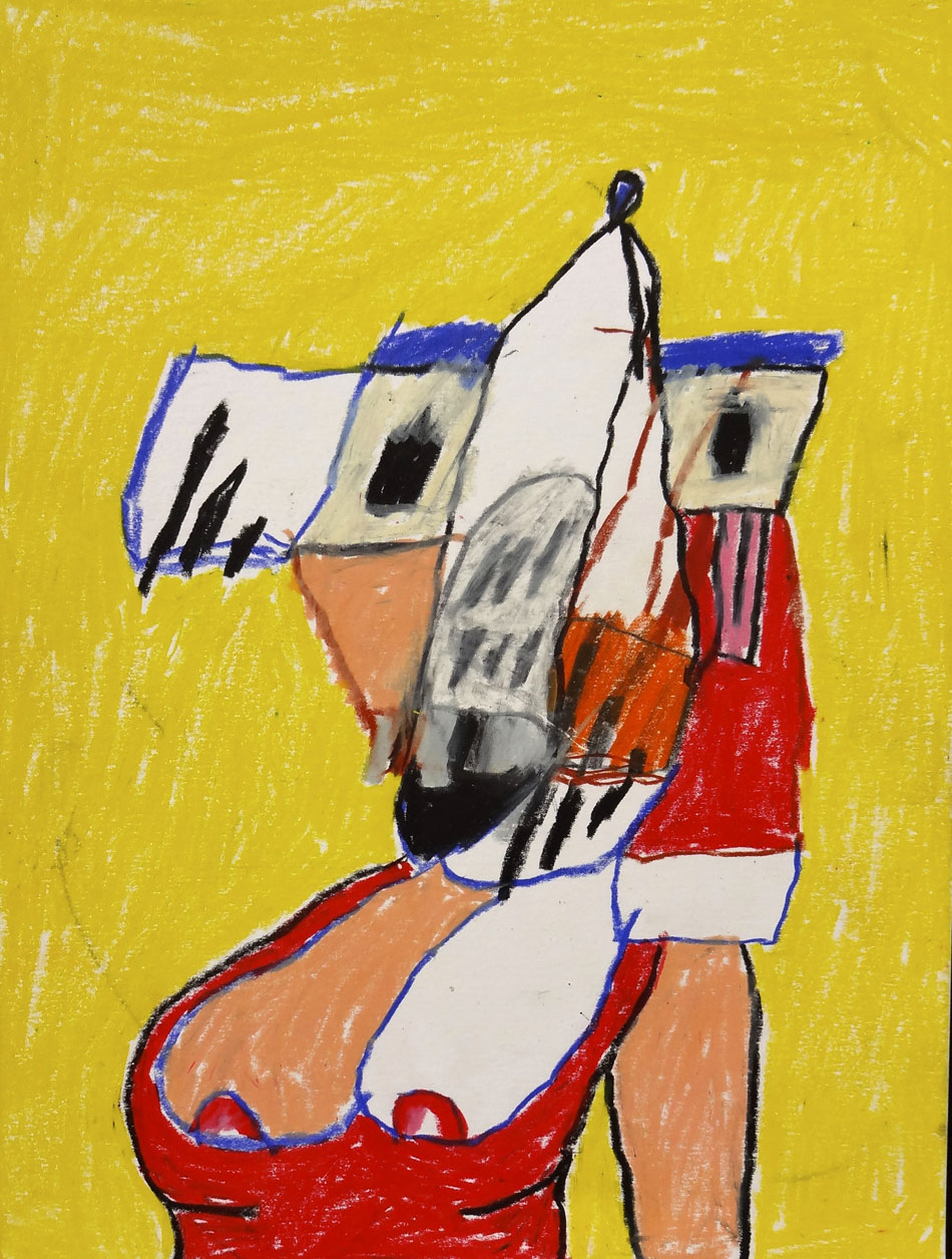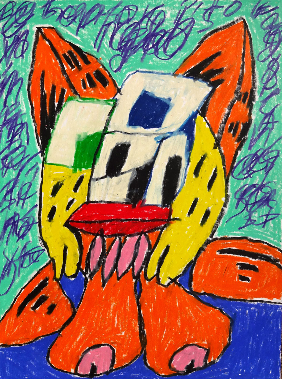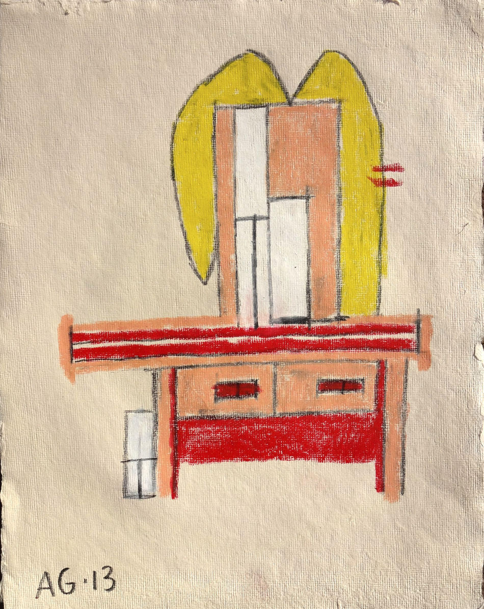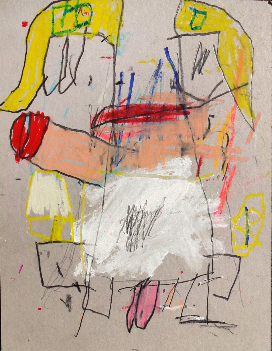 Bordering on architecture or furniture design, the works are only recognizable as female as each has at least one boob; though most have way, way too many boobs. The majority of the works in the show are a mere 12 x 9 inches, but capture in their small size the irreverence and urgency that comes from a direct link between the hand and the unconscious: and as we can see in the show, Green’s unconscious has a somewhat 8-bit sensibility. The bodies are often composed of proliferating blocks, with some including too many eye blocks, too many aforementioned boob blocks, too many mouth blocks, etc. It is as though the image inventory chip to his Nintendo cartridge was functioning properly, however the programming chip that assorted, organized and placed the blocks was malfunctioning.
