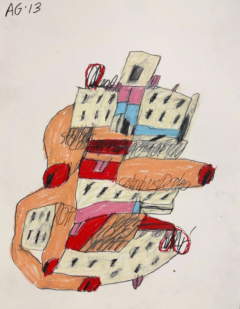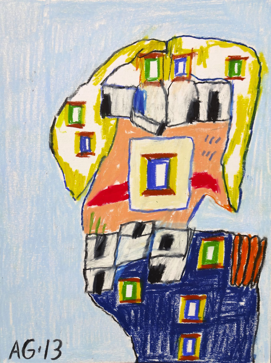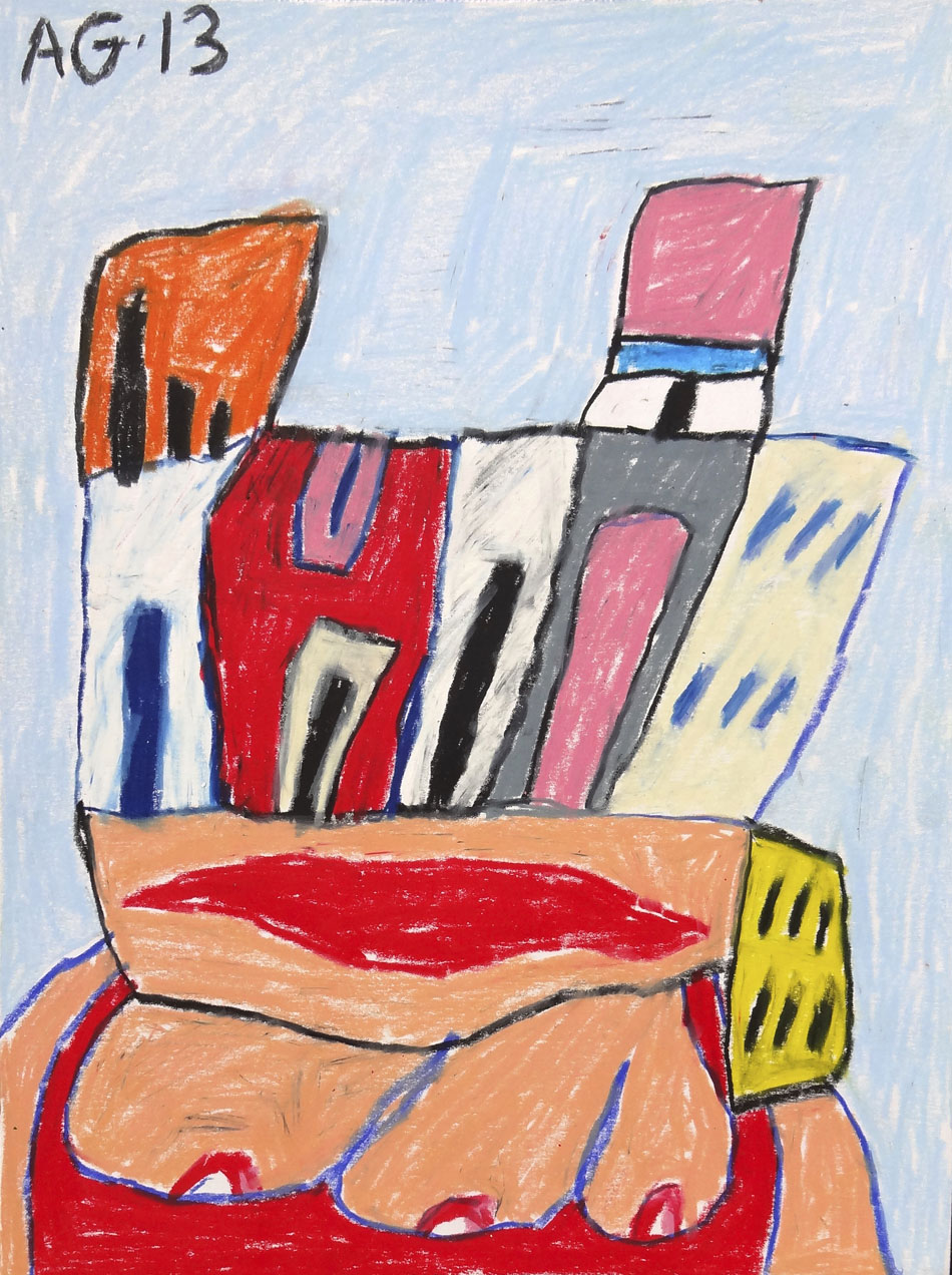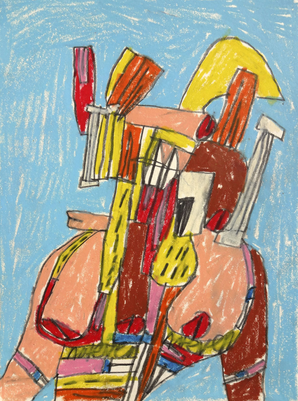 Bordering on architecture or furniture design, the works are only recognizable as female as each has at least one boob; though most have way, way too many boobs. The majority of the works in the show are a mere 12 x 9 inches, but capture in their small size the irreverence and urgency that comes from a direct link between the hand and the unconscious: and as we can see in the show, Green’s unconscious has a somewhat 8-bit sensibility. The bodies are often composed of proliferating blocks, with some including too many eye blocks, too many aforementioned boob blocks, too many mouth blocks, etc. It is as though the image inventory chip to his Nintendo cartridge was functioning properly, however the programming chip that assorted, organized and placed the blocks was malfunctioning.