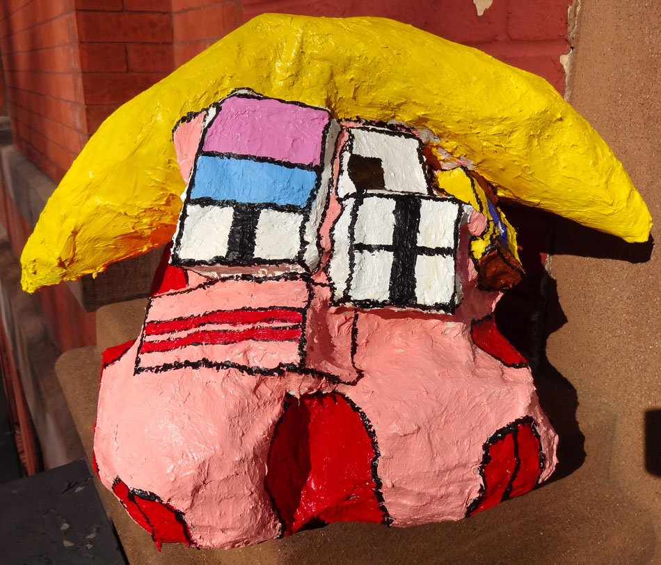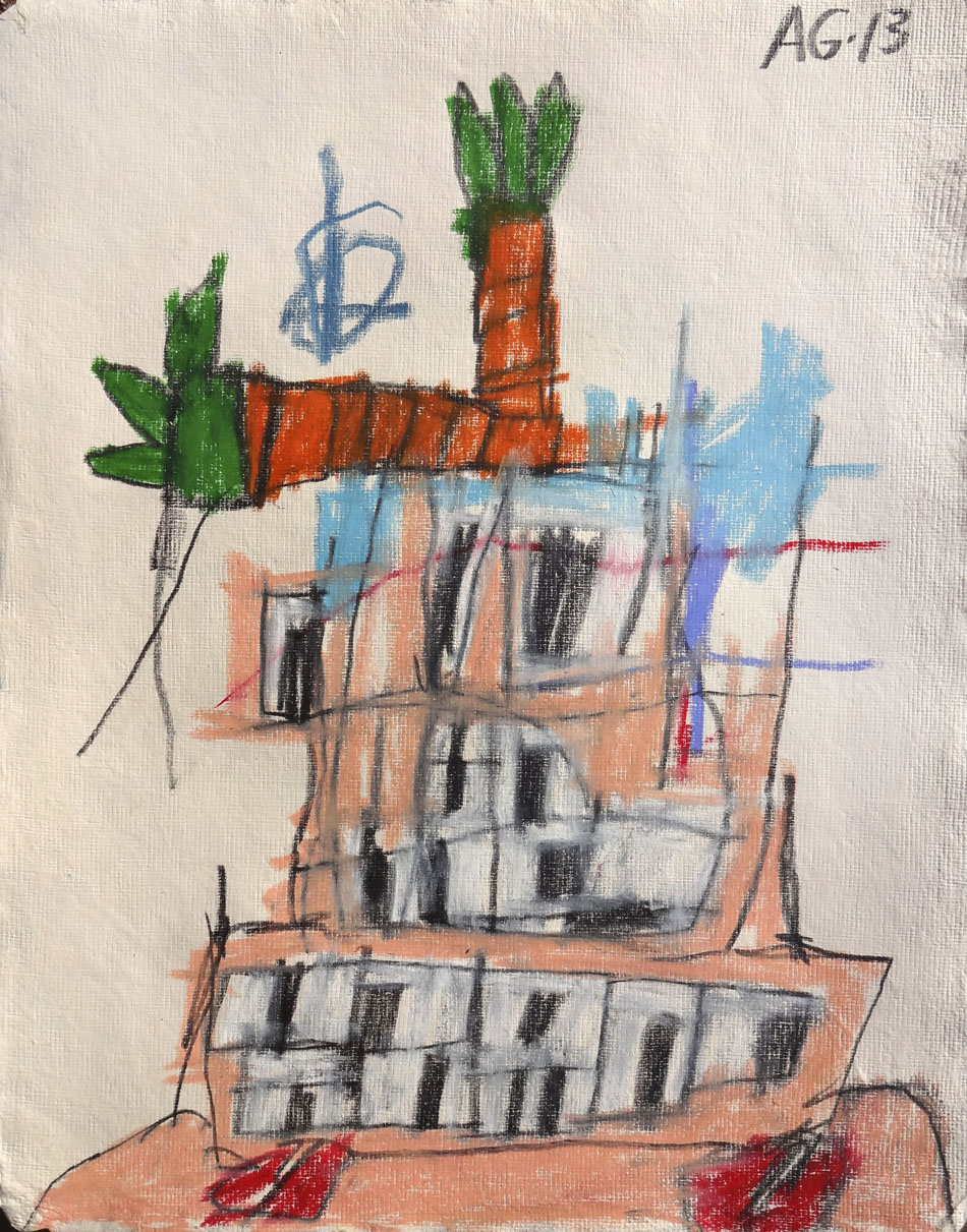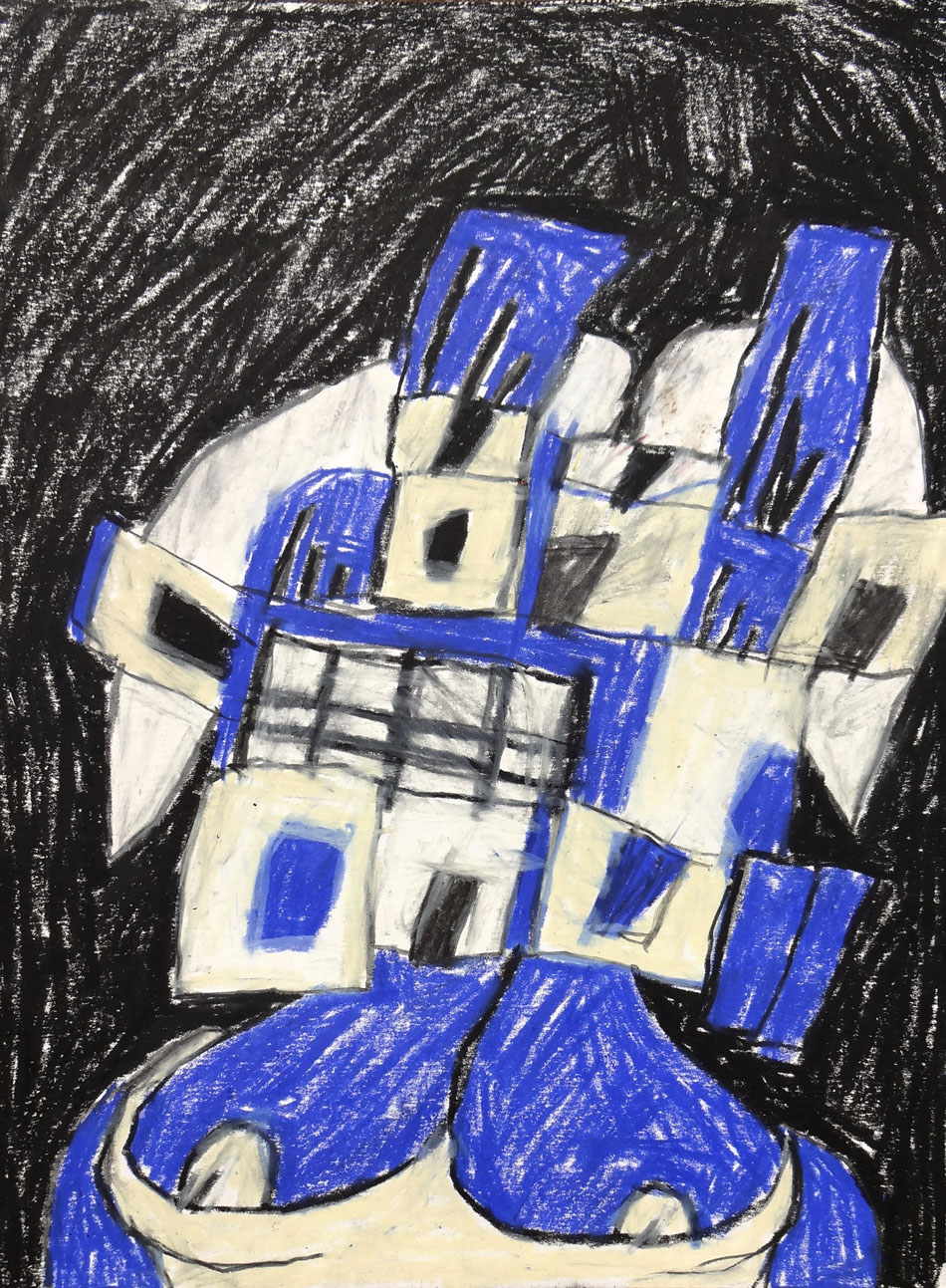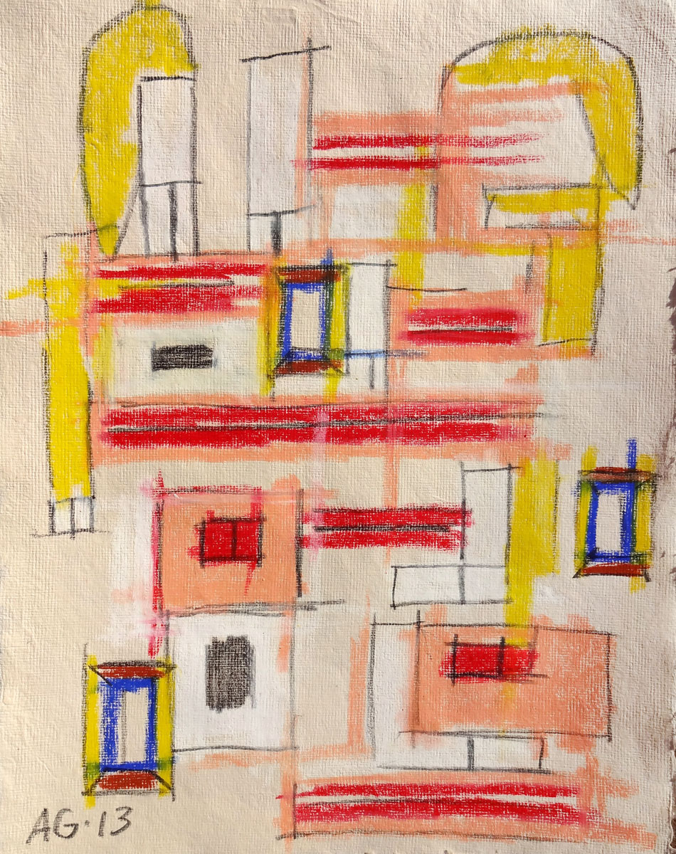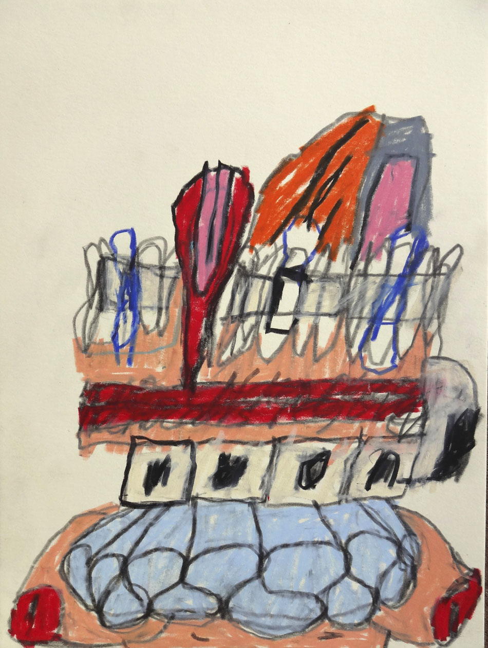 Bordering on architecture or furniture design, the works are only recognizable as female as each has at least one boob; though most have way, way too many boobs. The majority of the works in the show are a mere 12 x 9 inches, but capture in their small size the irreverence and urgency that comes from a direct link between the hand and the unconscious: and as we can see in the show, Green’s unconscious has a somewhat 8-bit sensibility. The bodies are often composed of proliferating blocks, with some including too many eye blocks, too many aforementioned boob blocks, too many mouth blocks, etc. It is as though the image inventory chip to his Nintendo cartridge was functioning properly, however the programming chip that assorted, organized and placed the blocks was malfunctioning.