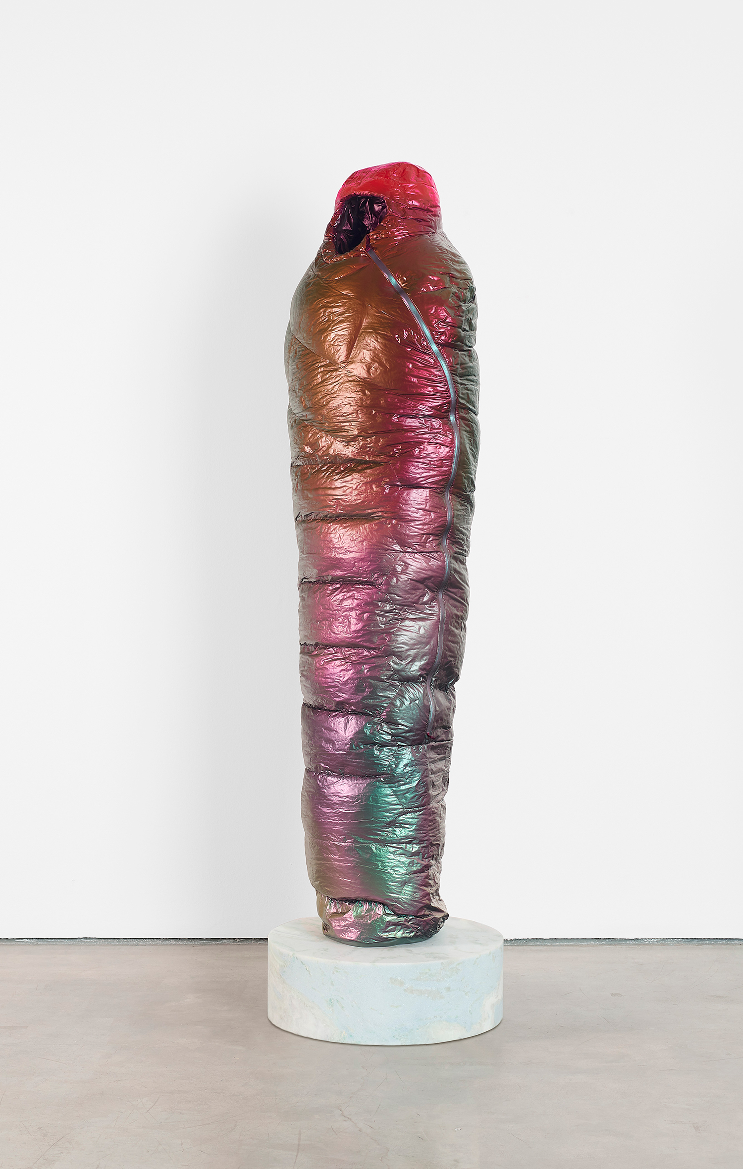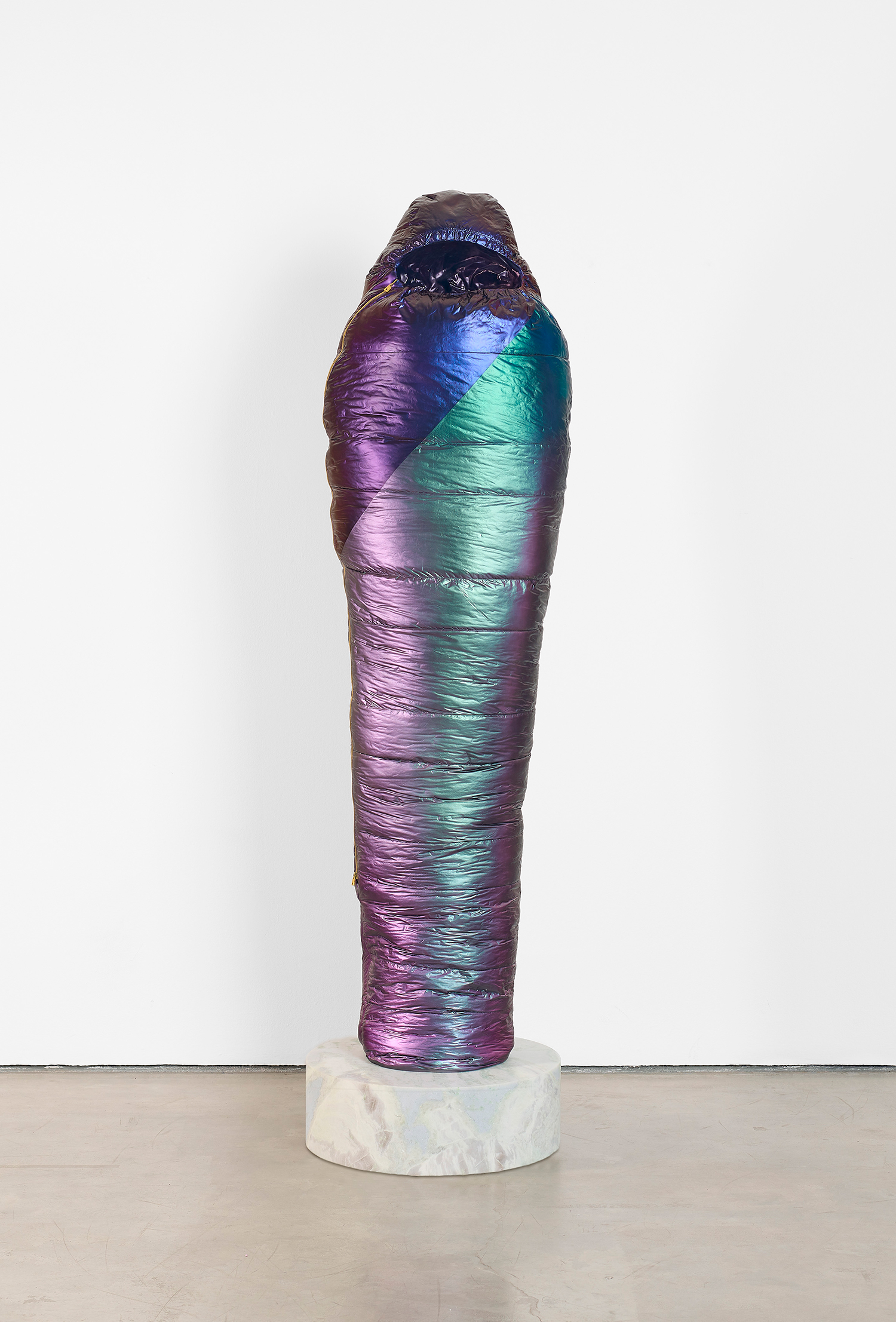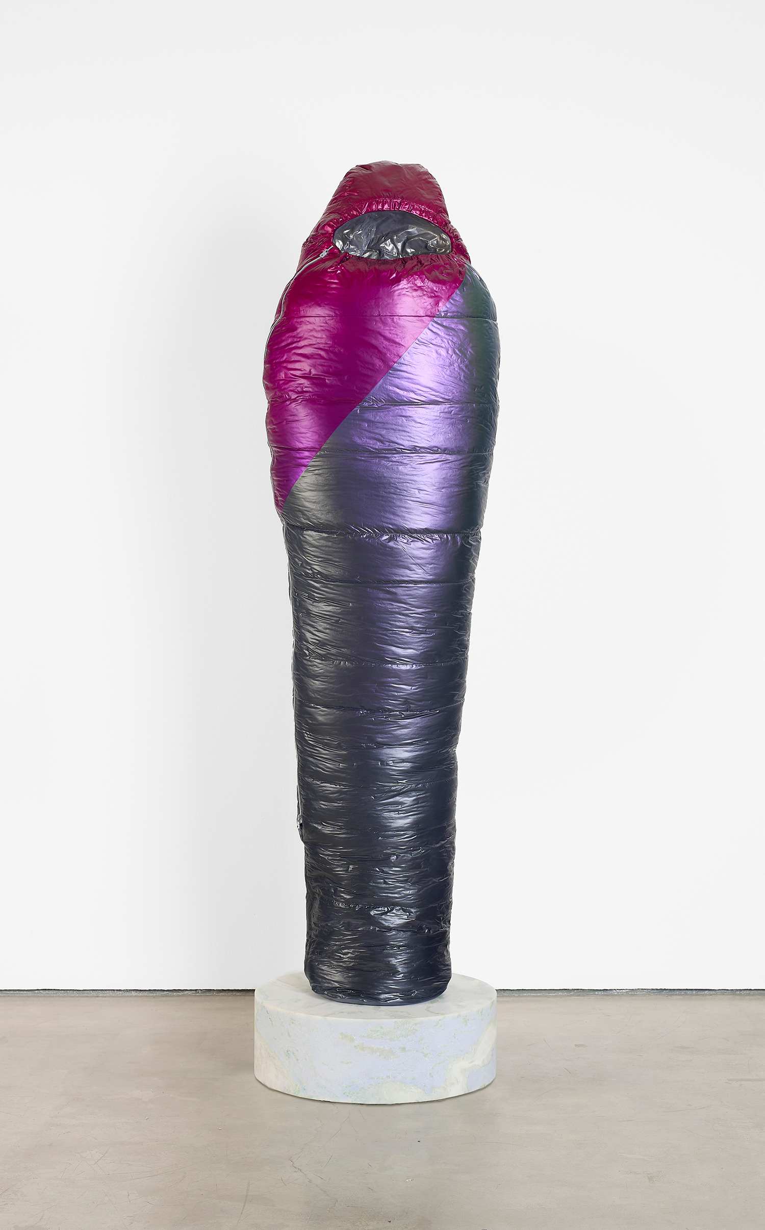 Standing upright on marble plinths, Adam Parker Smith’s “Sarcophagi” are pointedly recognizable in their resemblance to sub-zero sleeping bags. In resin, steel, and urethane, Smith fashions familiar objects, made to appear both inflated and dispensable. His sculptures, in the manner of Readymades, are instantly accessible and quietly satiric, at first glance even seeming to celebrate modern mass production as its own monolithic, deracinated culture. As with Duchamp, the deception of Smith’s unruly objects becomes more apparent the longer one contemplates them.