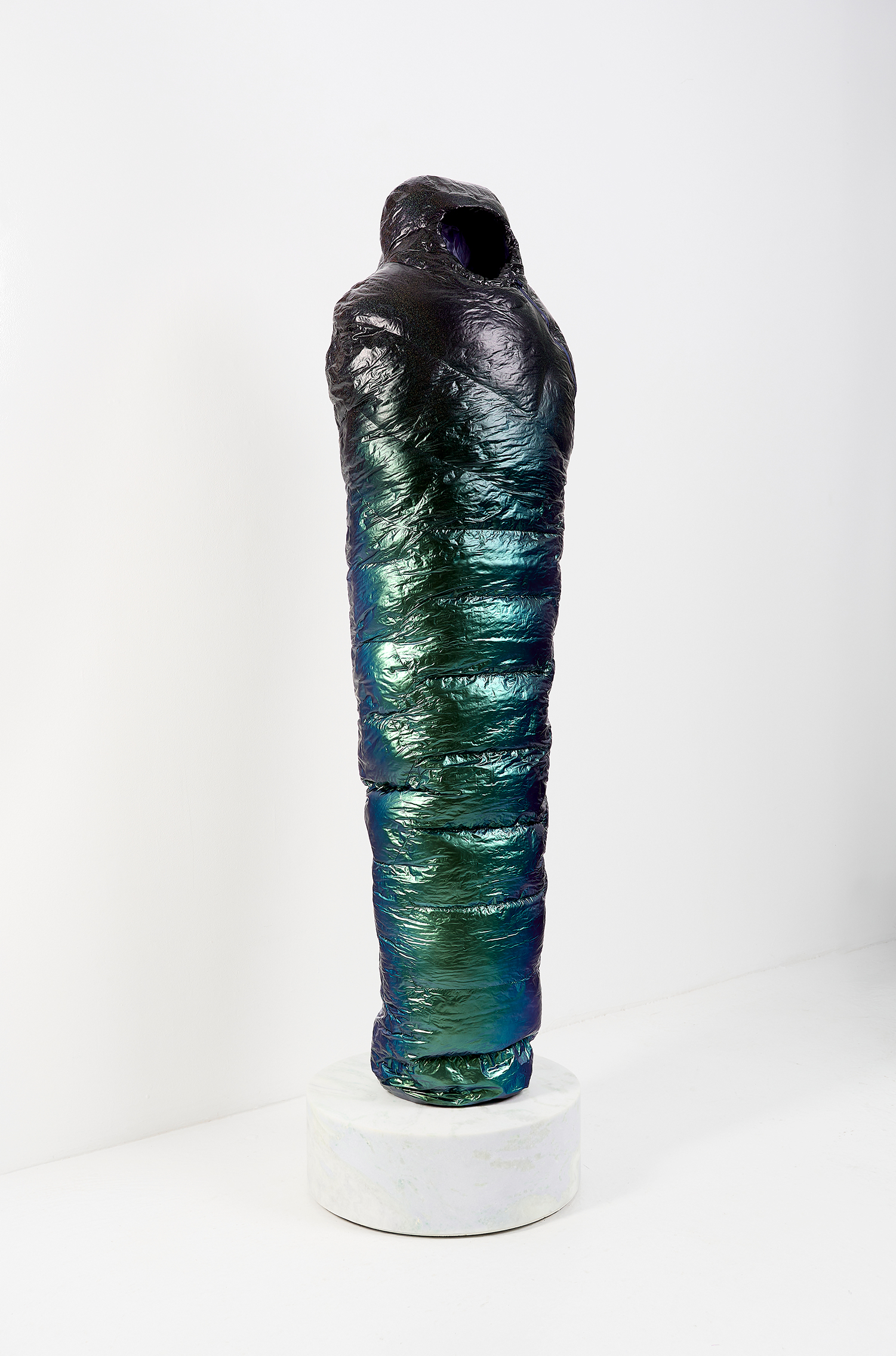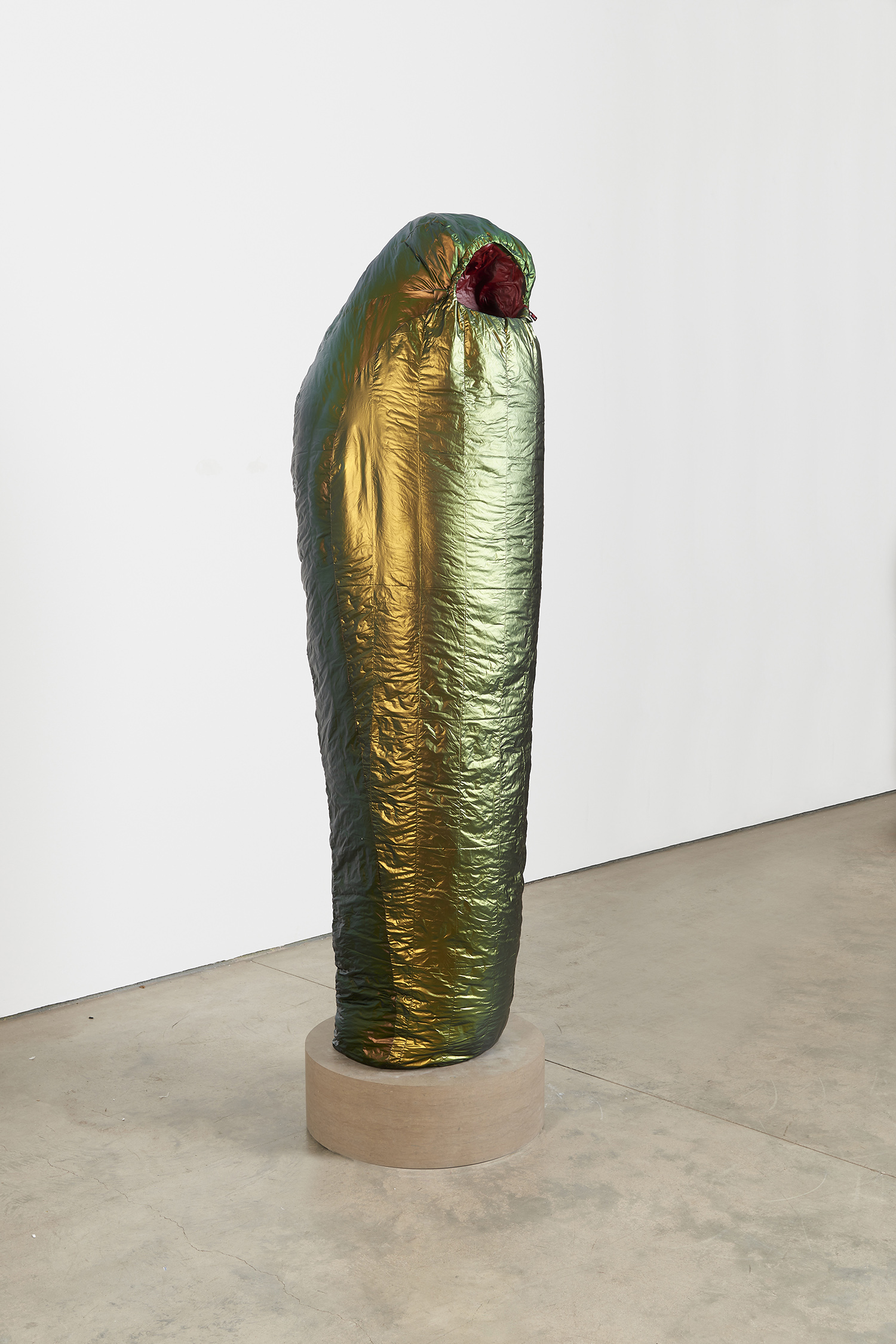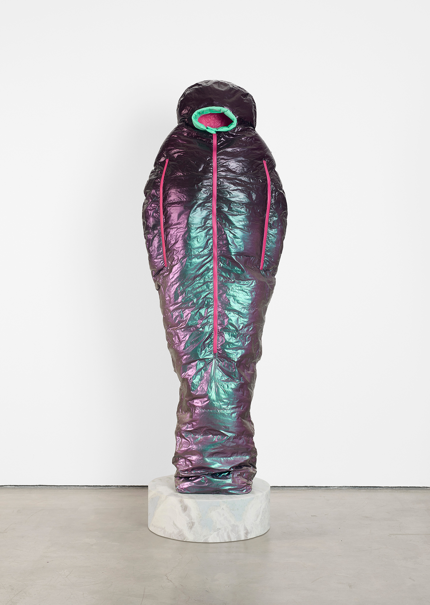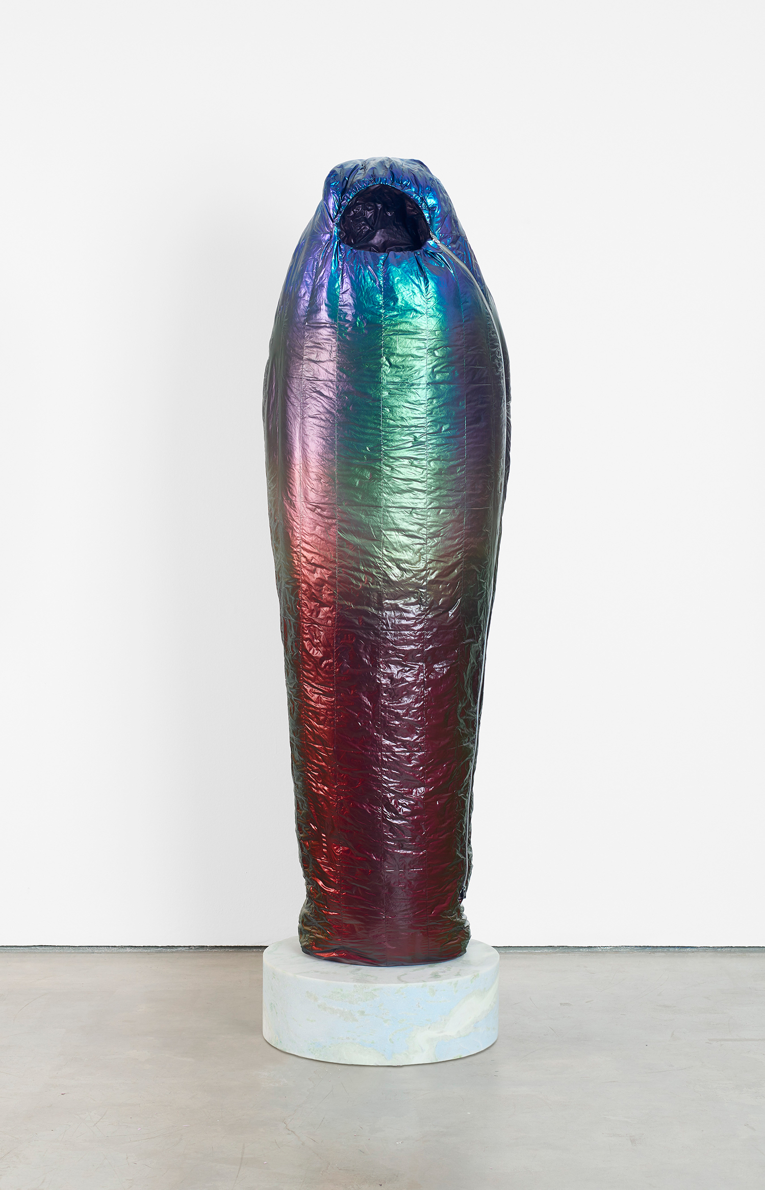 Standing upright on marble plinths, Adam Parker Smith’s “Sarcophagi” are pointedly recognizable in their resemblance to sub-zero sleeping bags. In resin, steel, and urethane, Smith fashions familiar objects, made to appear both inflated and dispensable. His sculptures, in the manner of Readymades, are instantly accessible and quietly satiric, at first glance even seeming to celebrate modern mass production as its own monolithic, deracinated culture. As with Duchamp, the deception of Smith’s unruly objects becomes more apparent the longer one contemplates them.