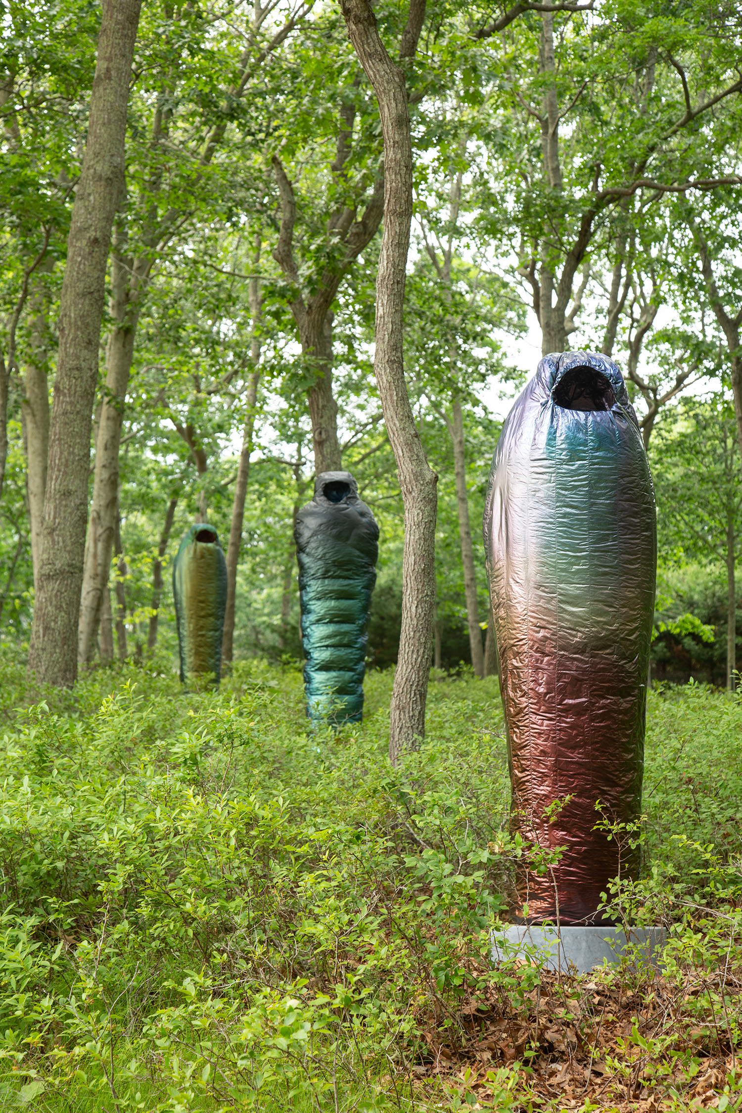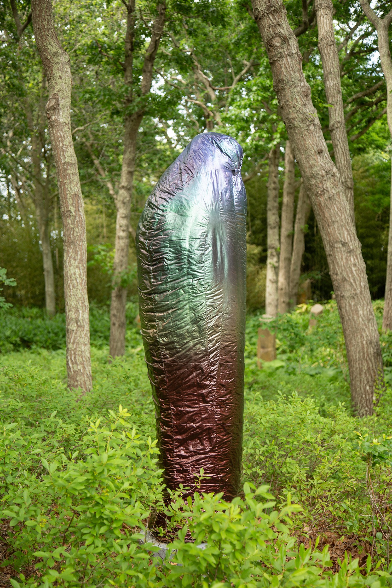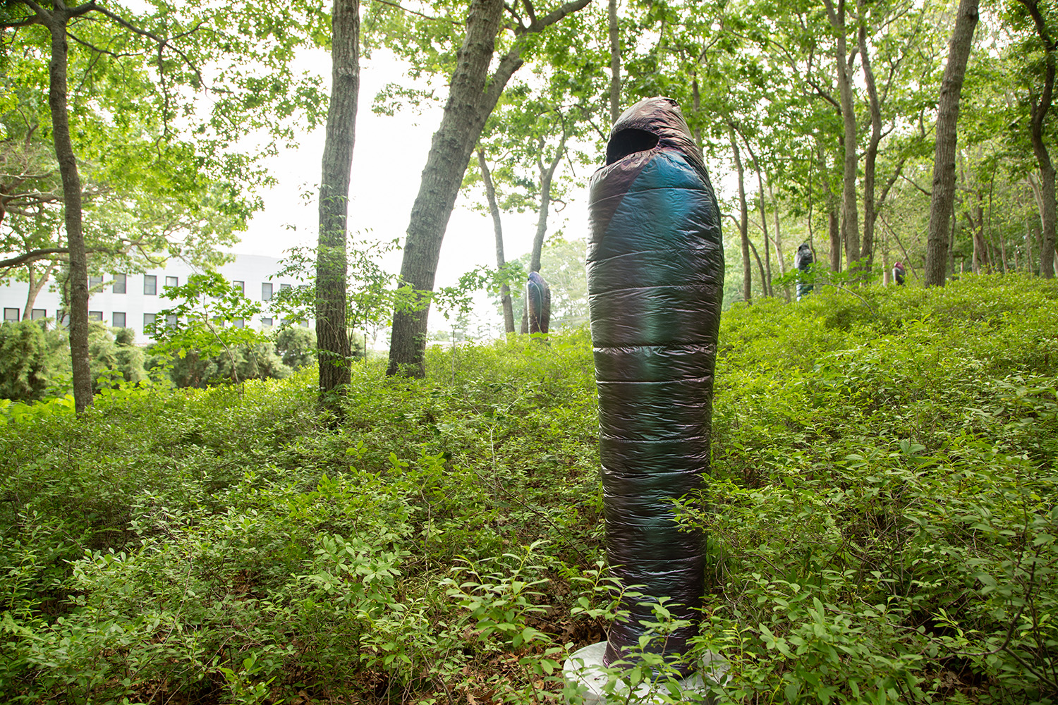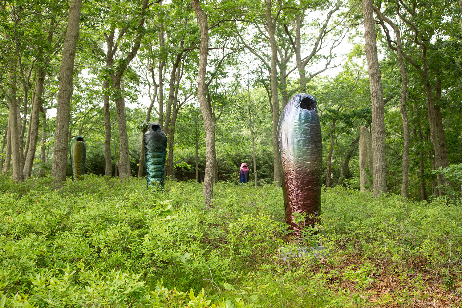 Crafted over the past year in response to tremendous global loss, Smith’s “Sarcophagi” are symbolic gestures of lamentation at a time when public commemorations of death are conspicuously absent. In name, shape, and tonality, they harken back to a time of elaborate burial rites, where embalming and entombing a body in stone could preserve it for millennia. As a pointed contrast, Adam considers the synthetic materials of today’s objects—such as mylar balloons, pool floats, and the polyester down of sleeping bags—which will inevitably outlast any individual experience, and even societal lifetimes, as these objects scatter indiscriminately through landfills across the globe.