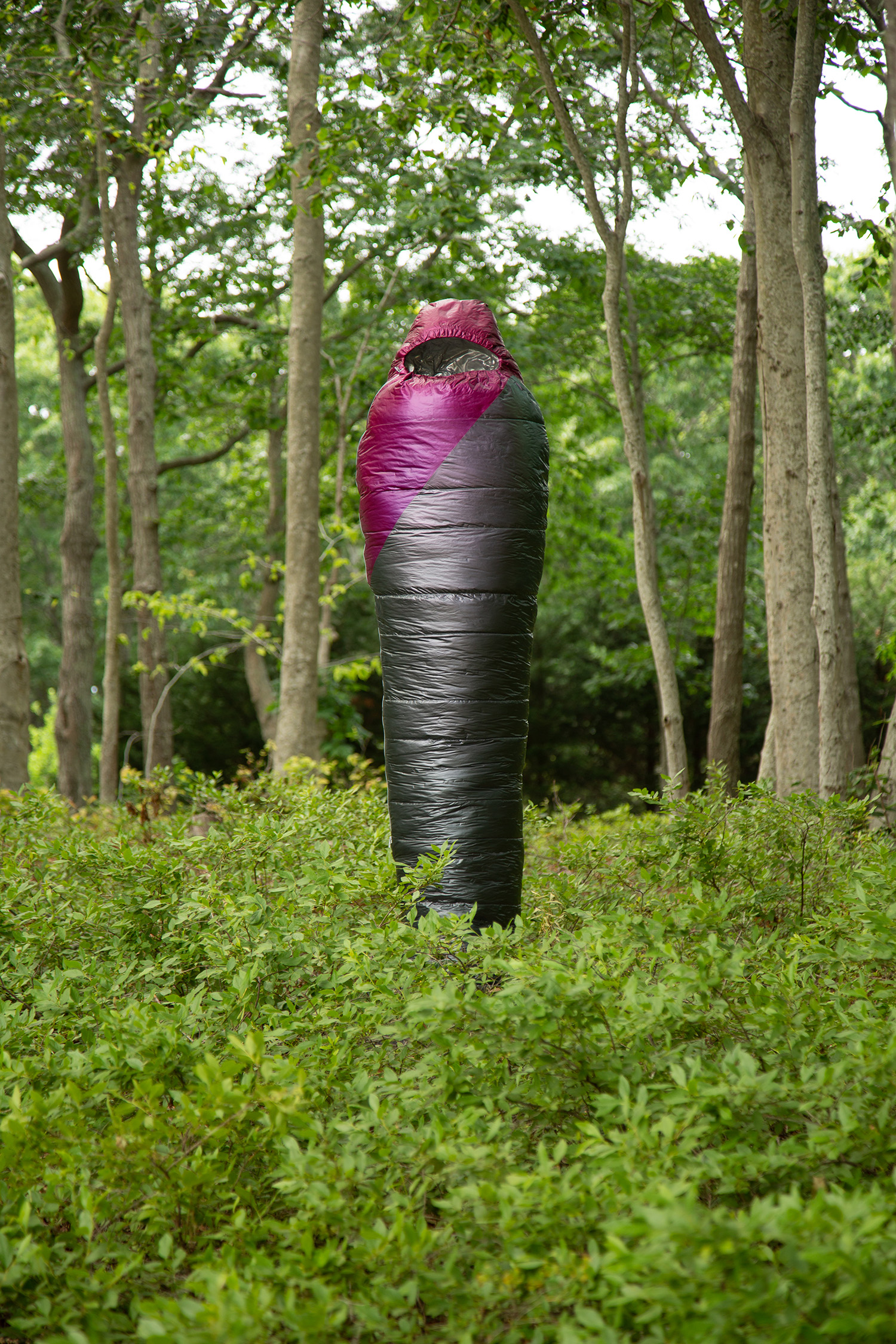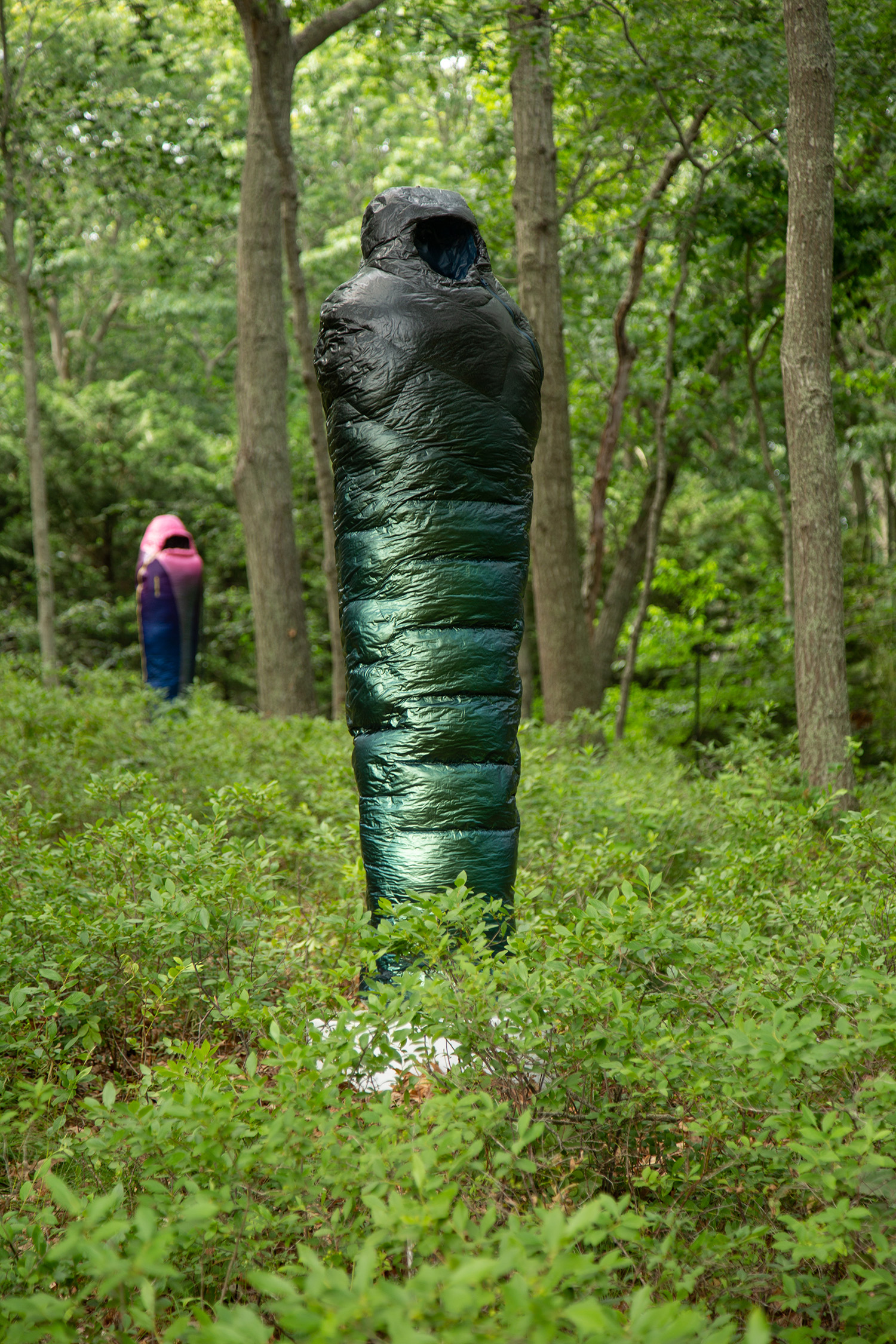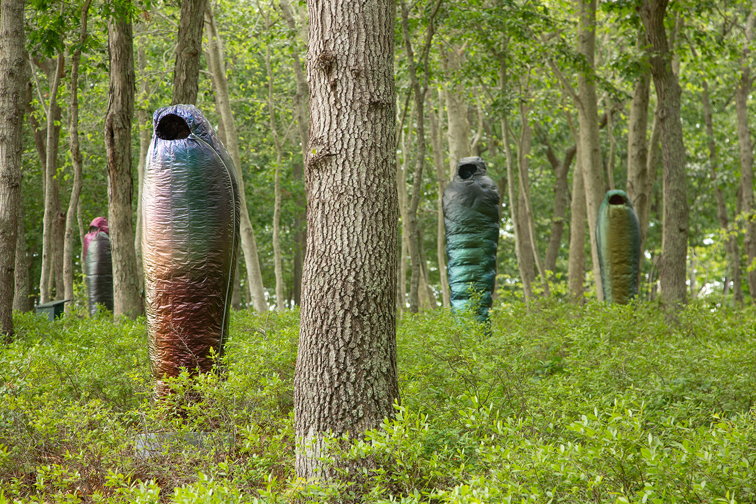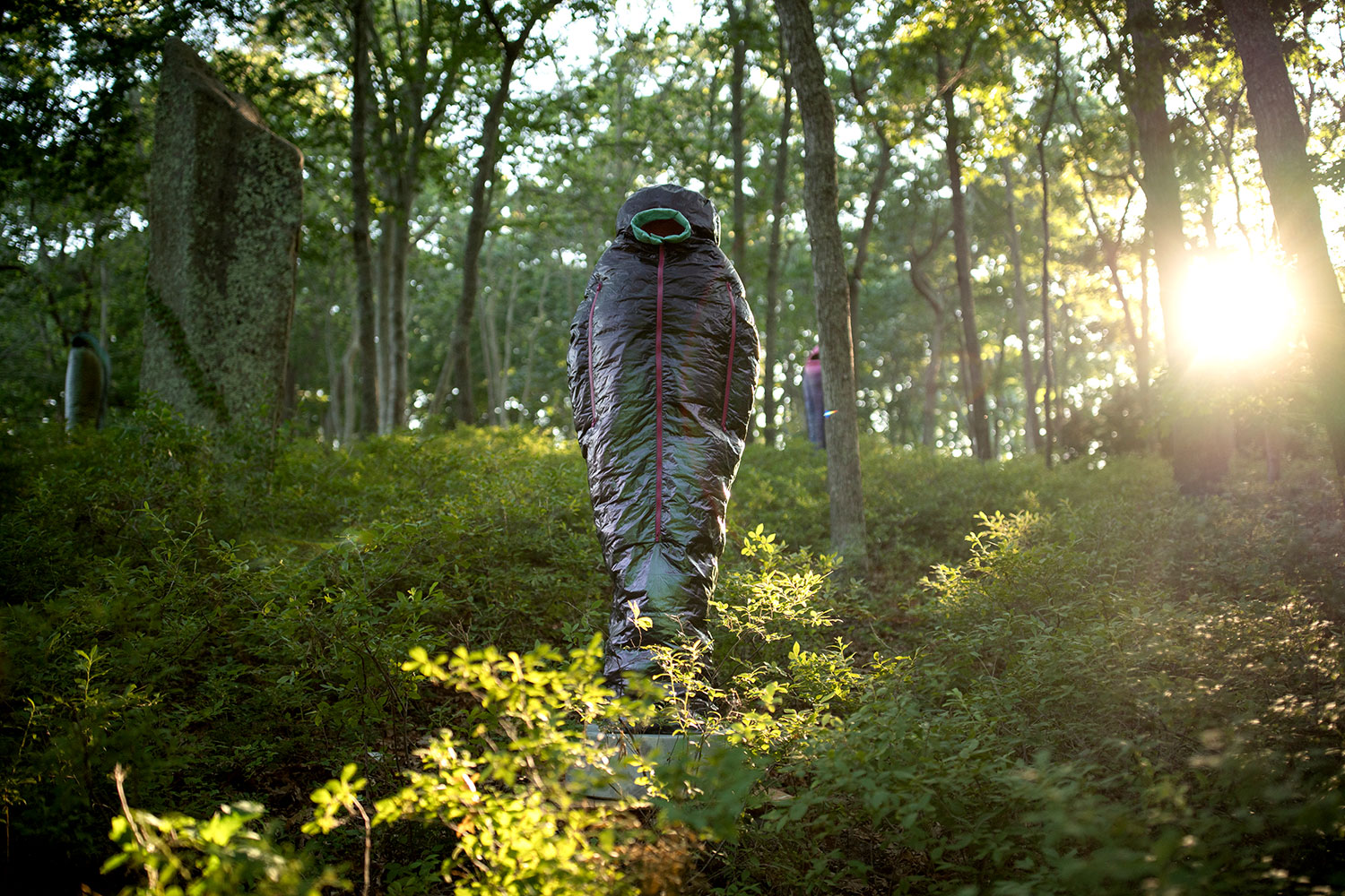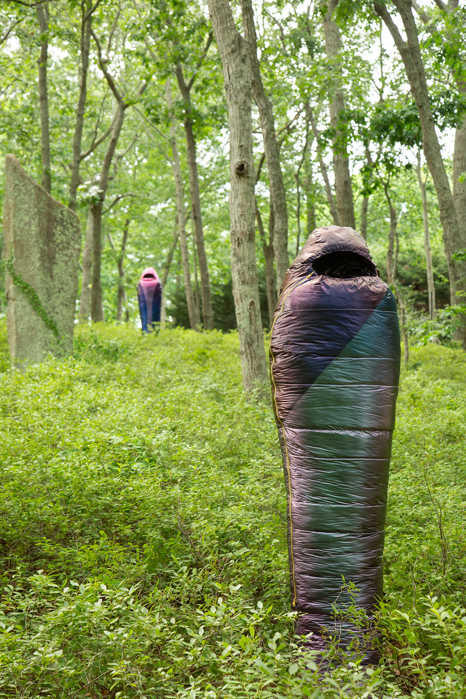 Crafted over the past year in response to tremendous global loss, Smith’s “Sarcophagi” are symbolic gestures of lamentation at a time when public commemorations of death are conspicuously absent. In name, shape, and tonality, they harken back to a time of elaborate burial rites, where embalming and entombing a body in stone could preserve it for millennia. As a pointed contrast, Adam considers the synthetic materials of today’s objects—such as mylar balloons, pool floats, and the polyester down of sleeping bags—which will inevitably outlast any individual experience, and even societal lifetimes, as these objects scatter indiscriminately through landfills across the globe.