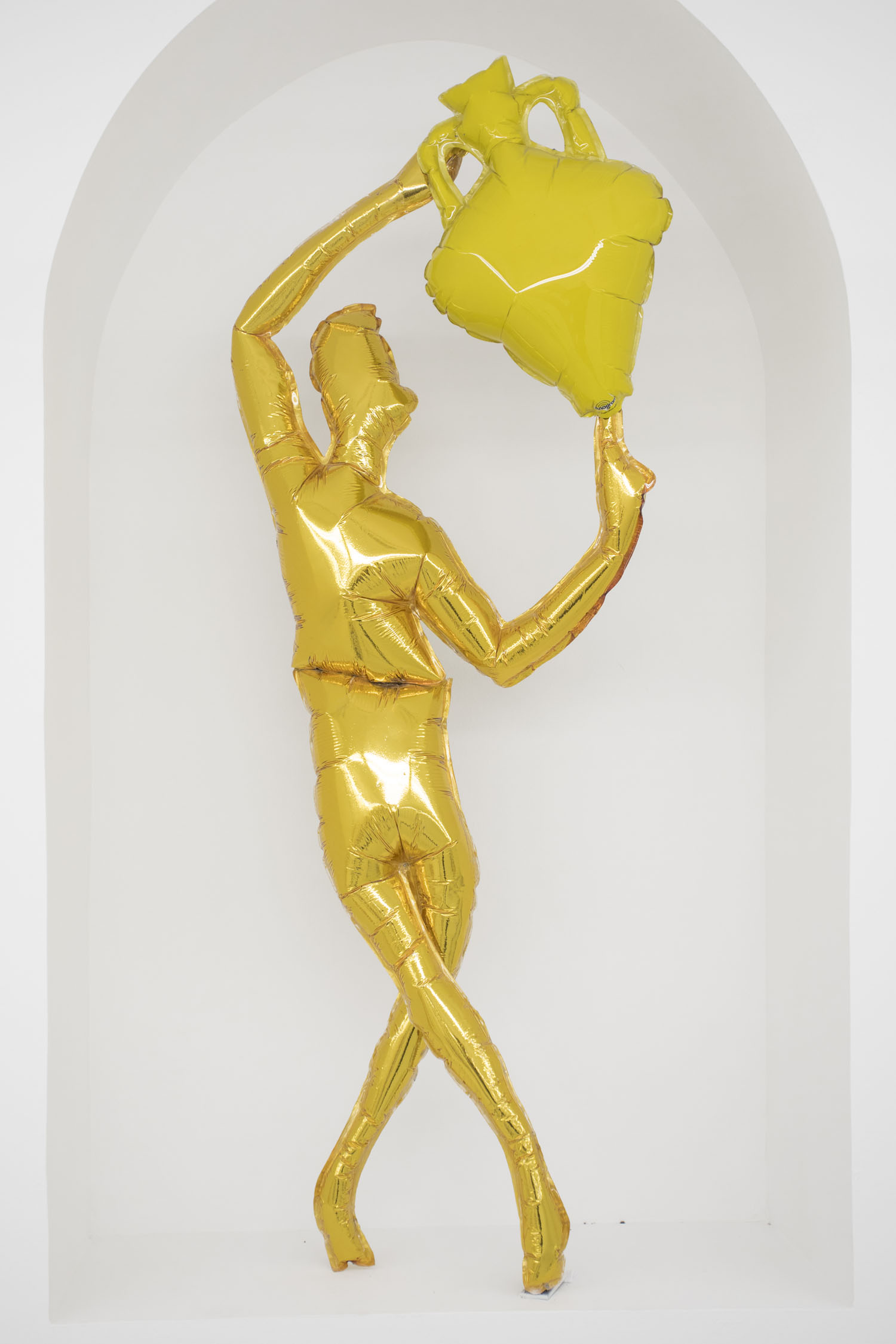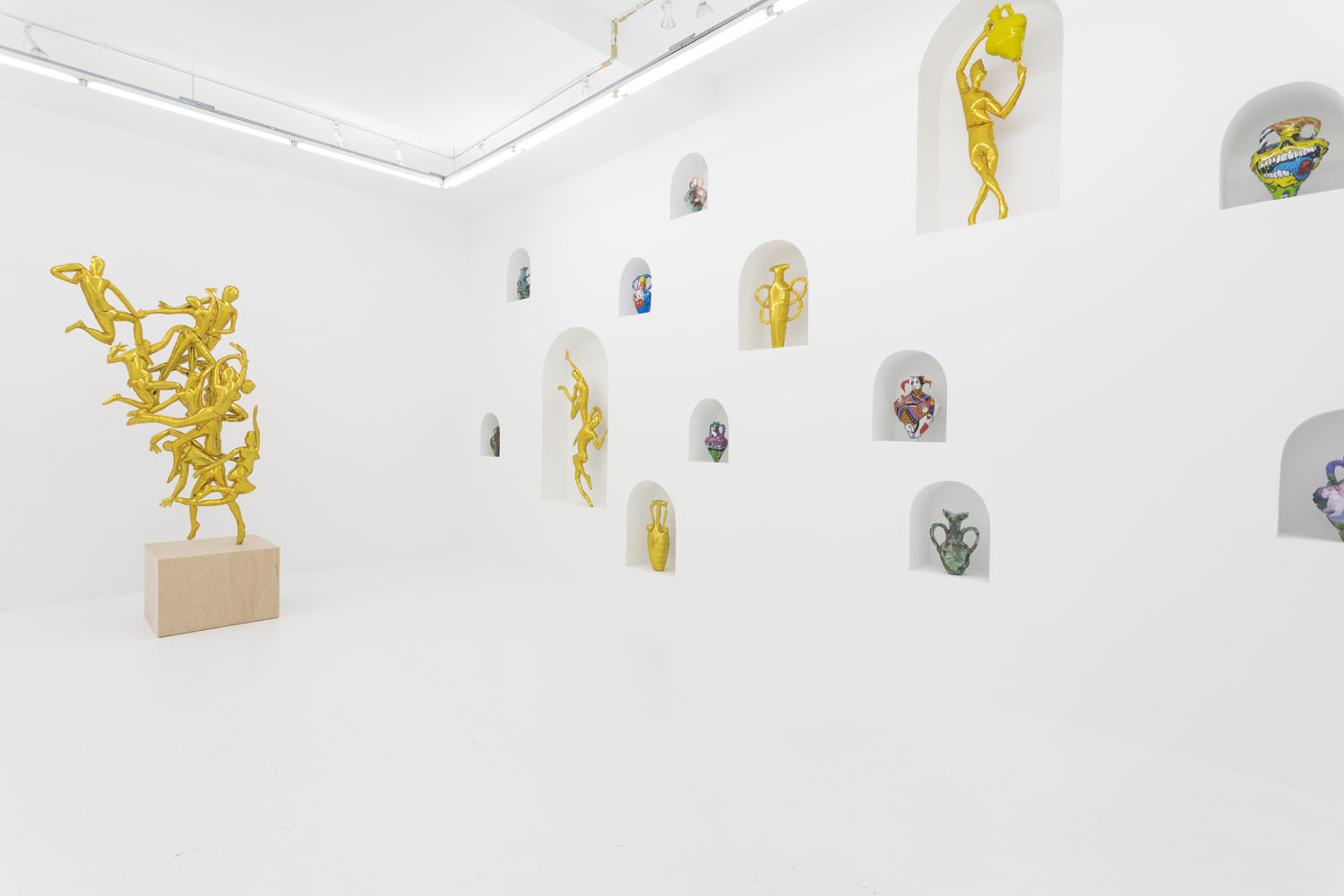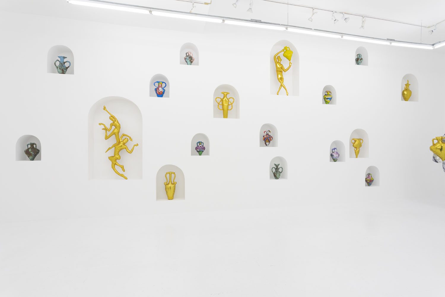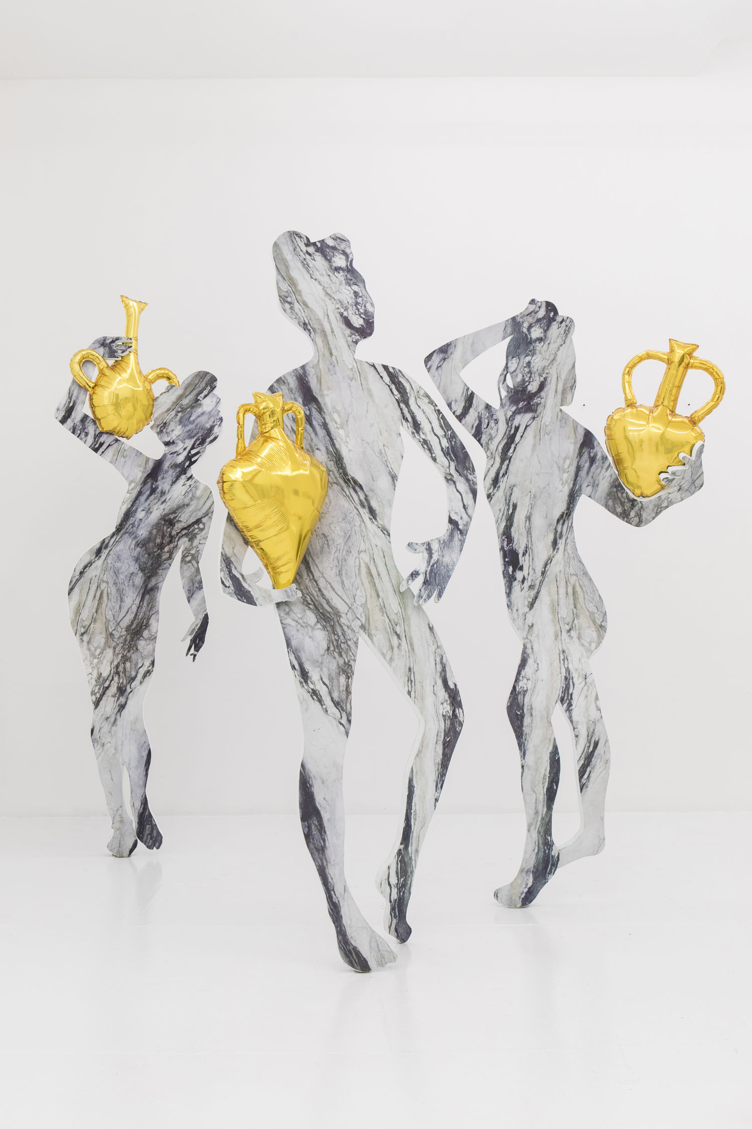 In the first room of the exhibition, groupings of customized mylar balloon shapes are remixed into Spartan warriors, Odysseus, Prometheus or other Greek tropes. Fifteen Greek vases fill an alcoved wall of the rear gallery, many of which are faux-bronzed to look recently unearthed from some sort of dig. Equal parts Met Museum and 99cent store, this display of baffling objects in a stylized presentation collapses centuries of sensibility. In the above piece, EVA foam is printed in faux-marble, fake bronzed on the back and then shaped into three undulating female figures holding vases. Is it a playful allusion to the impermanence of Classical materials and the oft-idealized historical representations of the female body, or is it a bizarre new sales approach at the vase store?