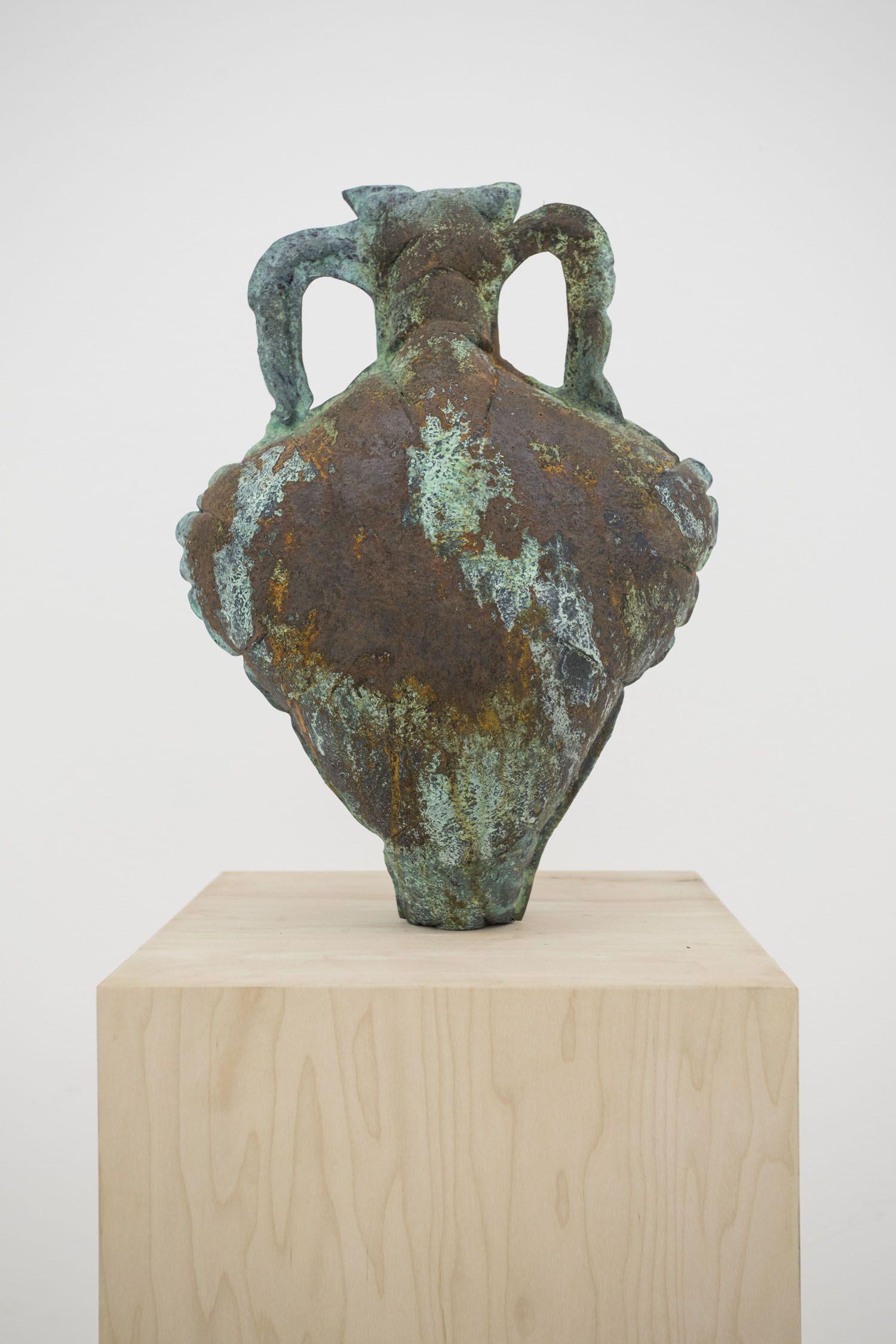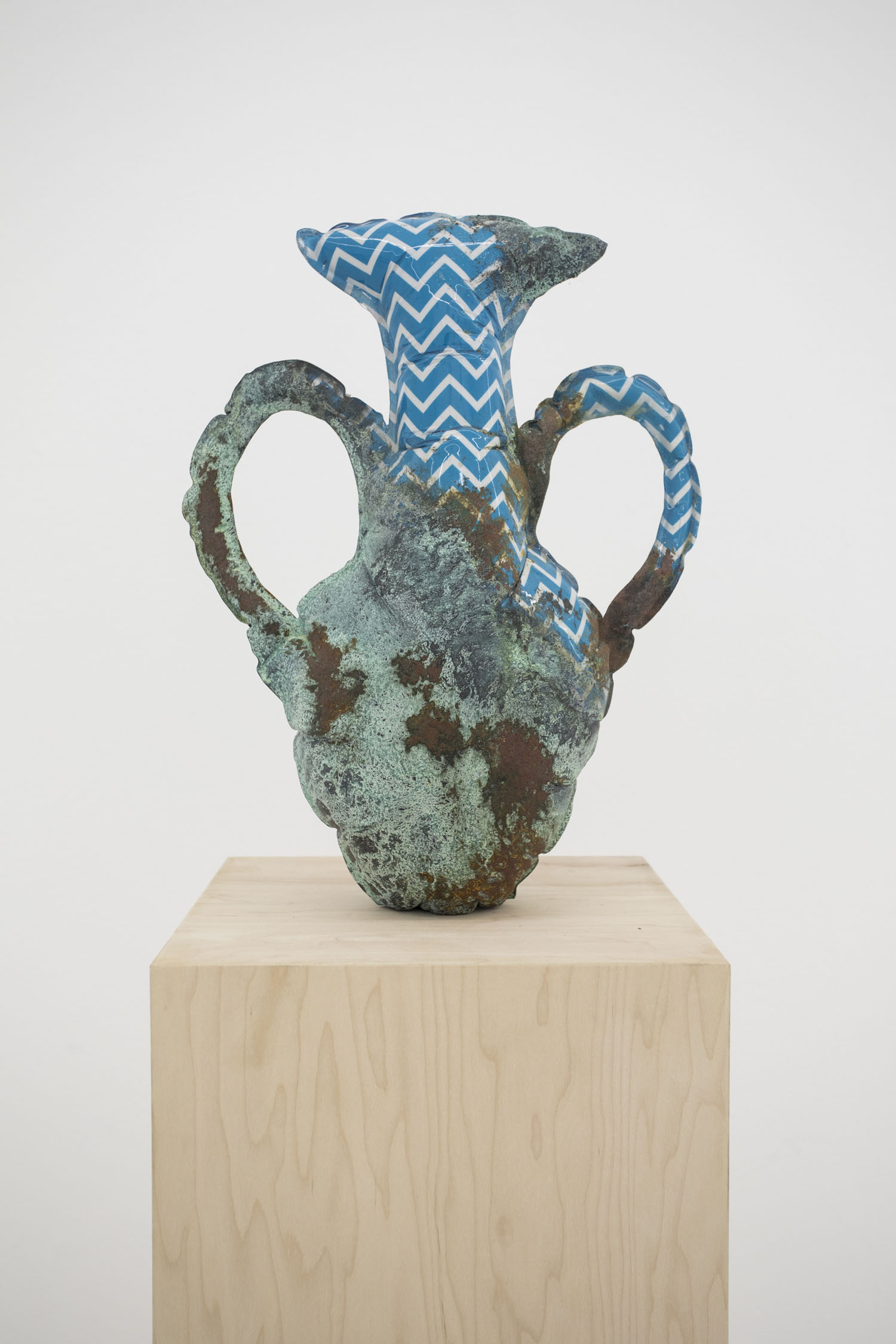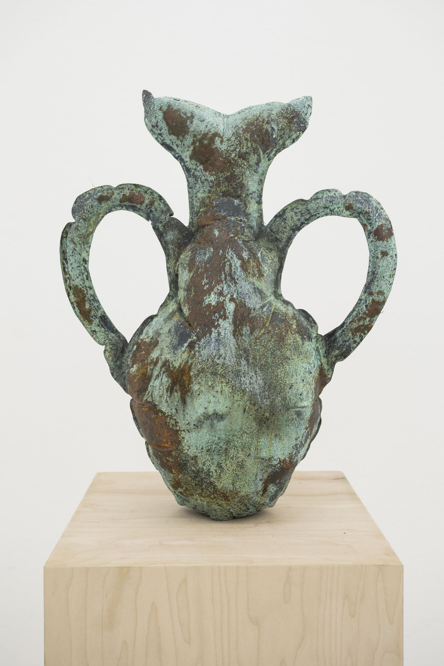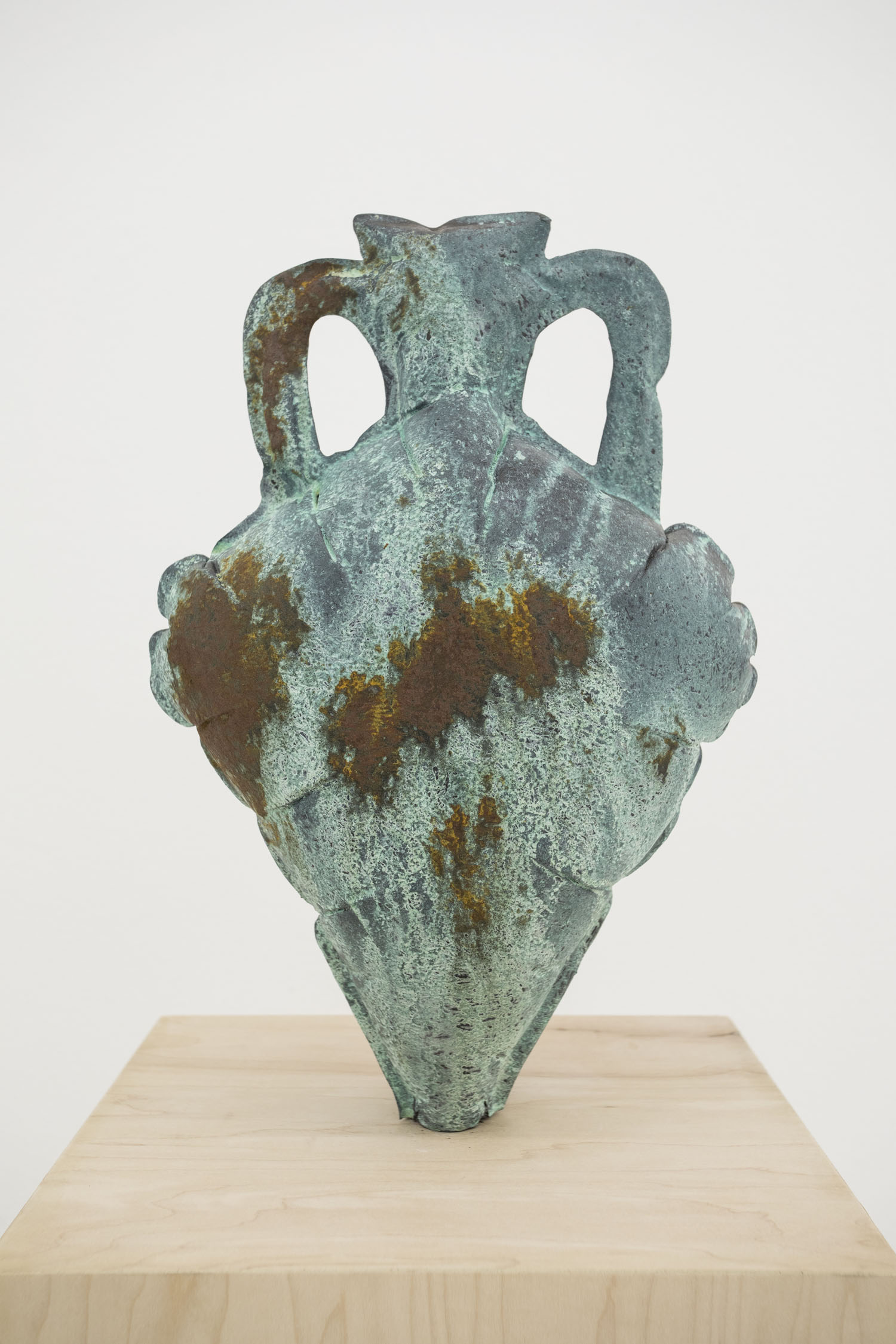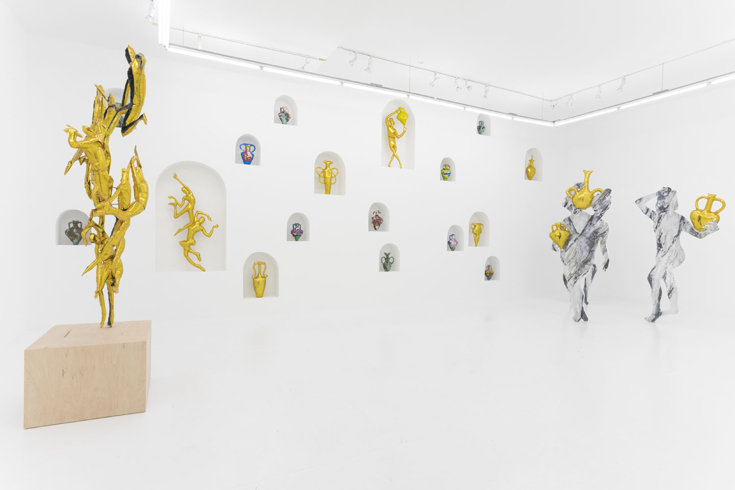 In the first room of the exhibition, groupings of customized mylar balloon shapes are remixed into Spartan warriors, Odysseus, Prometheus or other Greek tropes. Fifteen Greek vases fill an alcoved wall of the rear gallery, many of which are faux-bronzed to look recently unearthed from some sort of dig. Equal parts Met Museum and 99cent store, this display of baffling objects in a stylized presentation collapses centuries of sensibility. In the above piece, EVA foam is printed in faux-marble, fake bronzed on the back and then shaped into three undulating female figures holding vases. Is it a playful allusion to the impermanence of Classical materials and the oft-idealized historical representations of the female body, or is it a bizarre new sales approach at the vase store?