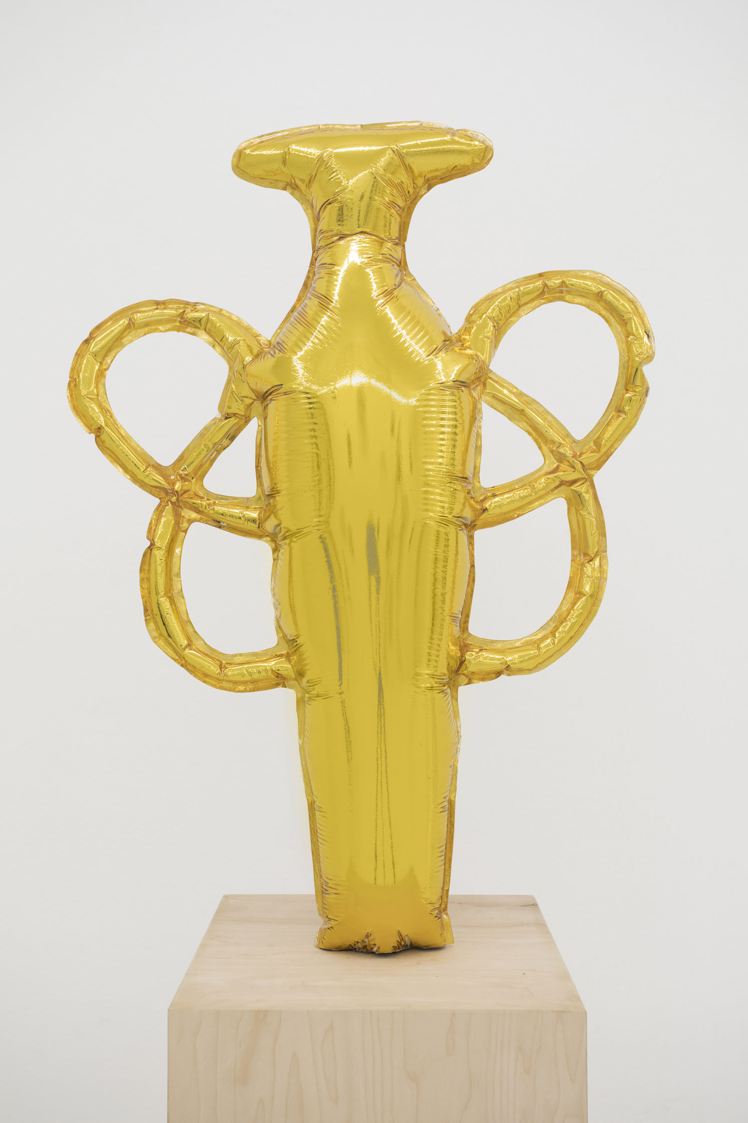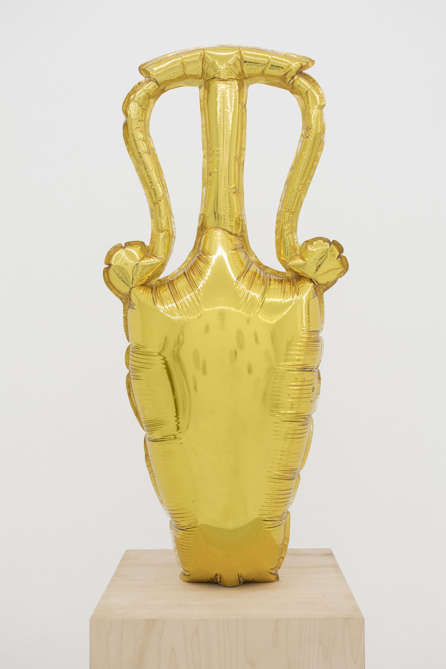 The exhibition title is a cheeky six-word paraphrase of The Iliad introducing us both to the classical theme and the conceptual artist’s distinctive sense of humor. Using this ancient text as a thematic structure, Parker Smith explores formal concerns such as gesture and movement through the enigmatic transformation of material. While his first exhibition at The Hole featured store-bought balloons recontextualized, in this exhibition Parker Smith creates his own custom-made balloon shapes by cutting out mylar sheets himself. Lining the material with fiberglass and applying multiple coats of resin, he utilizes a one-way air valve to articulate the form of the sculptures, building them up to create human and vase-like shapes that reference Classical statuary.