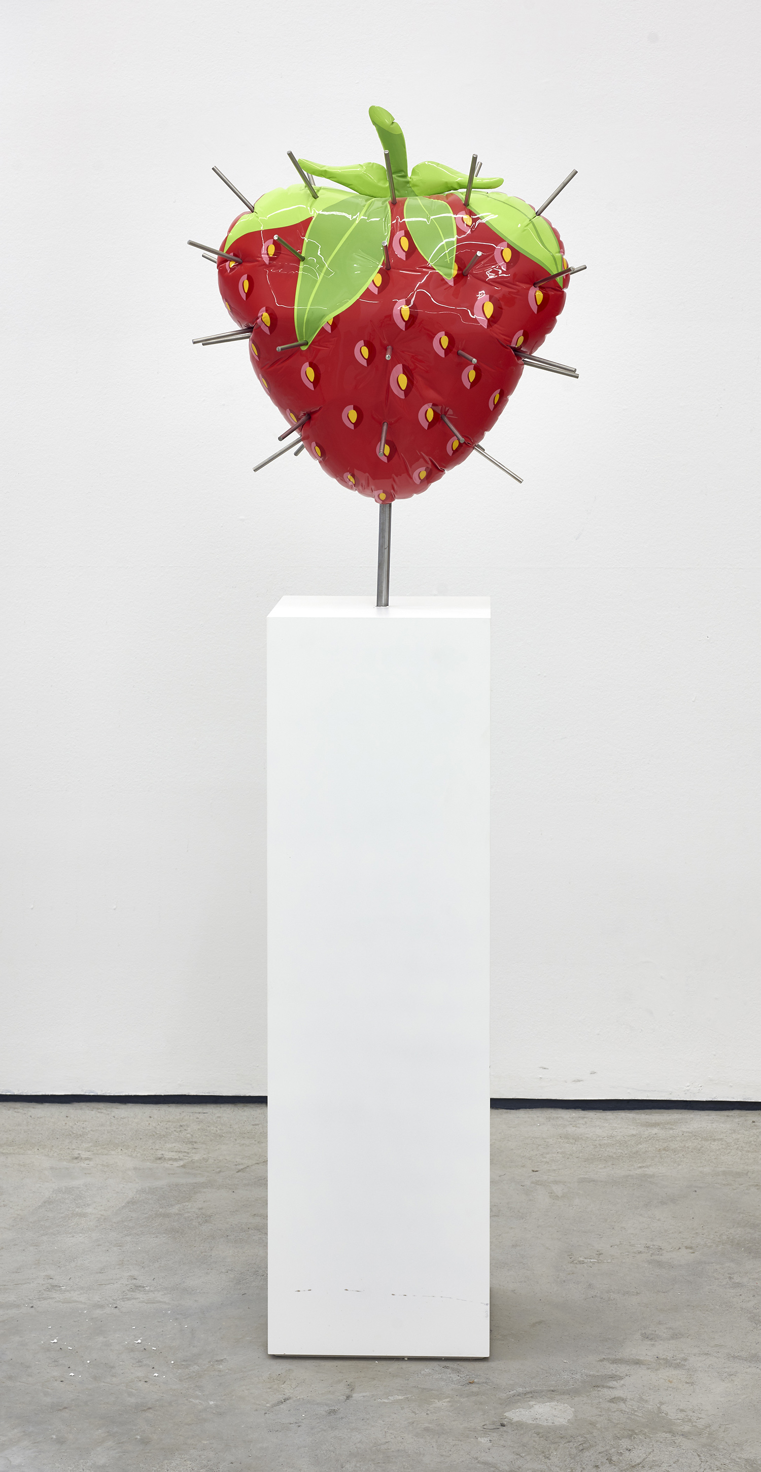 Fearlessly the Idiot Faces the Crowd features a pink dolphin stuck halfway through a hole in a cinderblock tower, grinning blankly from this precarious and embarrassing position. Plank Piece III plays with Charles Ray’s famous work from 1973 with, here, a cactus ballon curiously propped up against the wall by a plank of wood. Thinking of You remixes the work of Jose Davila crushing a saccharine Thinking of You get well soon balloon between two giant blocks of Carrara marble. A bust of Hercules, a Hellraiser strawberry, a Shibari-wrapped giant broccoli; these are some of the celebrations the artist has prepared for us.