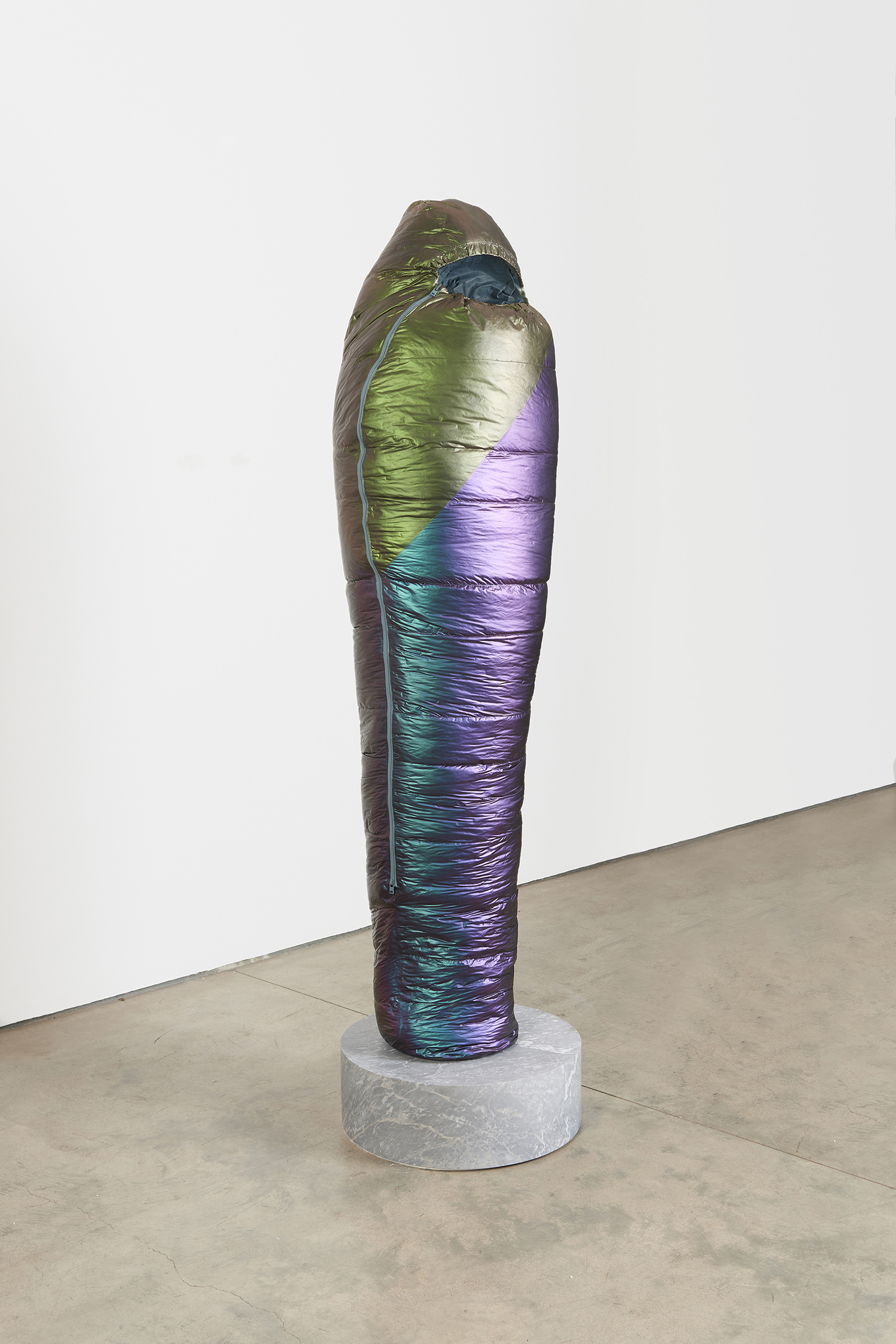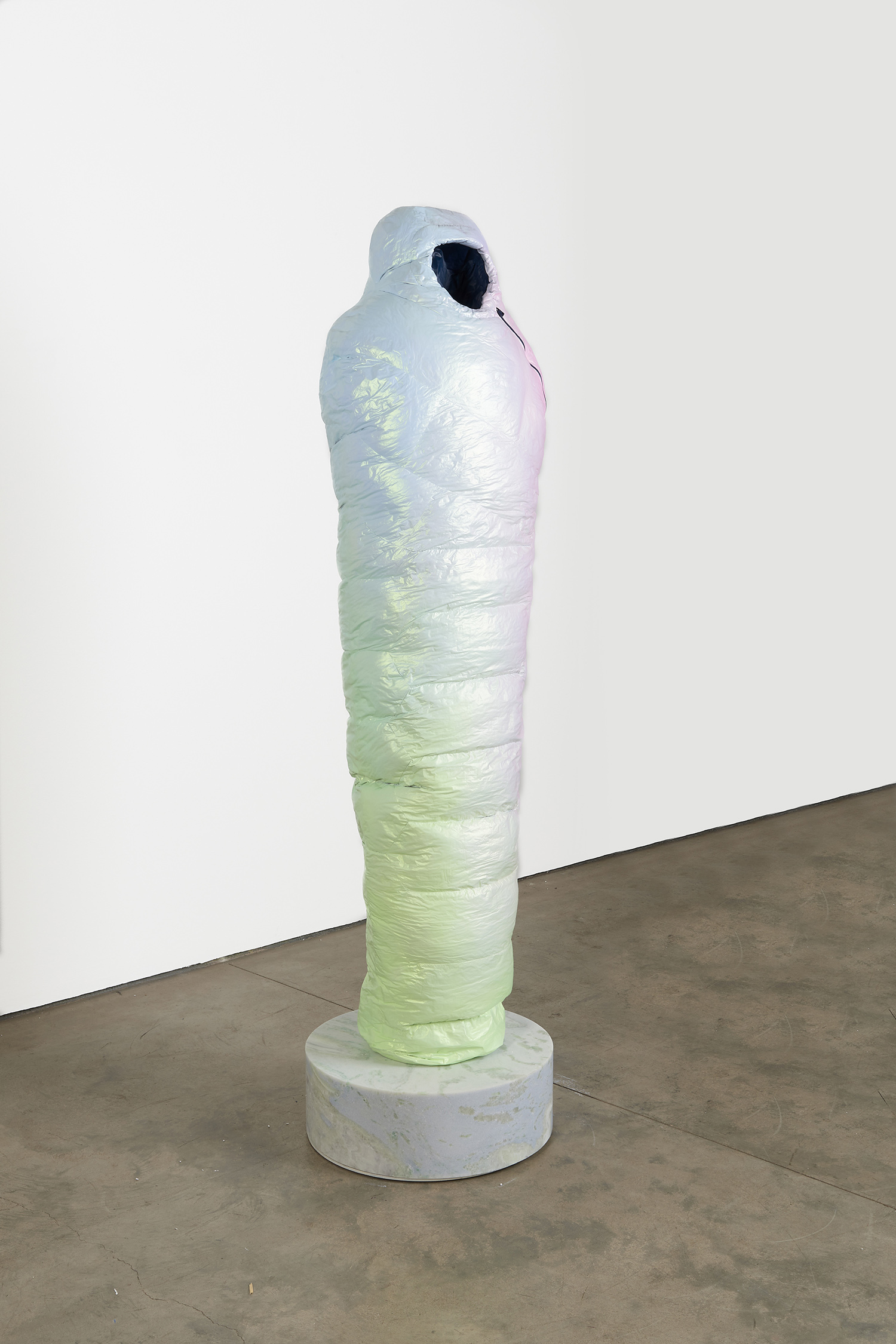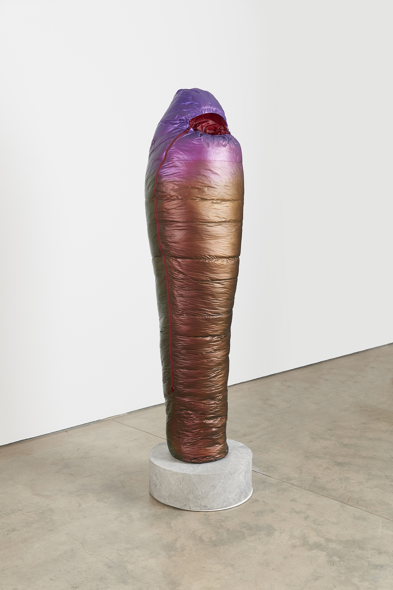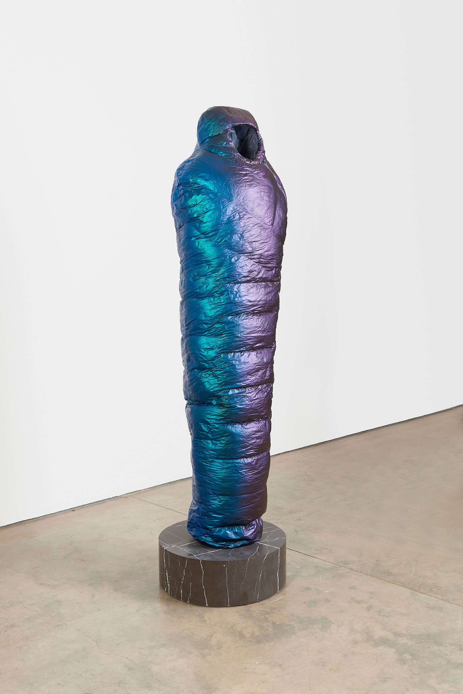 Standing upright on marble plinths, Smith’s Sarcophagi are pointedly recognizable in their resemblance to sub-zero sleeping bags. In resin, steel, and urethane, Smith fashions familiar objects, made to appear both inflated and dispensable. His sculptures, in the manner of Readymades, are instantly accessible and quietly satiric, at first glance even seeming to celebrate modern mass production as its own monolithic, deracinated culture. As with Duchamp, the deception of Smith’s unruly objects becomes more apparent the longer one contemplates them.