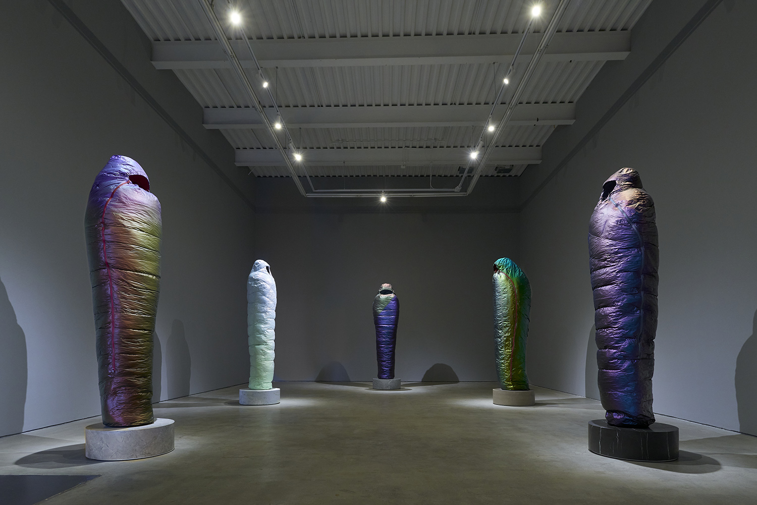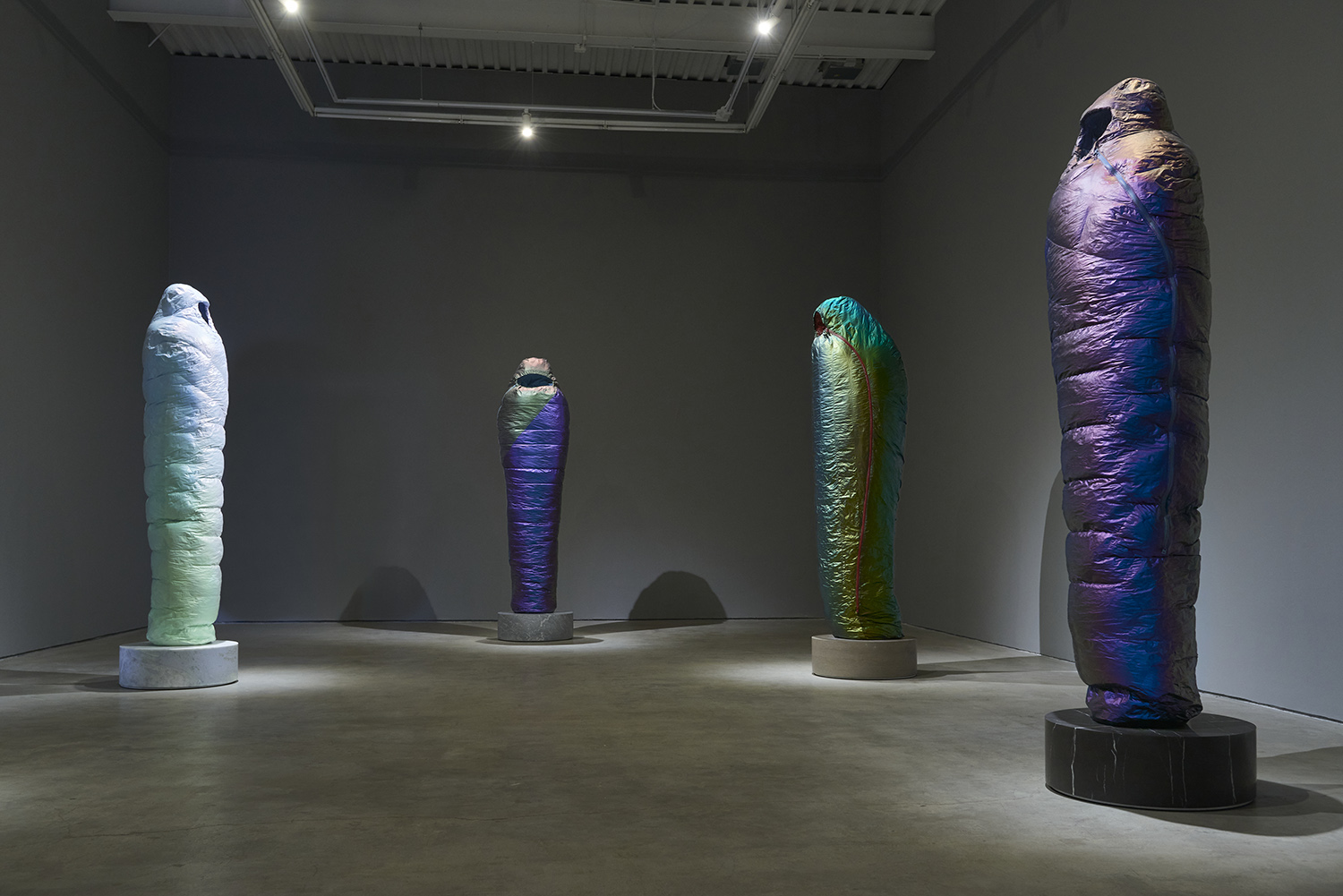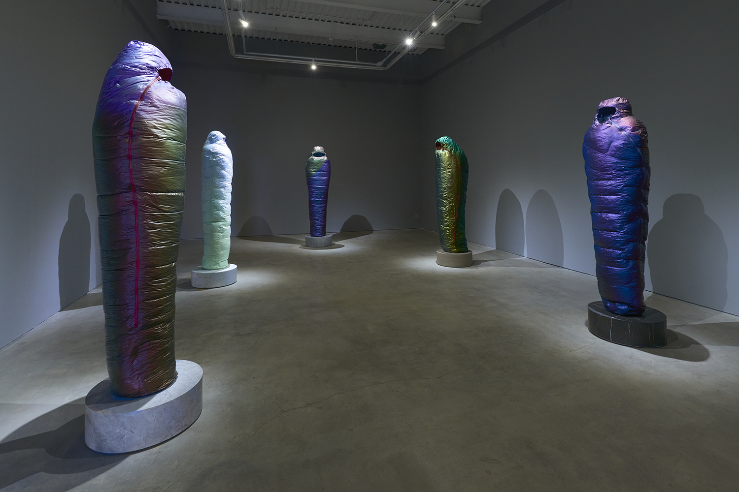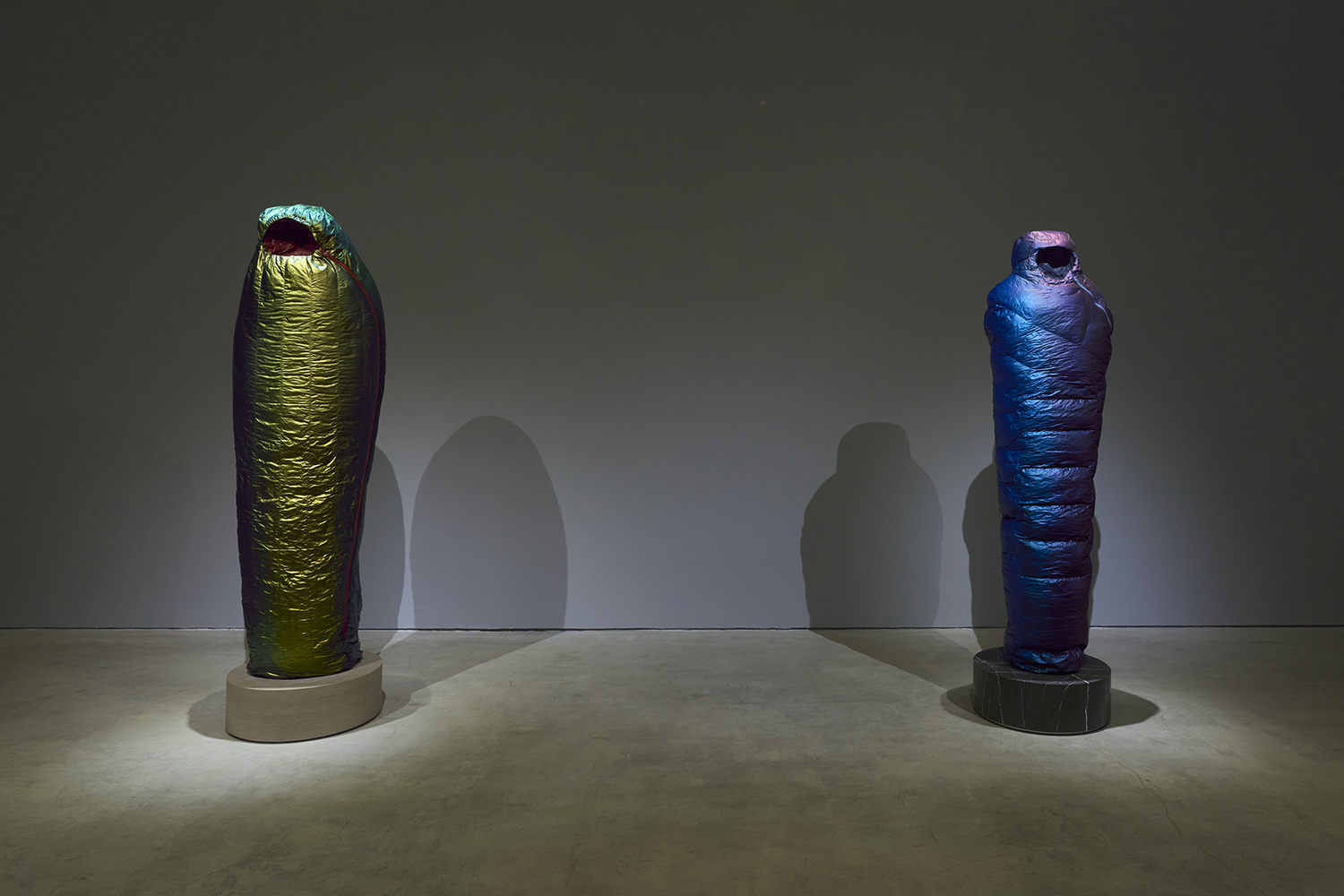 Standing upright on marble plinths, Smith’s Sarcophagi are pointedly recognizable in their resemblance to sub-zero sleeping bags. In resin, steel, and urethane, Smith fashions familiar objects, made to appear both inflated and dispensable. His sculptures, in the manner of Readymades, are instantly accessible and quietly satiric, at first glance even seeming to celebrate modern mass production as its own monolithic, deracinated culture. As with Duchamp, the deception of Smith’s unruly objects becomes more apparent the longer one contemplates them.