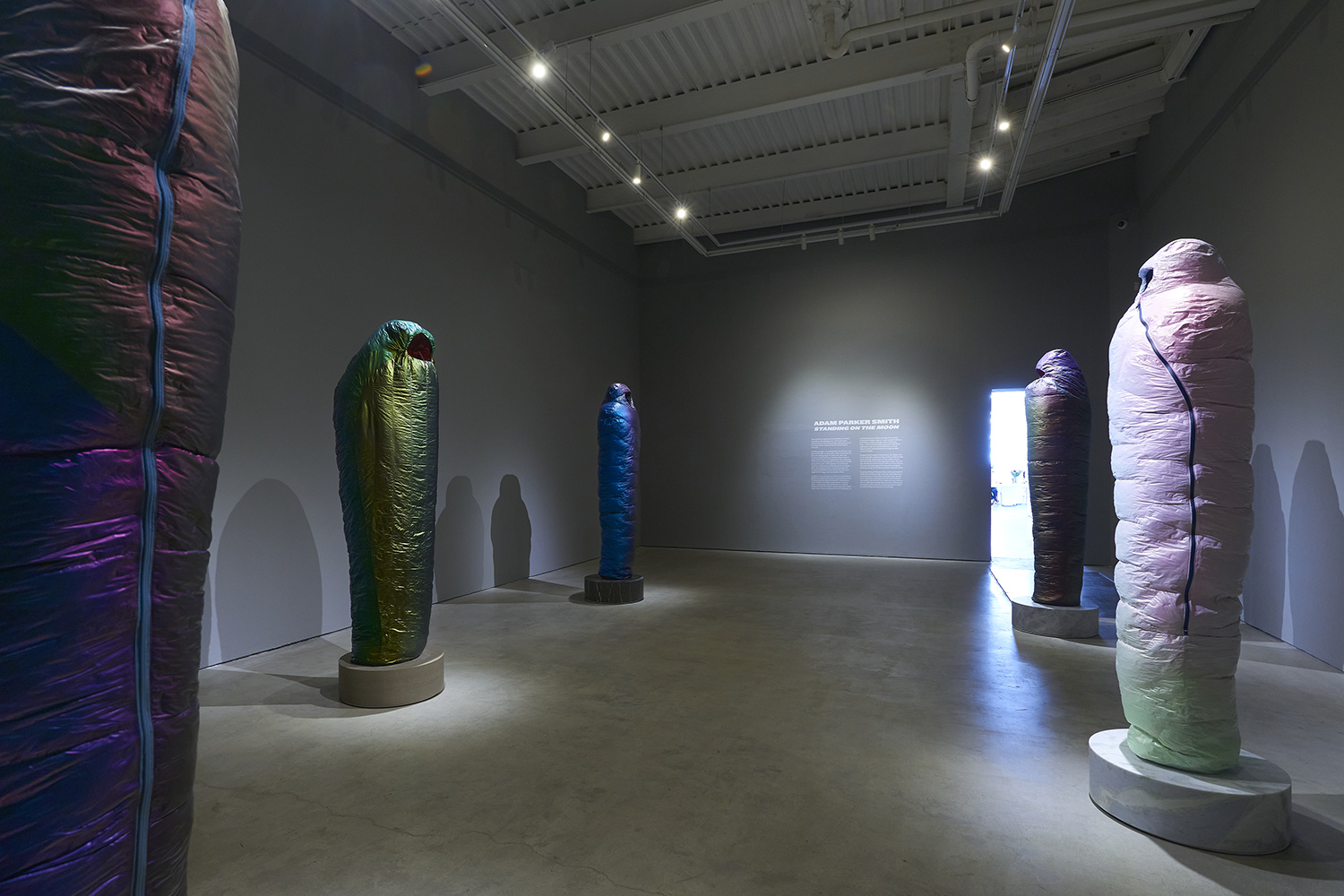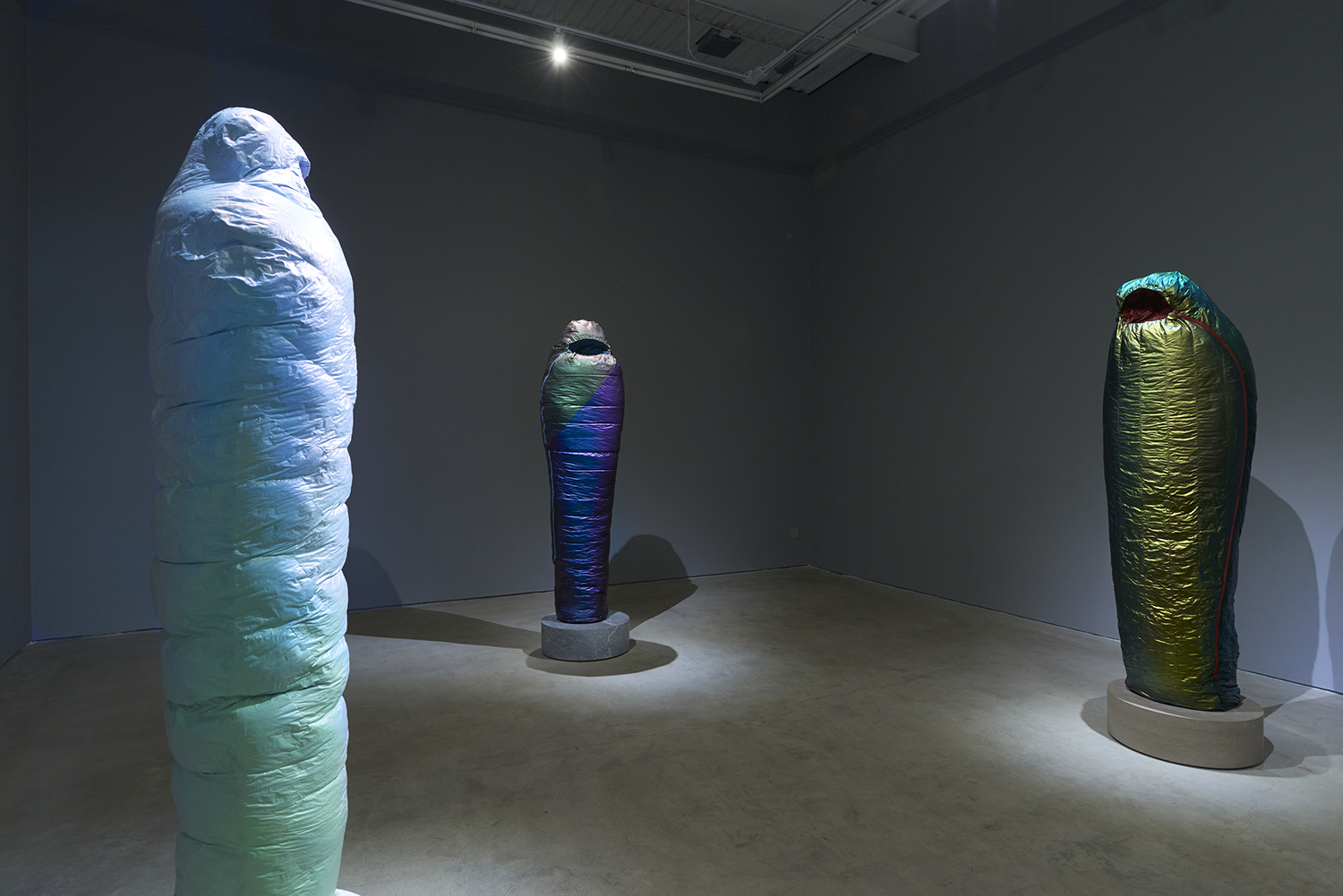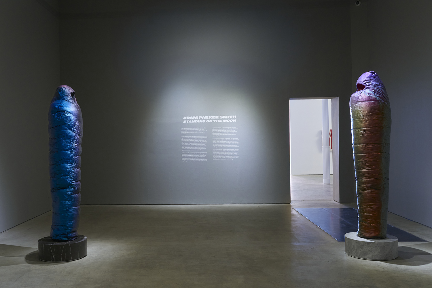 Freighted with temporal dimensions, the shapes and tones of Smith’s sculptures also evoke an otherworldly sense of being, appearing as if they might contain alien life-forms or function as gestation pods. Resonating with historic burial rites as well as sci-fi aesthetics, the works ruminate upon the timescales and global pathways along which these synthetic materials move.