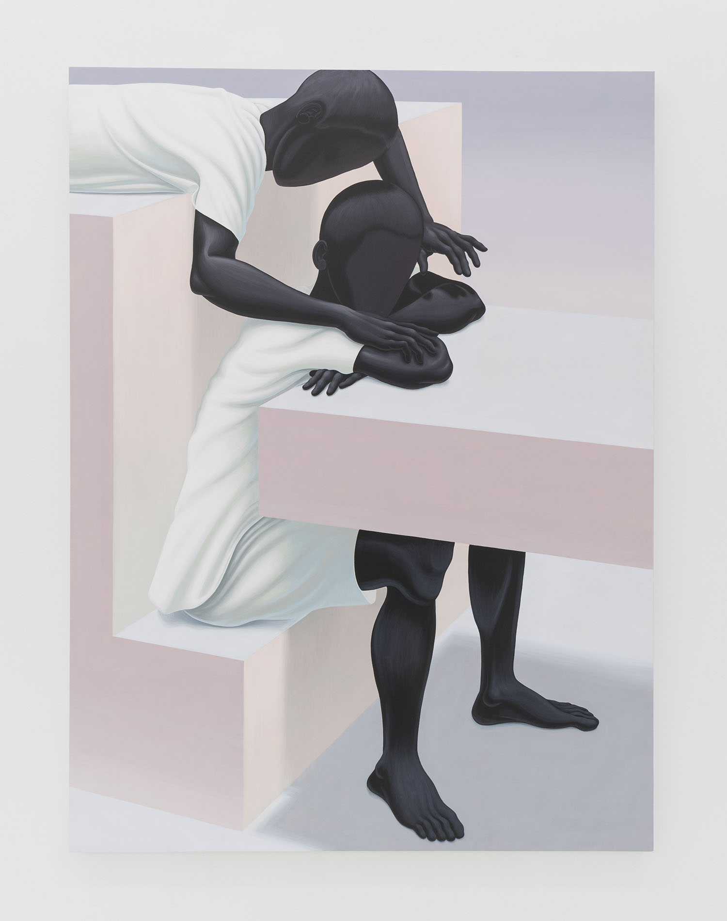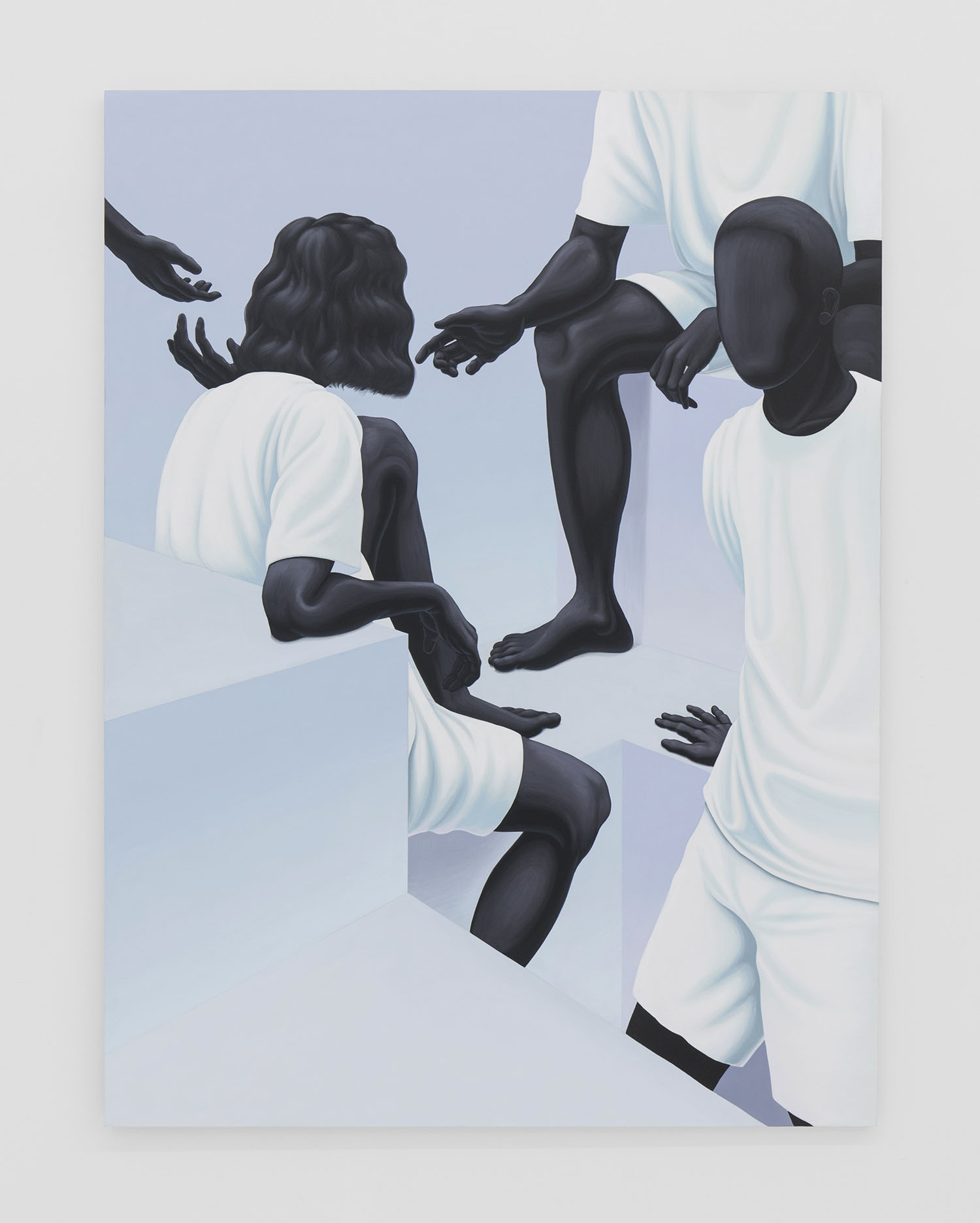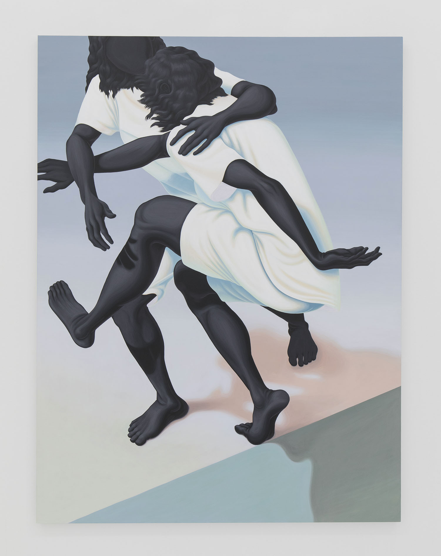 The paintings indicate in gesture and pose a wordless “romantic comedy”. As in Mannerist paintings, they capture drama with their bodies through the distortion of torsion, a clump of muscle, a knobby knuckle, a languid wrist. Over-articulated fingers and feet contrast with completely featurelessly smooth faces; expression is only through body language. Gender is hinted at but as with the skin and the clothes and the environments, all cultural signifiers are smoothed over to de-individuate and universalize.