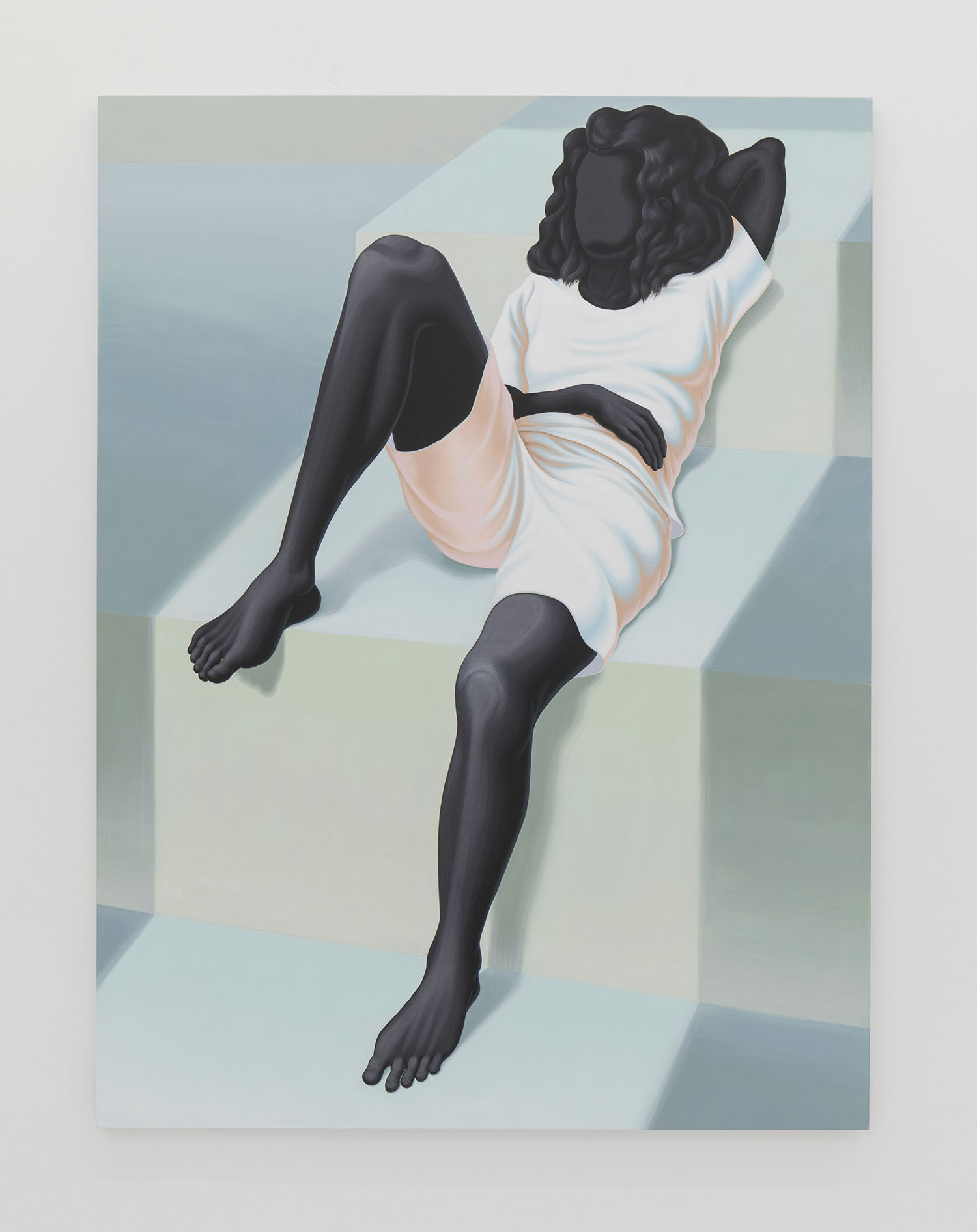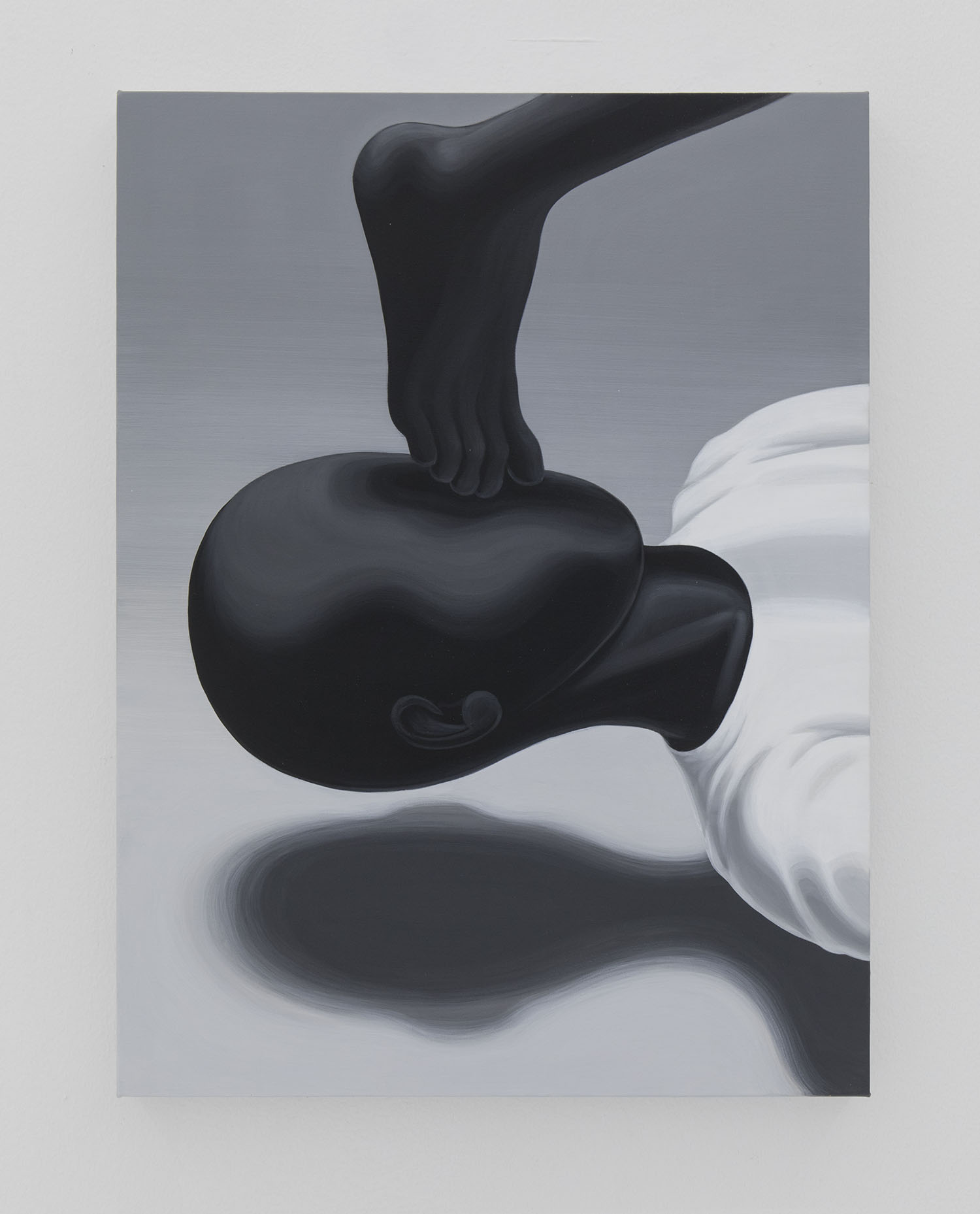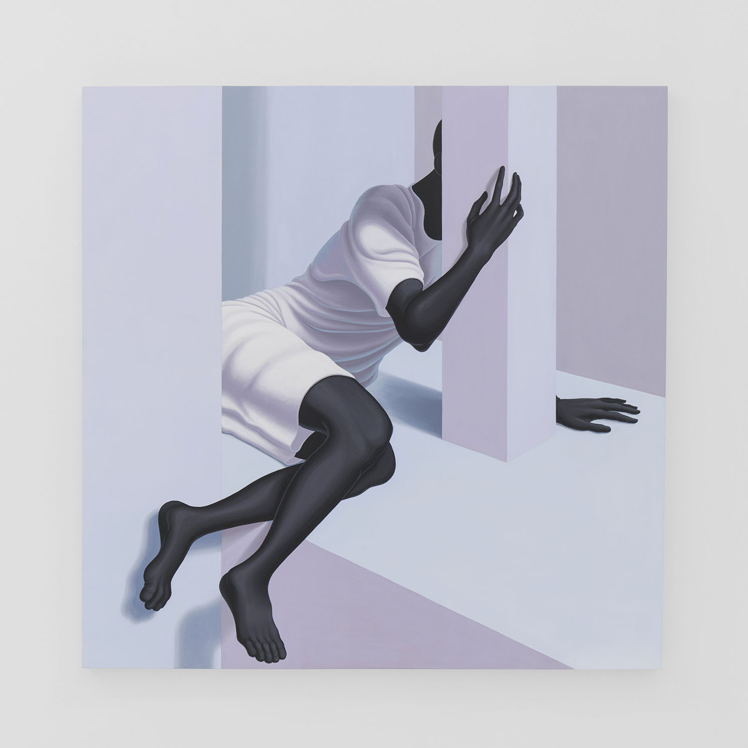 The paintings indicate in gesture and pose a wordless “romantic comedy”. As in Mannerist paintings, they capture drama with their bodies through the distortion of torsion, a clump of muscle, a knobby knuckle, a languid wrist. Over-articulated fingers and feet contrast with completely featurelessly smooth faces; expression is only through body language. Gender is hinted at but as with the skin and the clothes and the environments, all cultural signifiers are smoothed over to de-individuate and universalize.