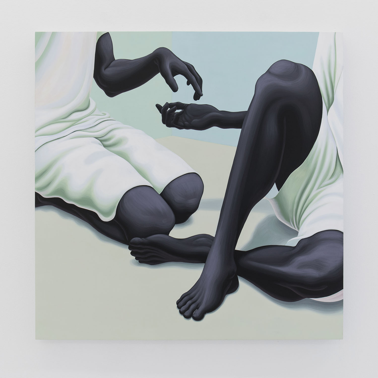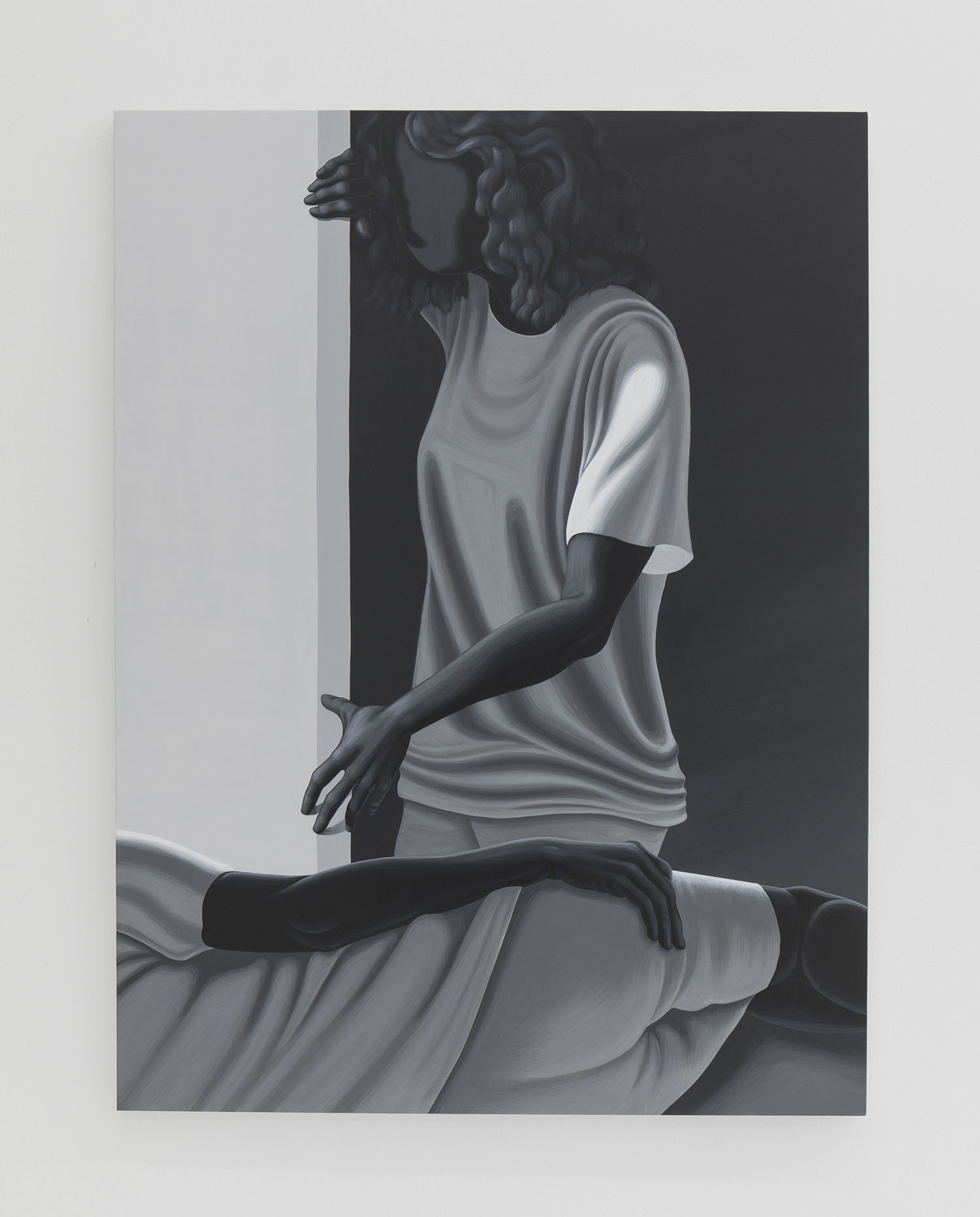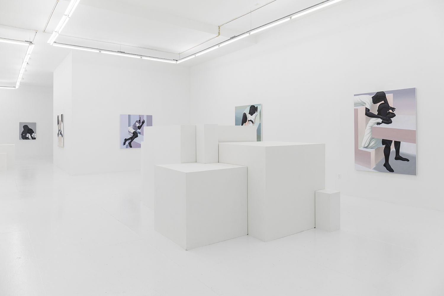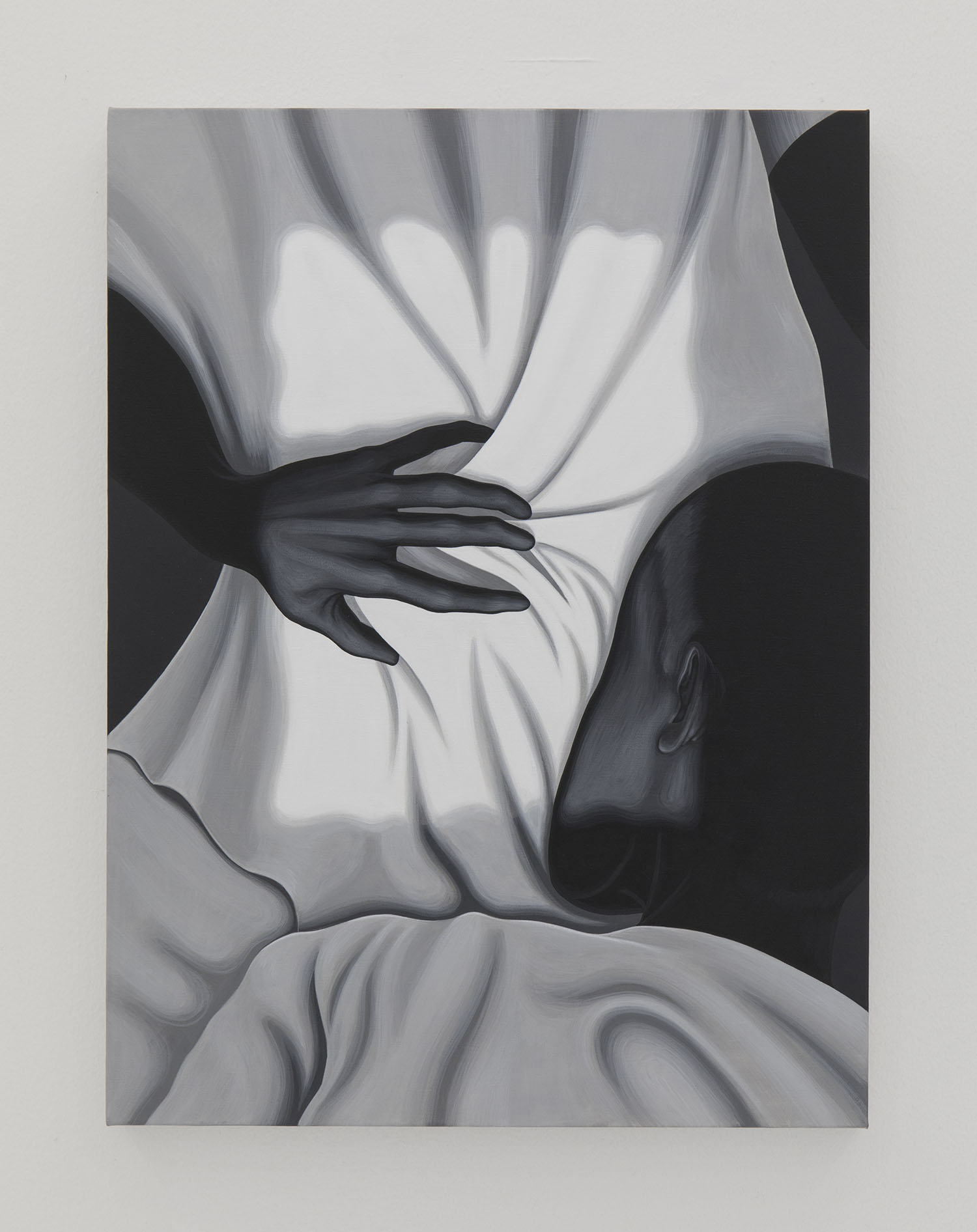 Welcome to Alex Gardner’s 1st solo show in New York, “RomCom”, featuring fourteen new acrylic on linen paintings by the Long Beach-based artist. His entangled ink-black bodies are draped with dramatically folding white cotton separates and posed in pastel environments where the reflections of color produce subtle gradients and thoughtful tonal shifts.