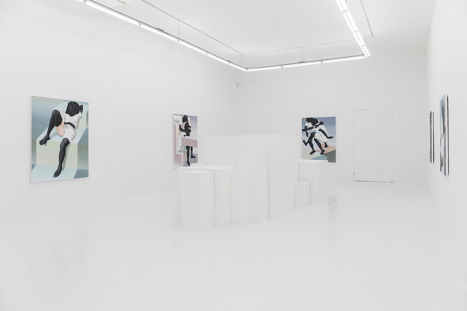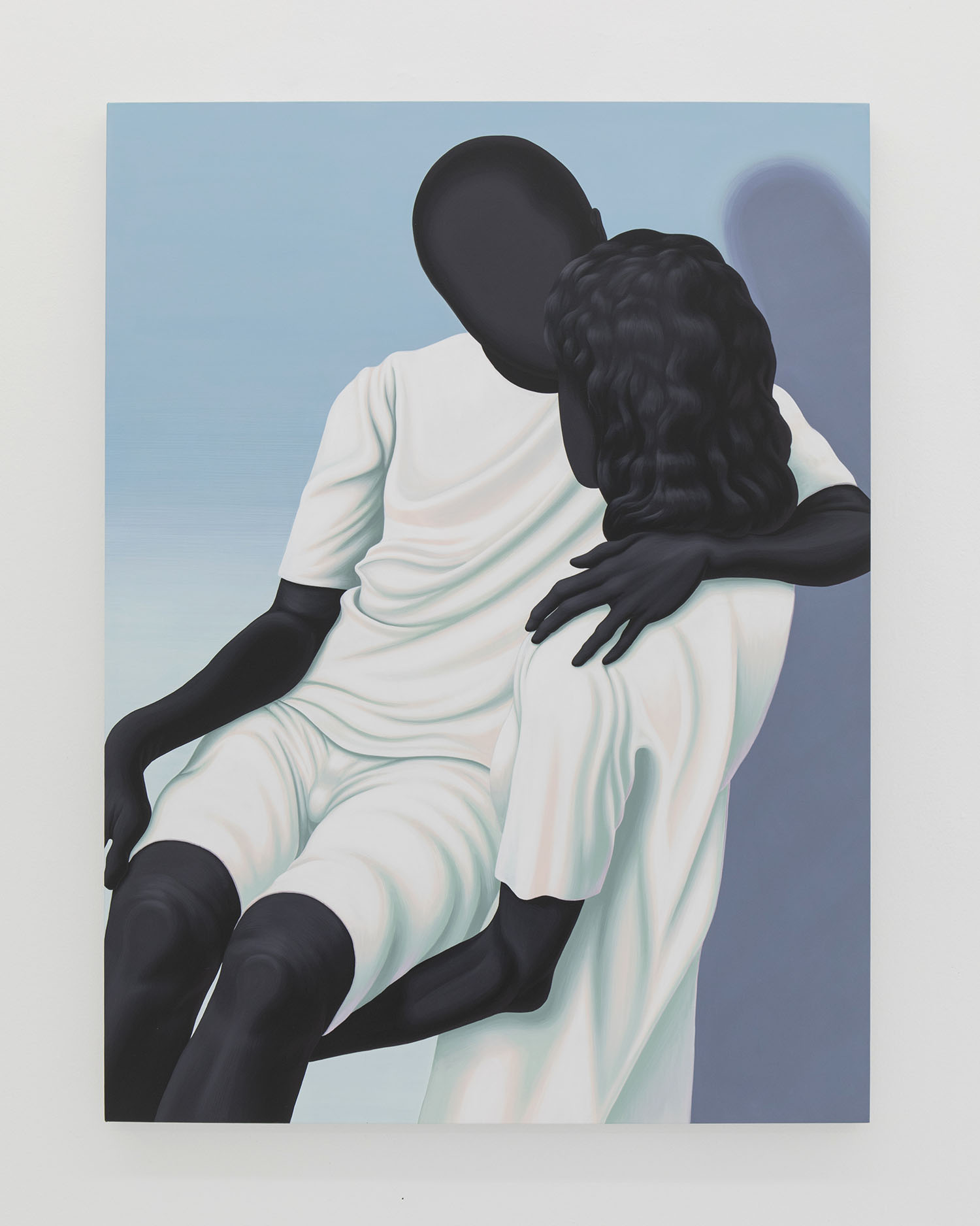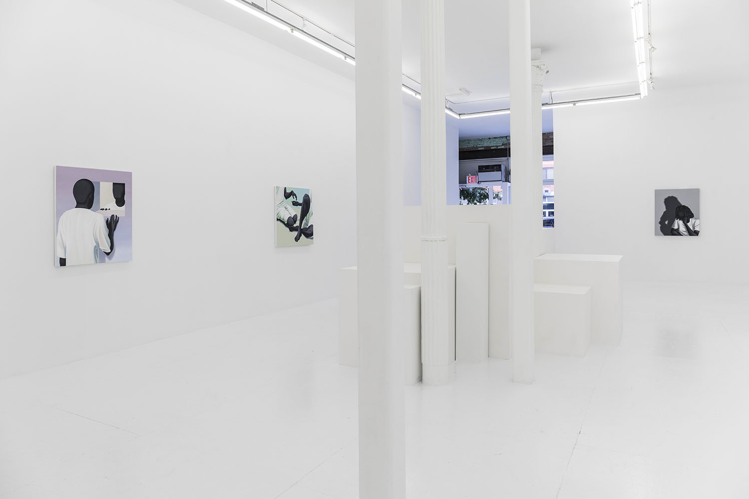 Welcome to Alex Gardner’s 1st solo show in New York, “RomCom”, featuring fourteen new acrylic on linen paintings by the Long Beach-based artist. His entangled ink-black bodies are draped with dramatically folding white cotton separates and posed in pastel environments where the reflections of color produce subtle gradients and thoughtful tonal shifts.