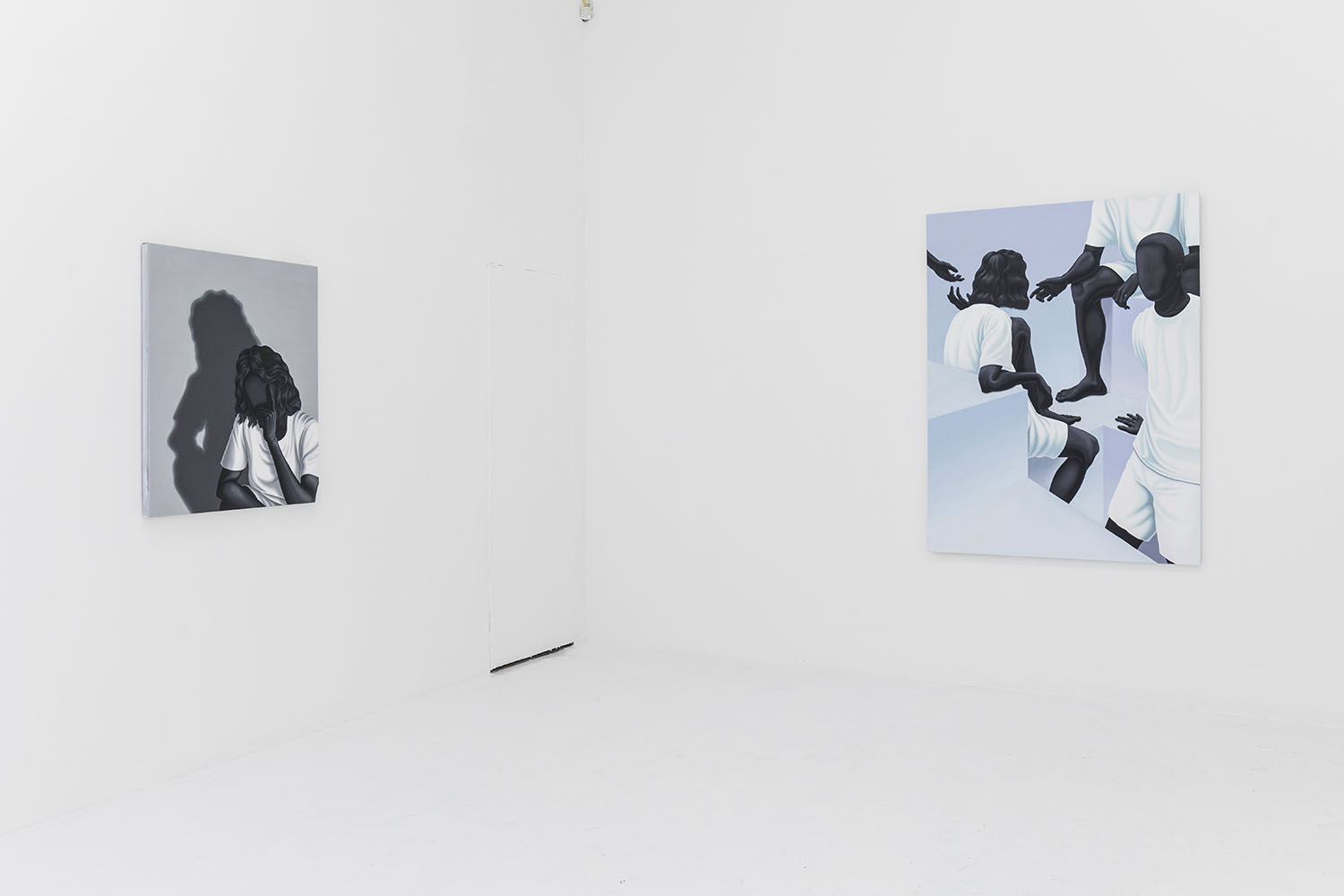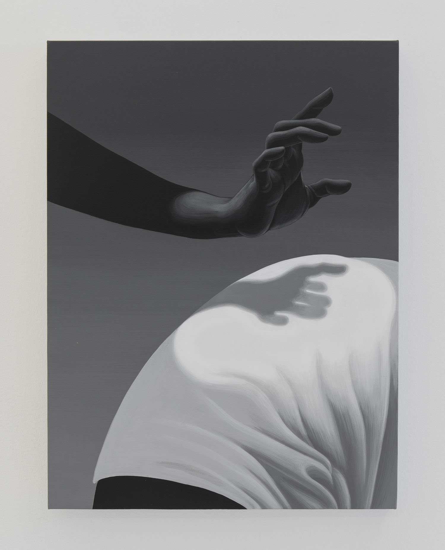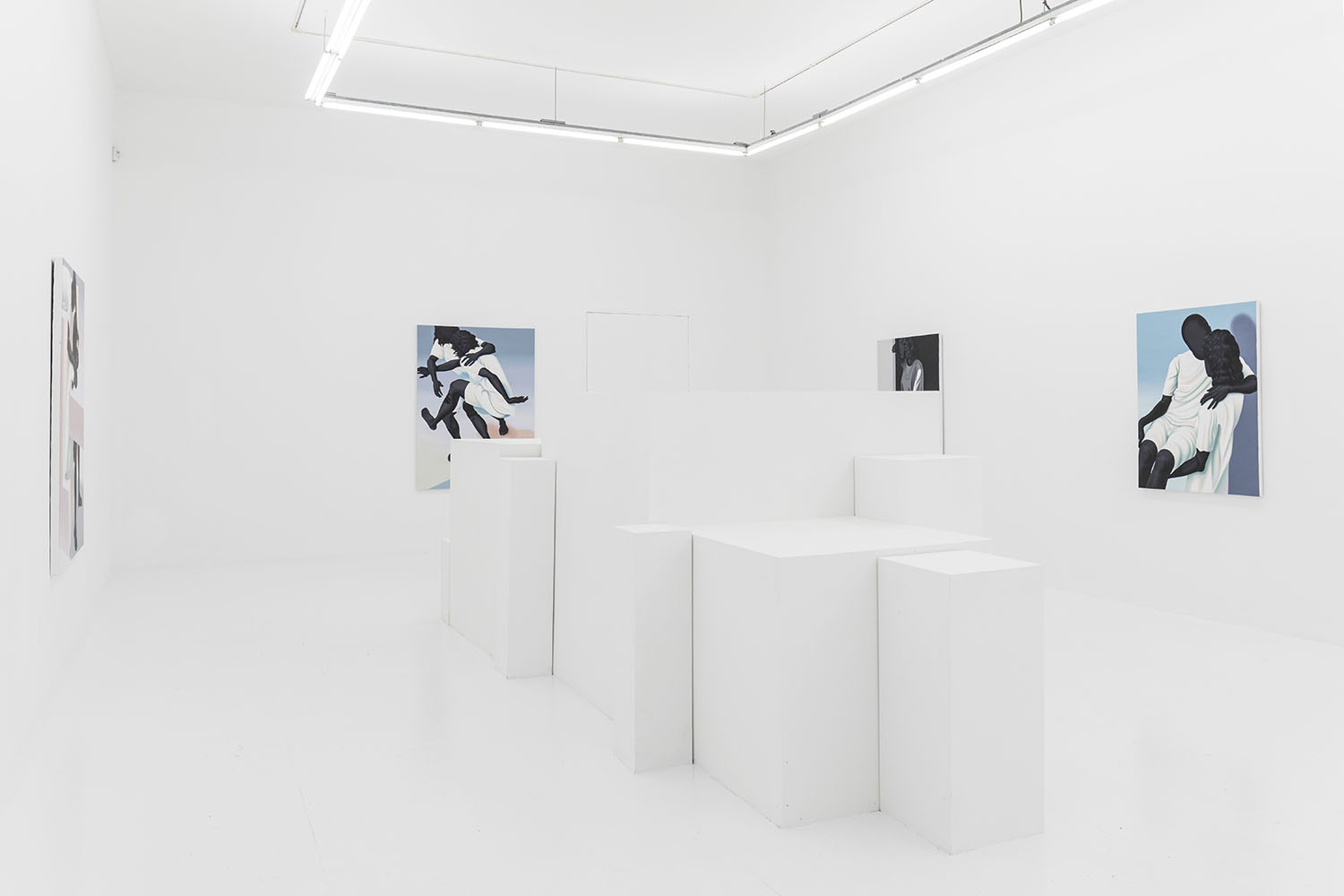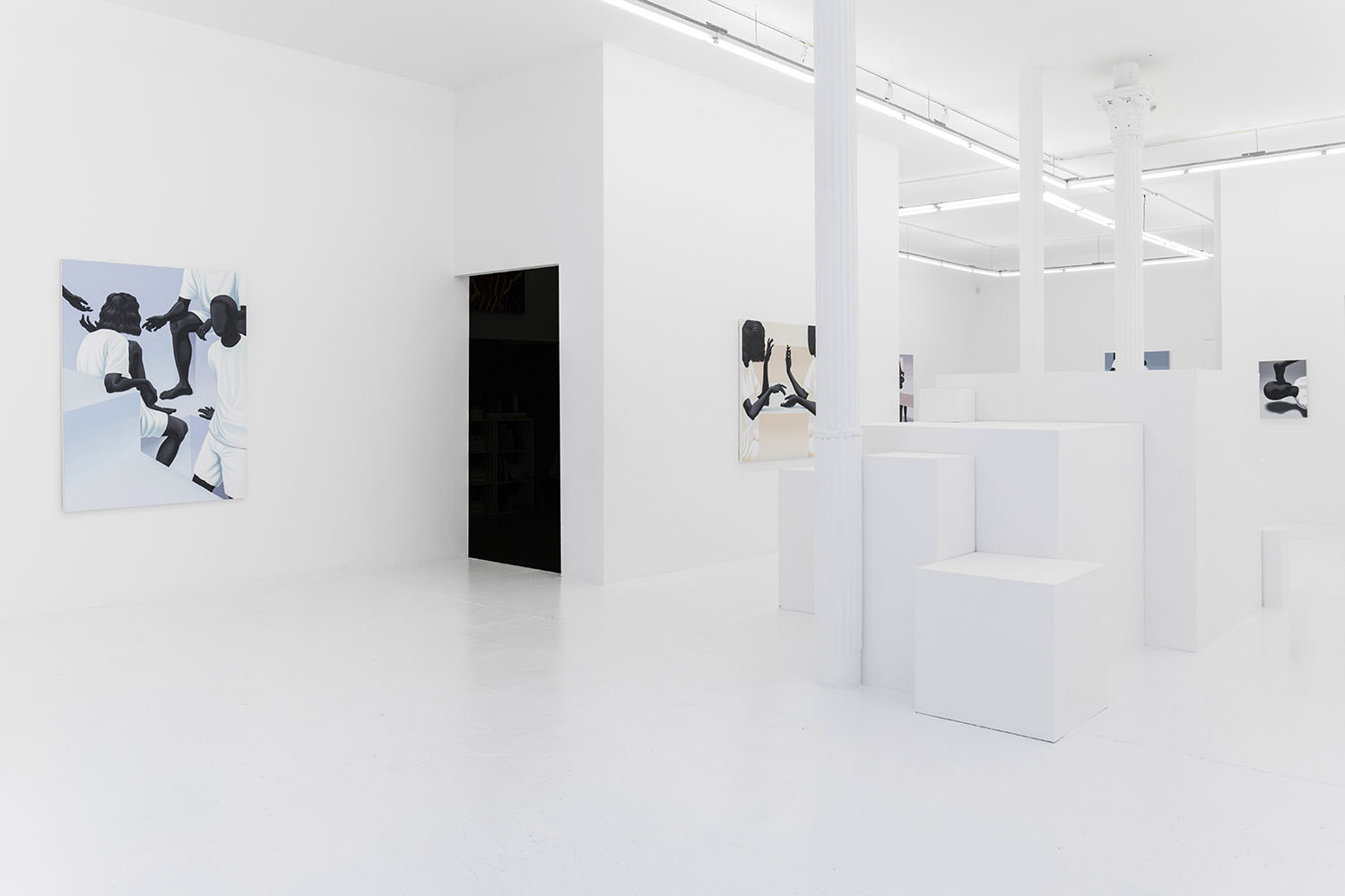 Welcome to Alex Gardner’s 1st solo show in New York, “RomCom”, featuring fourteen new acrylic on linen paintings by the Long Beach-based artist. His entangled ink-black bodies are draped with dramatically folding white cotton separates and posed in pastel environments where the reflections of color produce subtle gradients and thoughtful tonal shifts.