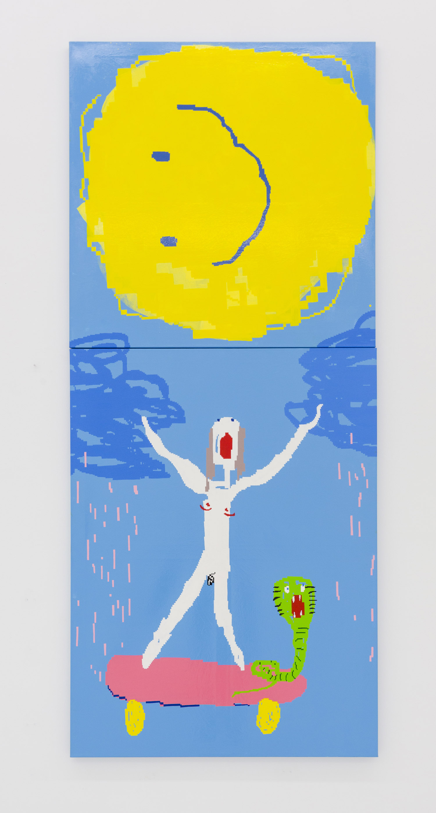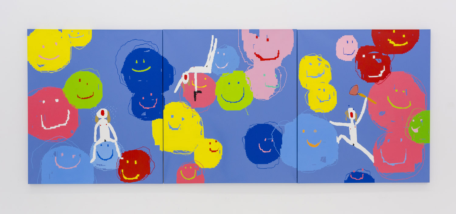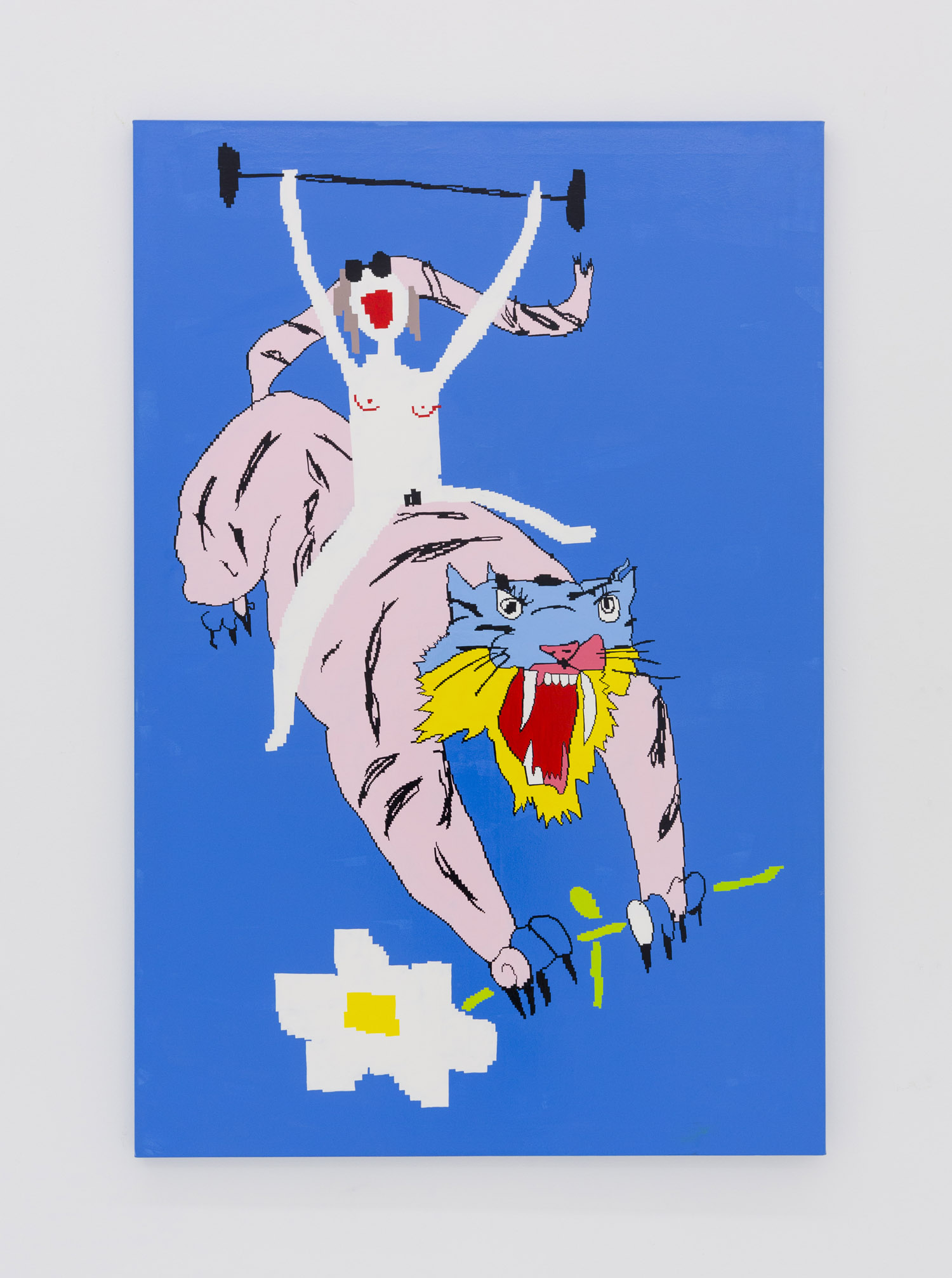 In Maja Djordjevic’s work, the female figures are much more rudimentary, barely a collection of early computer game pixels; a nude form with a little scratch of vagina and dotted on boobs, howling mouths. Like Pettibon’s VAVOOM children these figures seem to be connected to something primal, and loud. Djordjevic paints these rectilinear shapes by hand, sketched out in an early kind of MacPaint program, where squares of color are so large as to prevent too much detail. The anonymous women that populate her paintings are used as symbols of feminine power, pleasure and pain; and while being tiny and barely marked out as a girl, they explode with vitality and even positivity.
