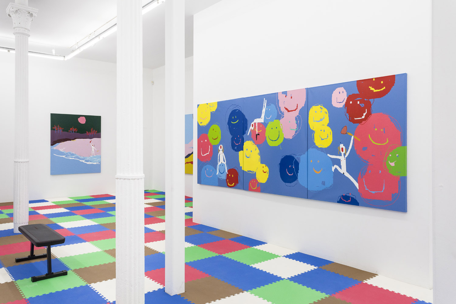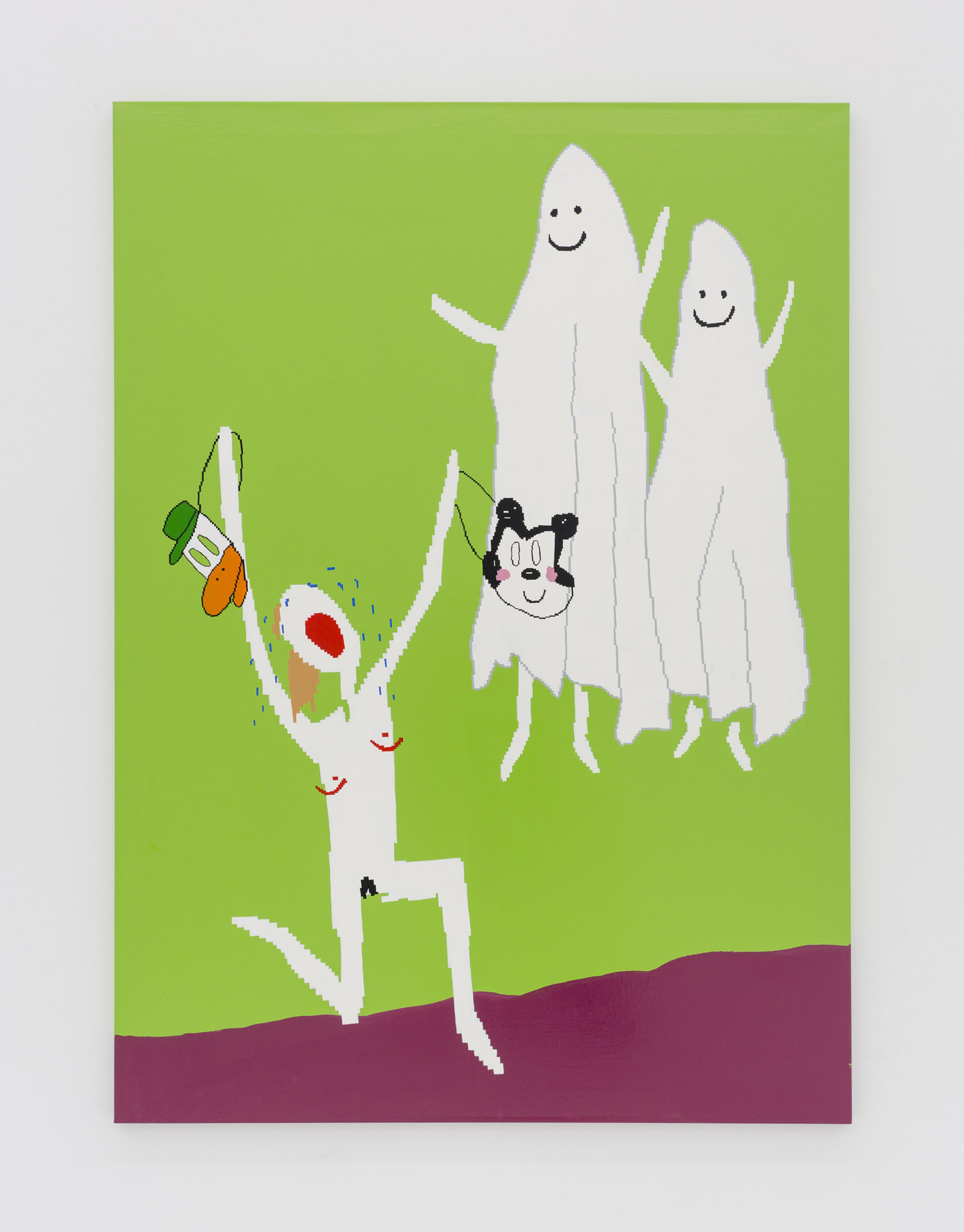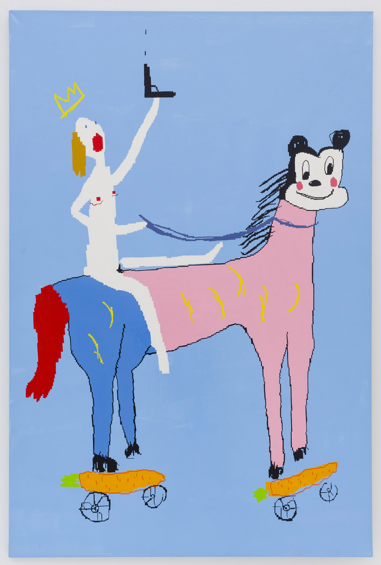 In Maja Djordjevic’s work, the female figures are much more rudimentary, barely a collection of early computer game pixels; a nude form with a little scratch of vagina and dotted on boobs, howling mouths. Like Pettibon’s VAVOOM children these figures seem to be connected to something primal, and loud. Djordjevic paints these rectilinear shapes by hand, sketched out in an early kind of MacPaint program, where squares of color are so large as to prevent too much detail. The anonymous women that populate her paintings are used as symbols of feminine power, pleasure and pain; and while being tiny and barely marked out as a girl, they explode with vitality and even positivity.