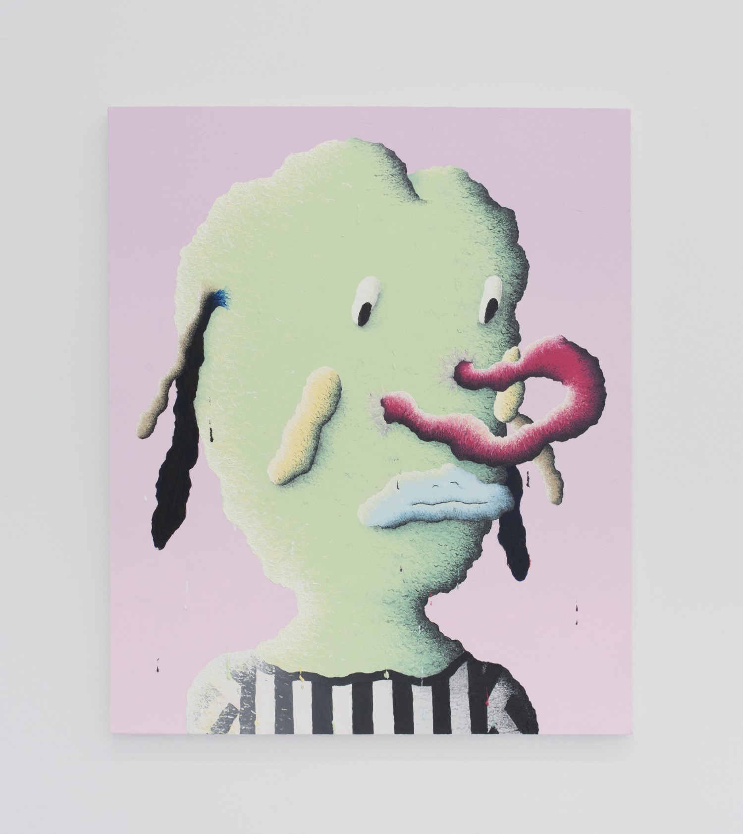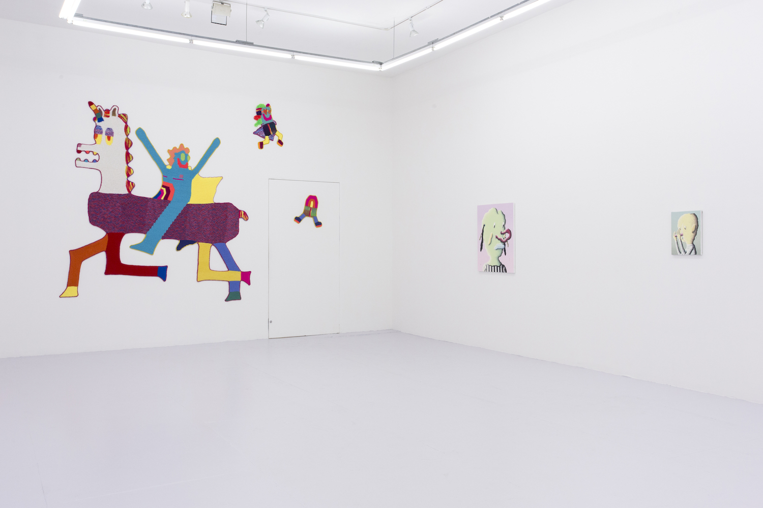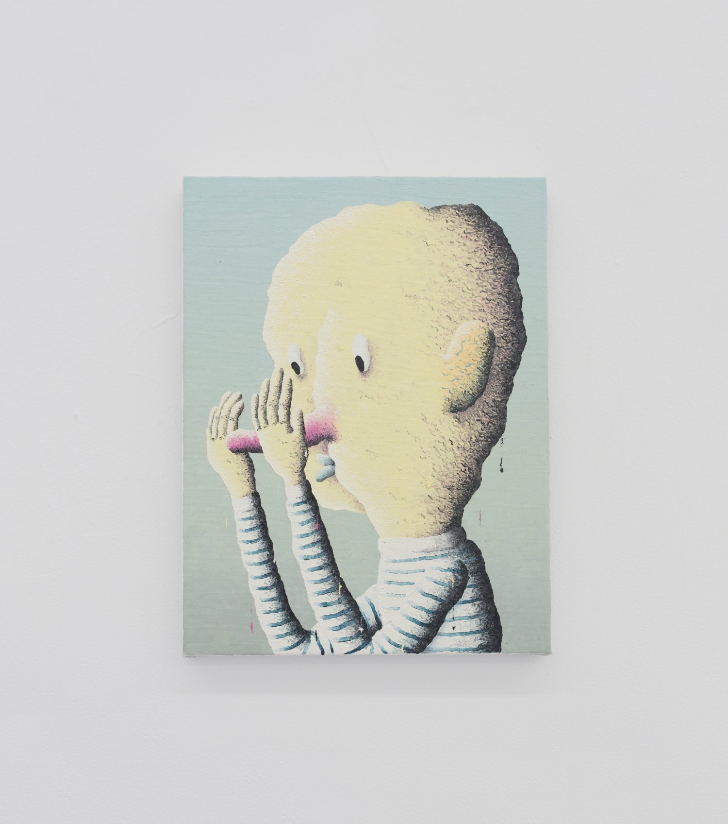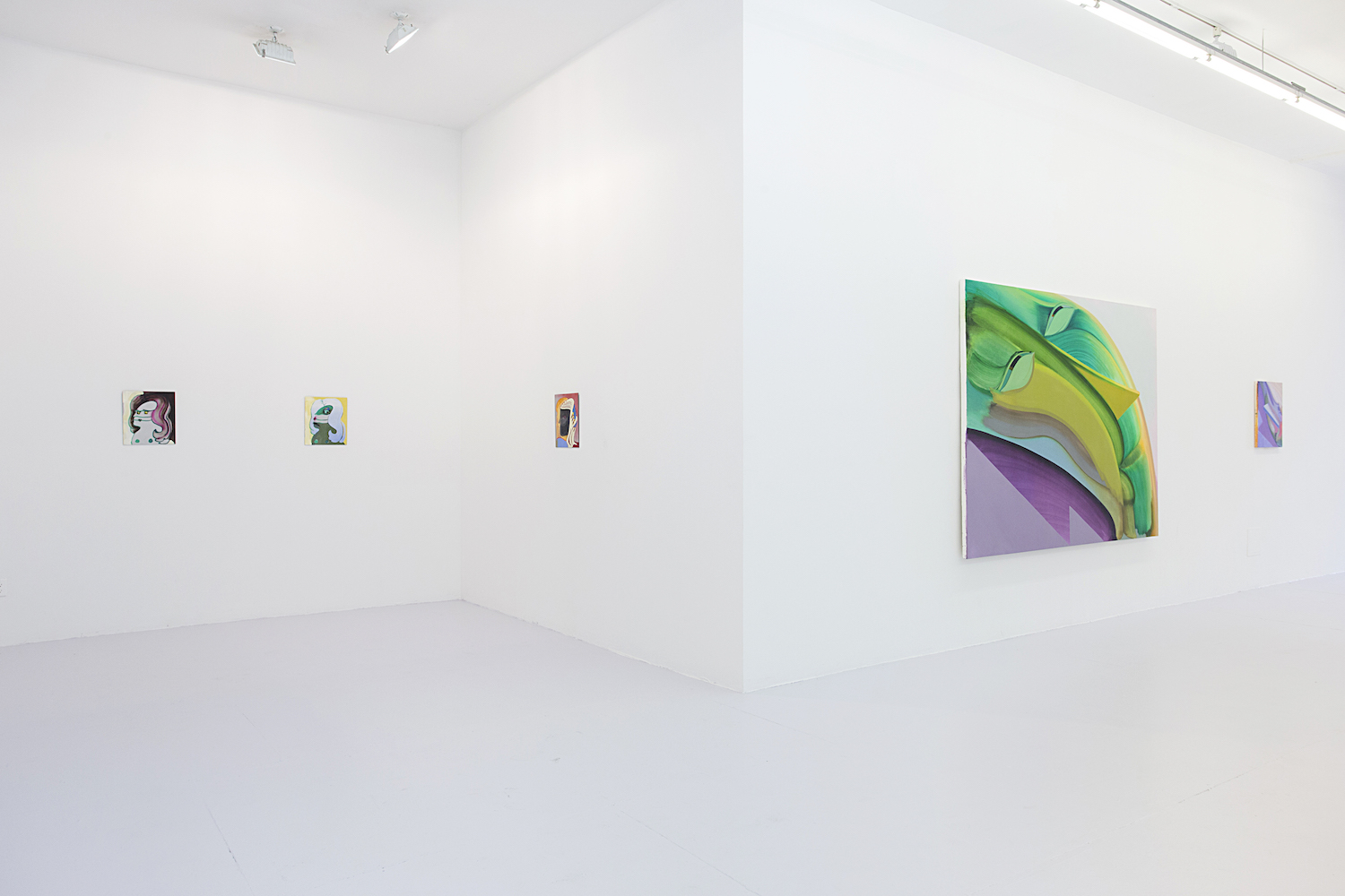 Joakim Ojanen (b. 1985 Sweden) exhibits two little creatures, from a cartooning realm but fussily shadowed and lit with little squiggly black or white paint lines. Tubular, lumpy, and duck-lipped the little guy “Looking / Hiding” would happily exist well as either a painting or a puppet. The artist is known for beautiful glazed clay sculptures and the paintings look like they were composed in the same manner, à la Mr. Potato Head, a clay shape with protuberances added on to customize.