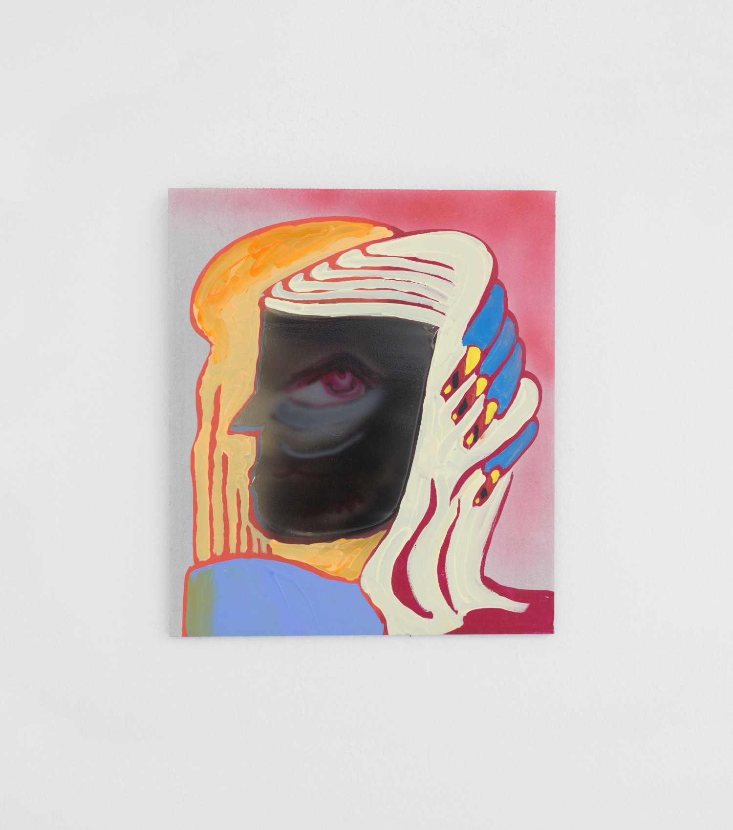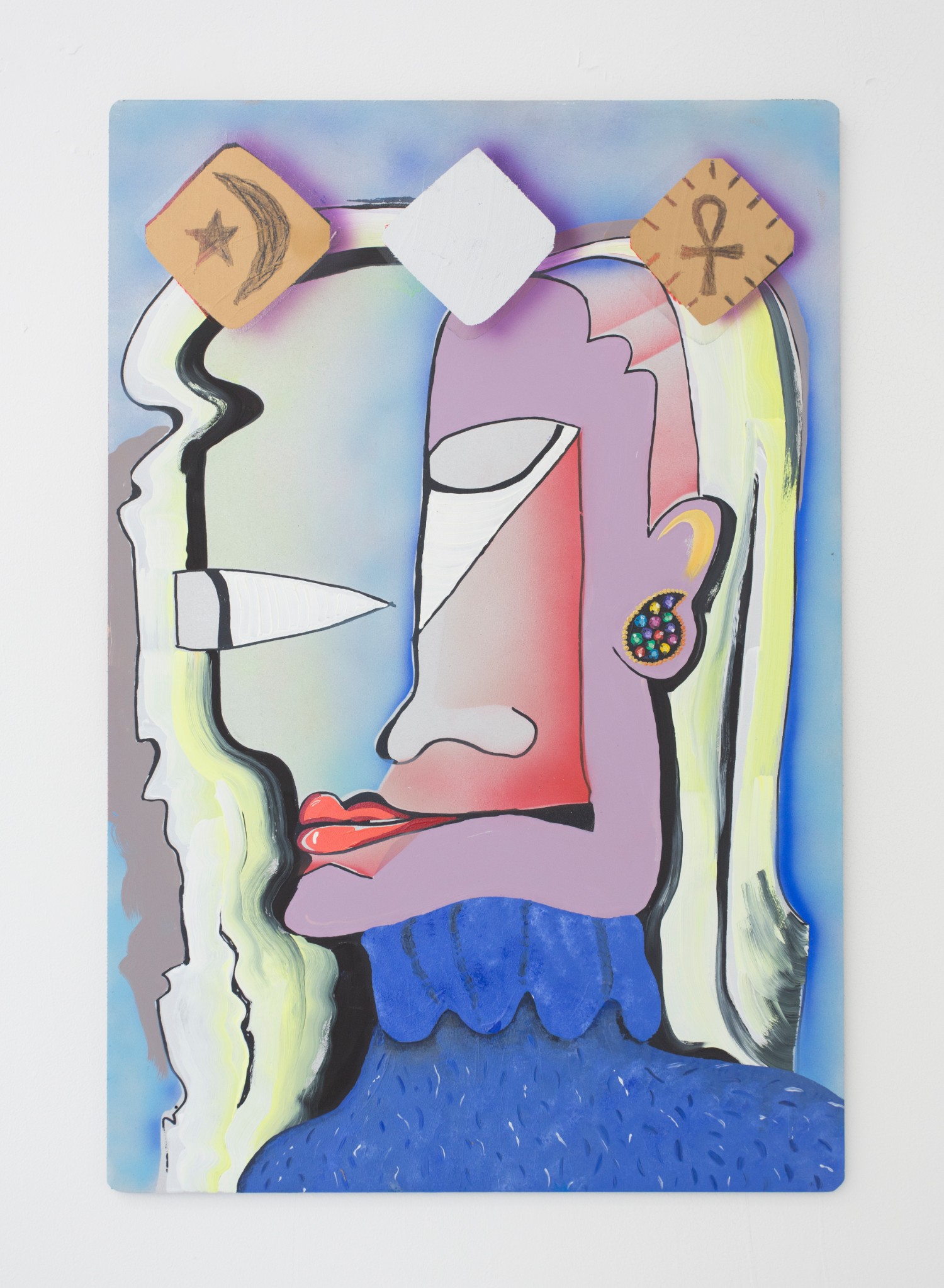 Similar in Jim Nutt-iness is Melissa Brown (b. 1974 New Jersey) whose ladies look a bit slicker with flashe and oil on aluminum but also get bedazzled a bit with scratch-offs, silkscreen and gradients. She exhibits five females; busts, let’s say, and lets also say “enigmatic”. We think that is the sphinx-like intent, with titles like “Matriarch” and “Mixed Messages”.