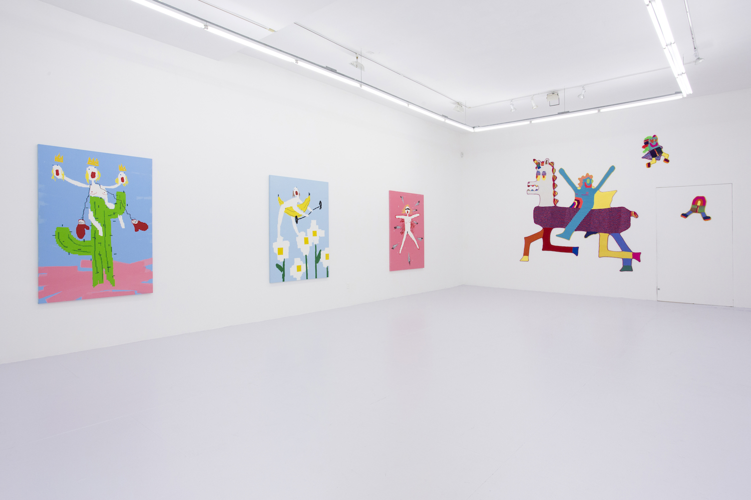 Similar in jagged effect are Caroline Wells Chandler (b.Virginia Beach) crocheted textile works, evocatively titled “Cornholio Victory”, “Eggbert”, and “Lil Kathy G” (which I really hope is me.) Hot-lined and neon spiced, your eye might be equally drawn to nipples and crotches. A pun perhaps? Crafty pixelation sounds like an oxymoron but these figures’ kicked up heels and triumphant arms convey a catchy exuberance that blankets any viewer perplexity with psyched.