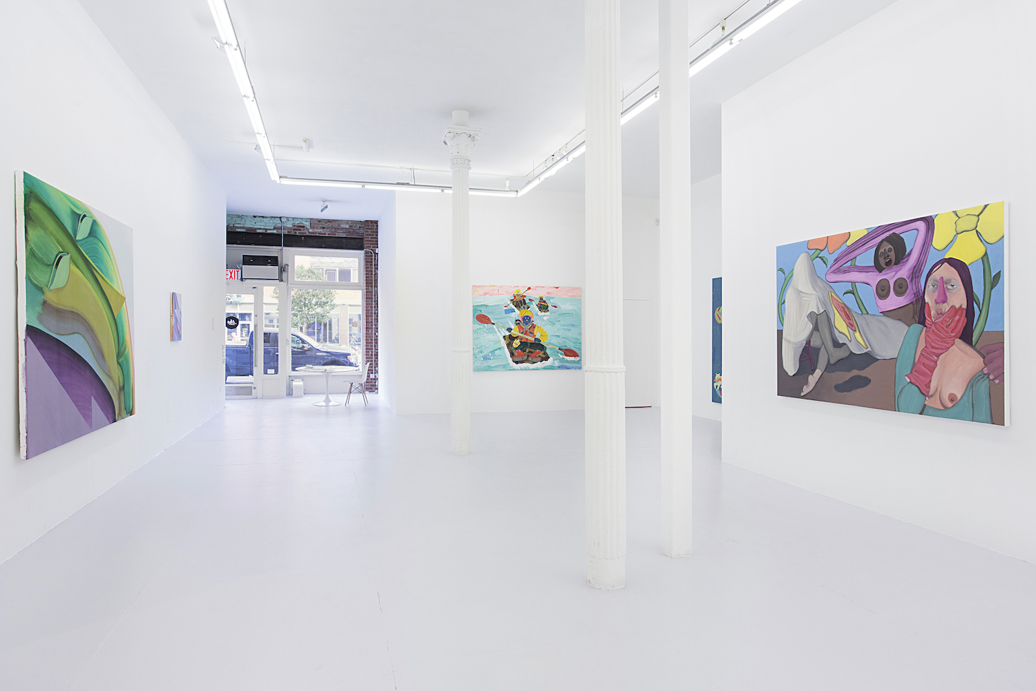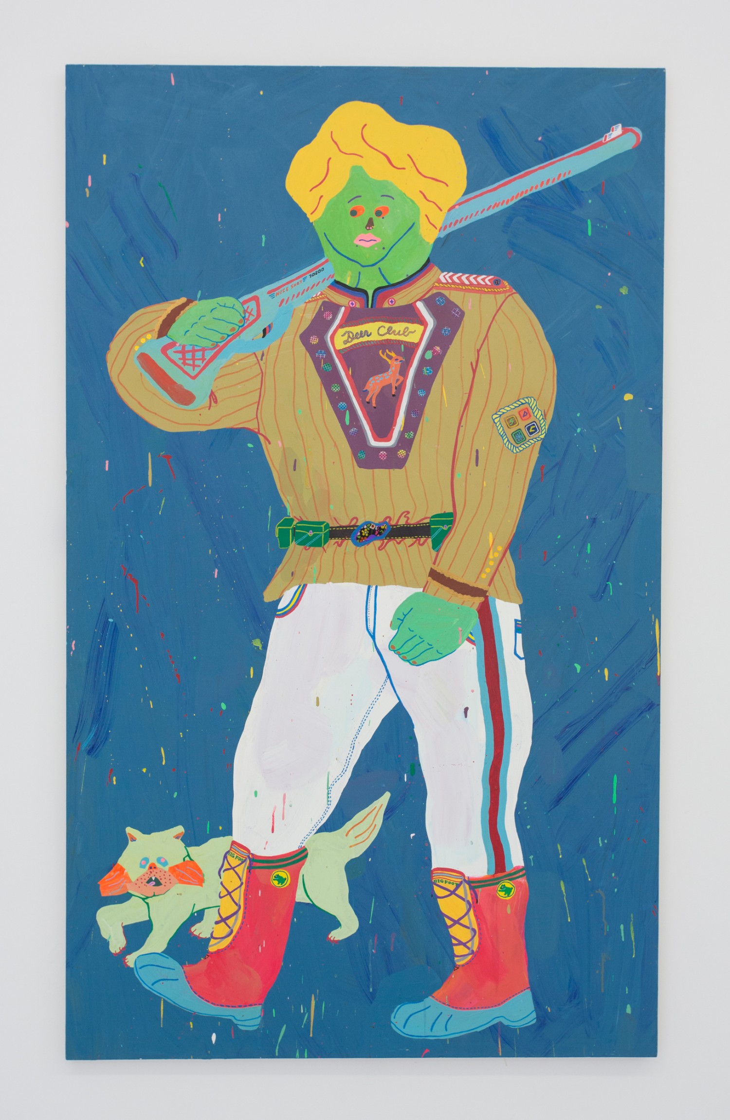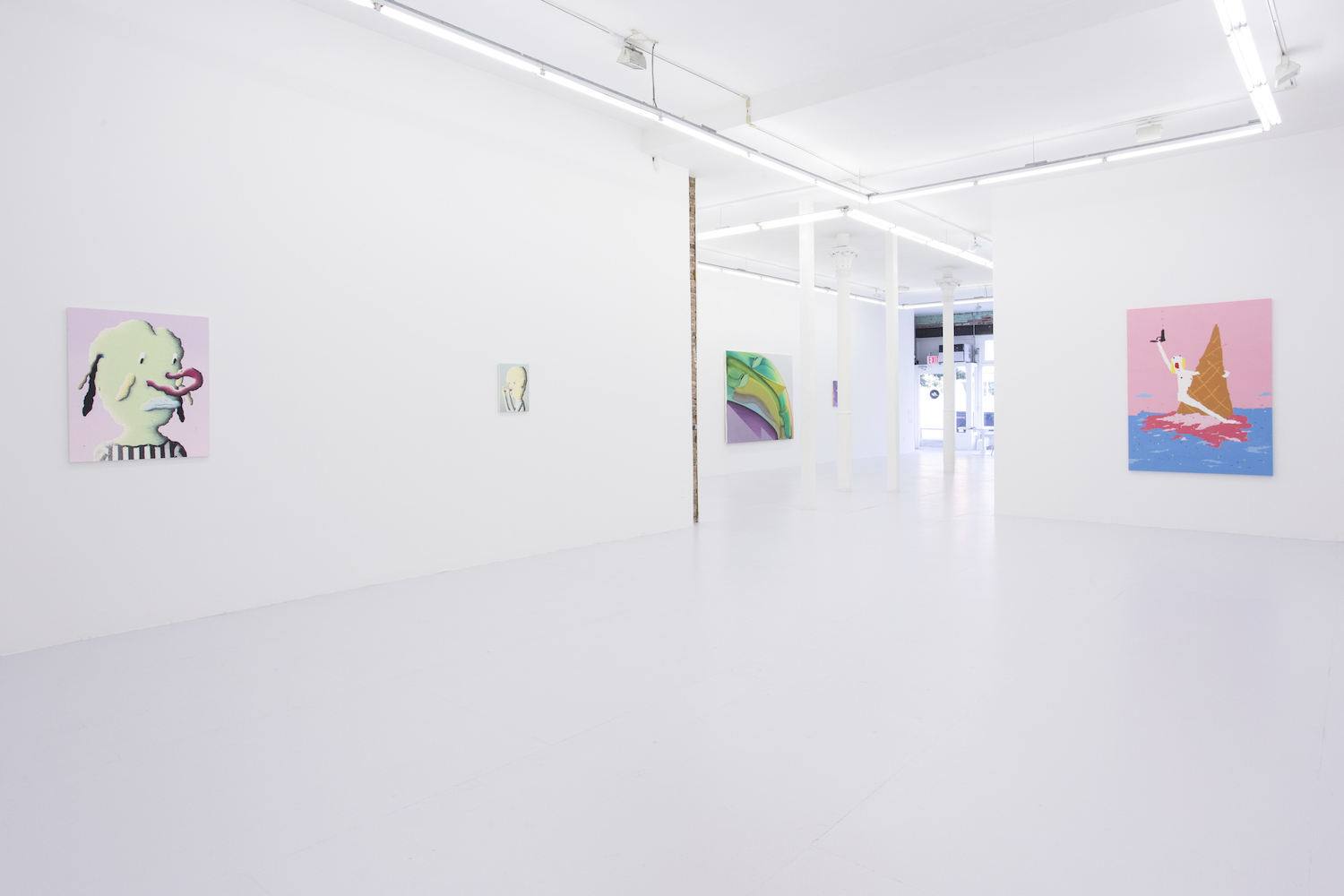 These flattened figures may not be flesh, hairy and sweaty but they do all carry some kind of intensity, some anxiety, exuberance. As sorta symbols of a human rather than a traditional figure painting, these bodies represent more than a fully-rendered human might. Djordjevic’s paintings for example only barely look like a person, you wouldn’t see yourself in their skin, you wouldn’t think they had a name, they are interchangably undifferentiated. But their lack of personalized feelings make them more effective conduits for communicating feeling somehow; the inchoate screams and gunshots reverberate with me, convey more poignantly a world that is out of control, howling and deranged. “Fried.” Maybe that would have been a good summer group show title….