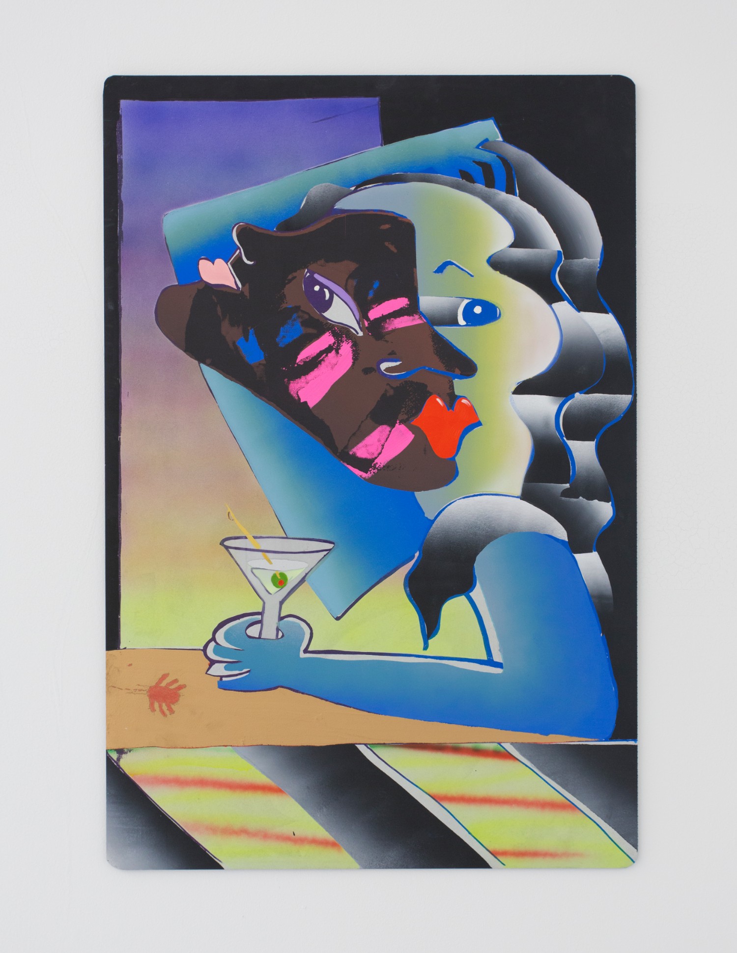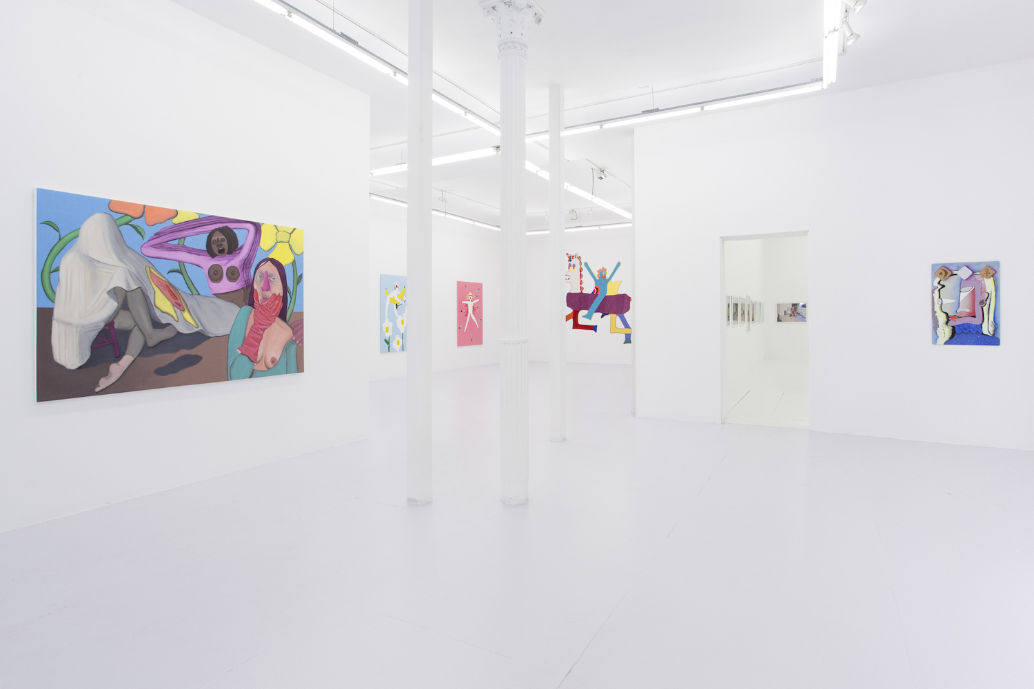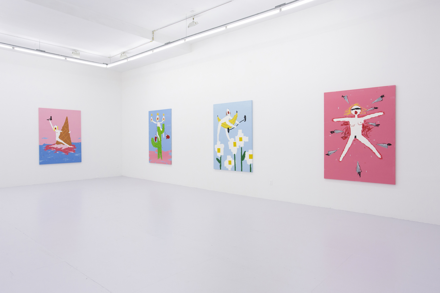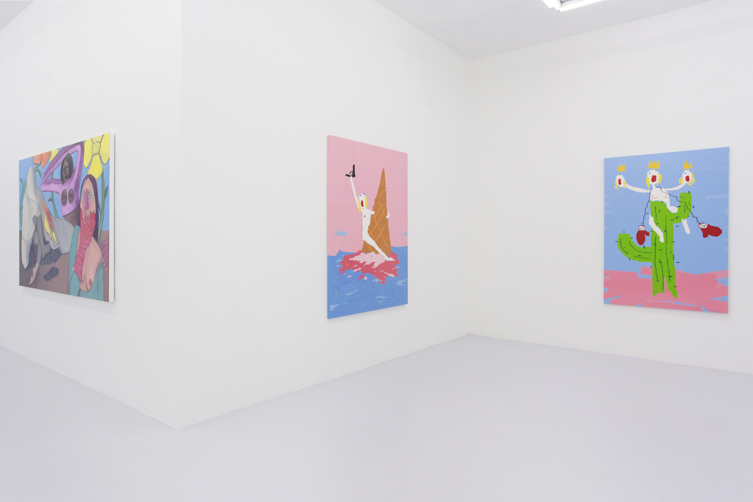 These flattened figures may not be flesh, hairy and sweaty but they do all carry some kind of intensity, some anxiety, exuberance. As sorta symbols of a human rather than a traditional figure painting, these bodies represent more than a fully-rendered human might. Djordjevic’s paintings for example only barely look like a person, you wouldn’t see yourself in their skin, you wouldn’t think they had a name, they are interchangably undifferentiated. But their lack of personalized feelings make them more effective conduits for communicating feeling somehow; the inchoate screams and gunshots reverberate with me, convey more poignantly a world that is out of control, howling and deranged. “Fried.” Maybe that would have been a good summer group show title….