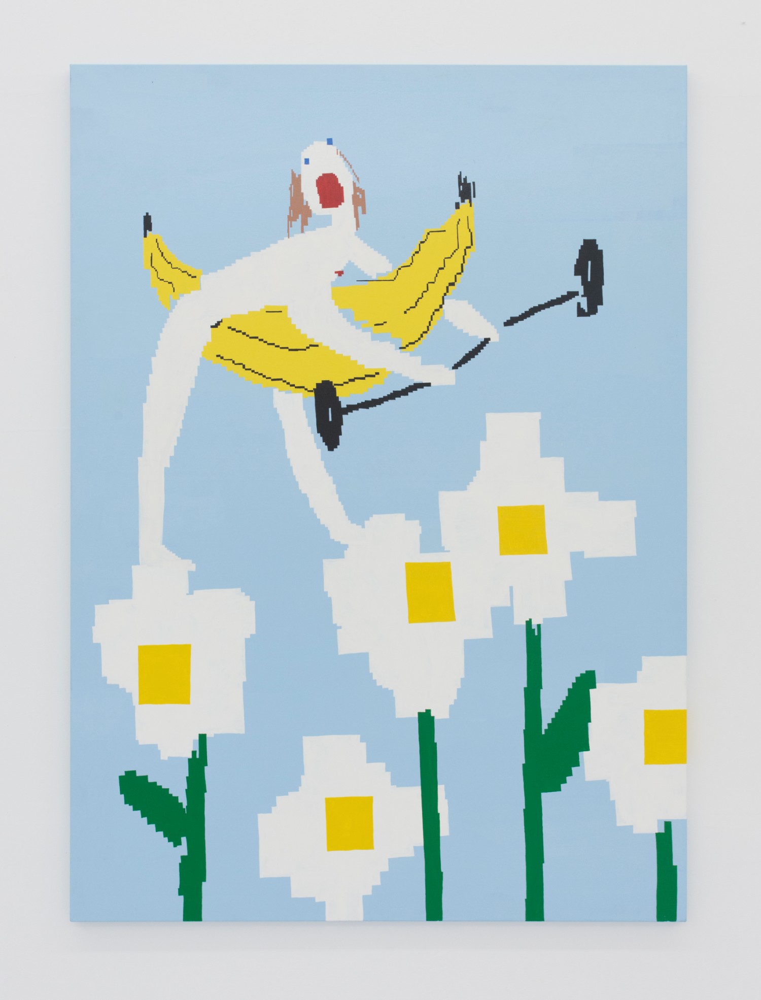 Works in this show take a flat approach to figuration (though we couldn’t call the show “Flatlands” because the Whitney show just did) and this abuttment of areas of color to produce the figure here is both rudimentary and nuanced. Maja Djordjevic (b. 1990 Serbia) paints large oil paintings that look like quick MS Paint sketch ups. The women have blue squares for eyes, a scribble of yellow for hair and a big jaggedy red mouth, always yelling. Though abject as anything I’ve ever seen, the paintings inexplicably have positive titles, as in the above, “Be Happy — I Love You”.
