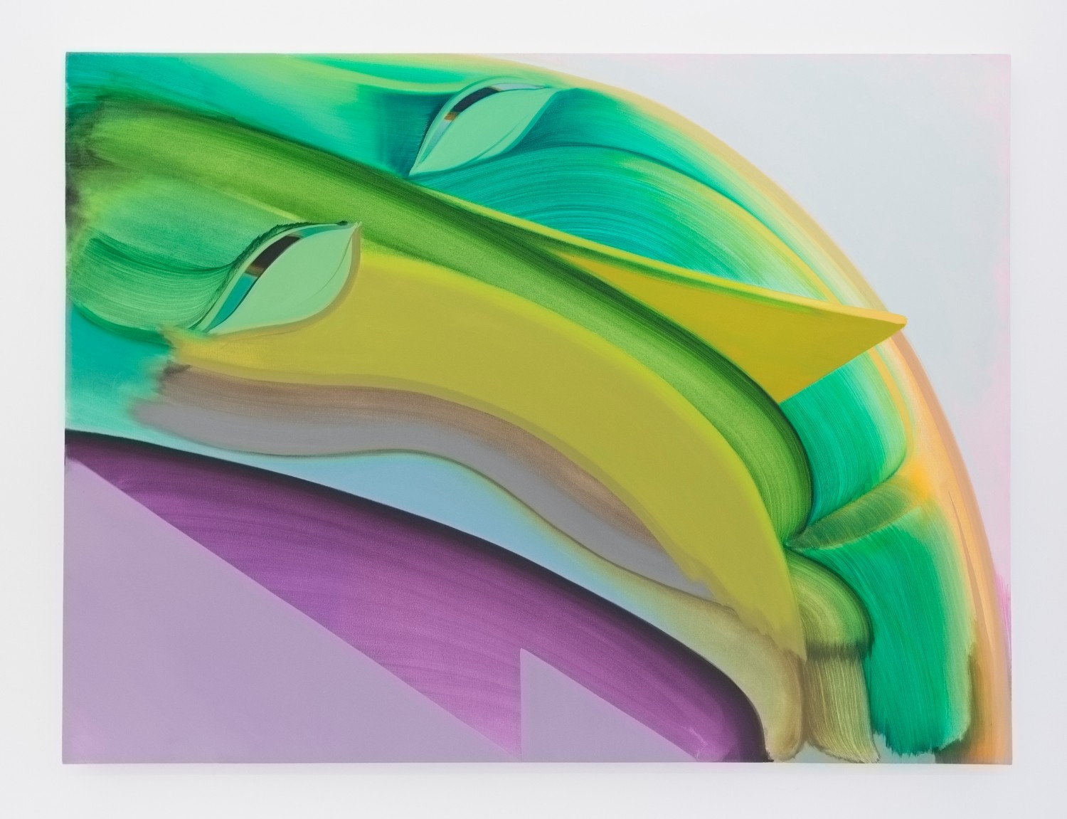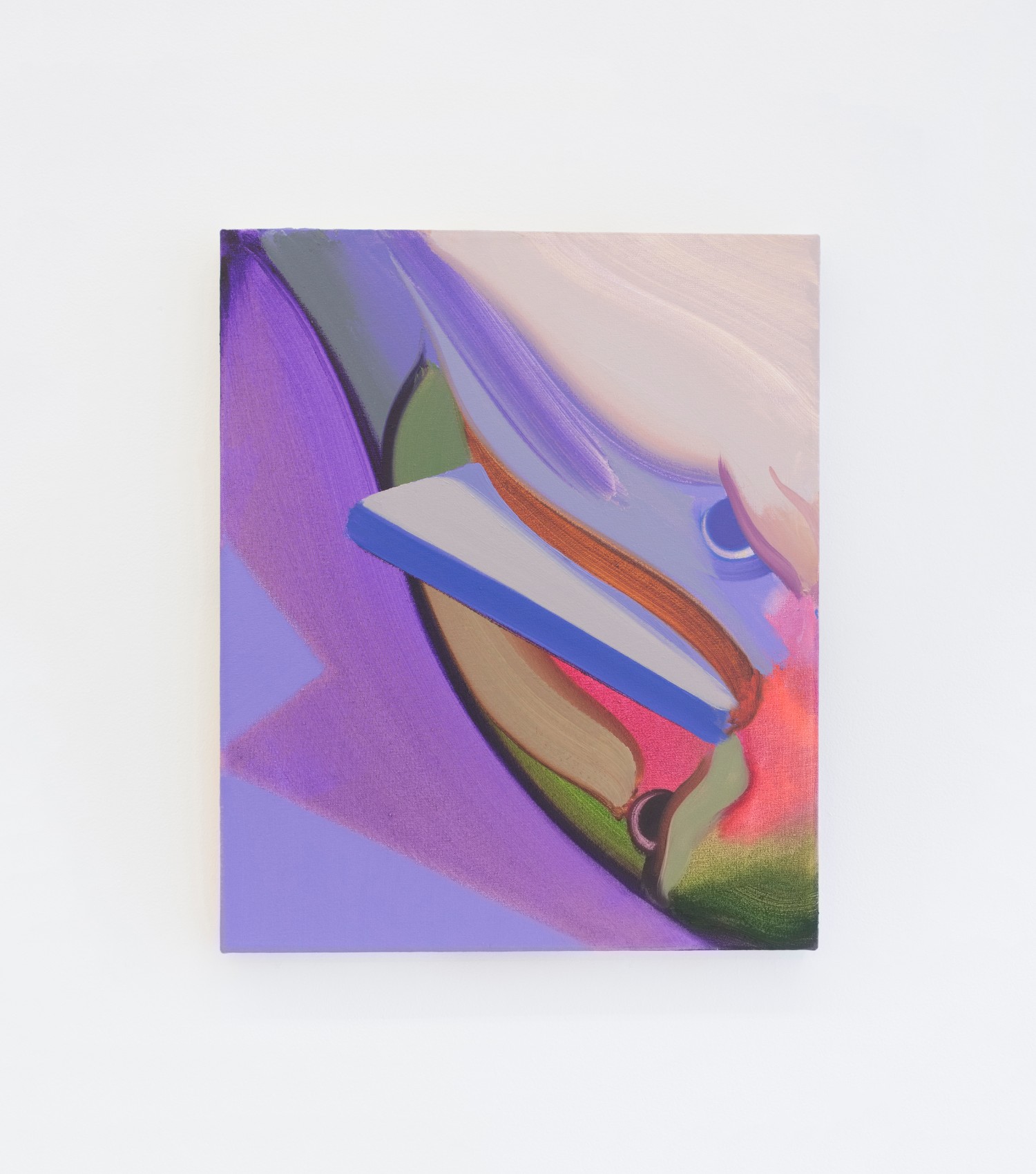 Lastly, Anja Salonen (b. 1994 LA) literalizes the push between figuration and flatness by including both in her expansive painting. Three fleshed-out figures of blended oil paint sit in a flat landscape with a canvas draped over one of them, on which a flat colored face is painted. Perhaps the most psychological work in the show–tho it has some competition in the “disturbed” department–the puzzlement on the foreground figure’s face just about covers it for me.