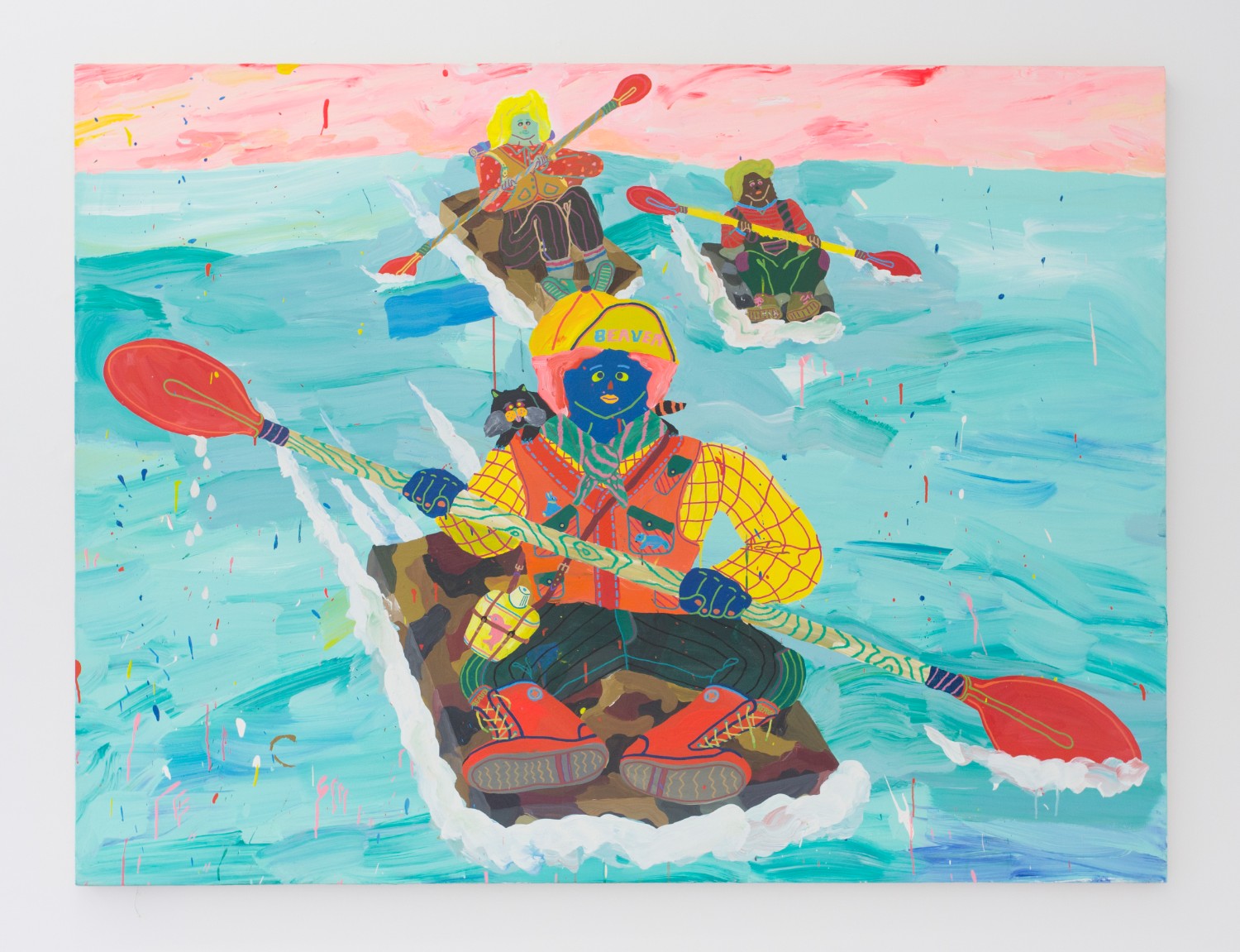 Misaki Kawai (b. 1978 Japan) gives us a hunting scene and a white water rafting scene, plus animals. These paintings come from a series of works that use matte medium to paste in areas of painted paper and fabric to make figures of creative skin tone and upended palette. From abstract brushy backgrounds down to meticulous detailed accoutrements, her summer campers are outfitted for some bizarro recreation.