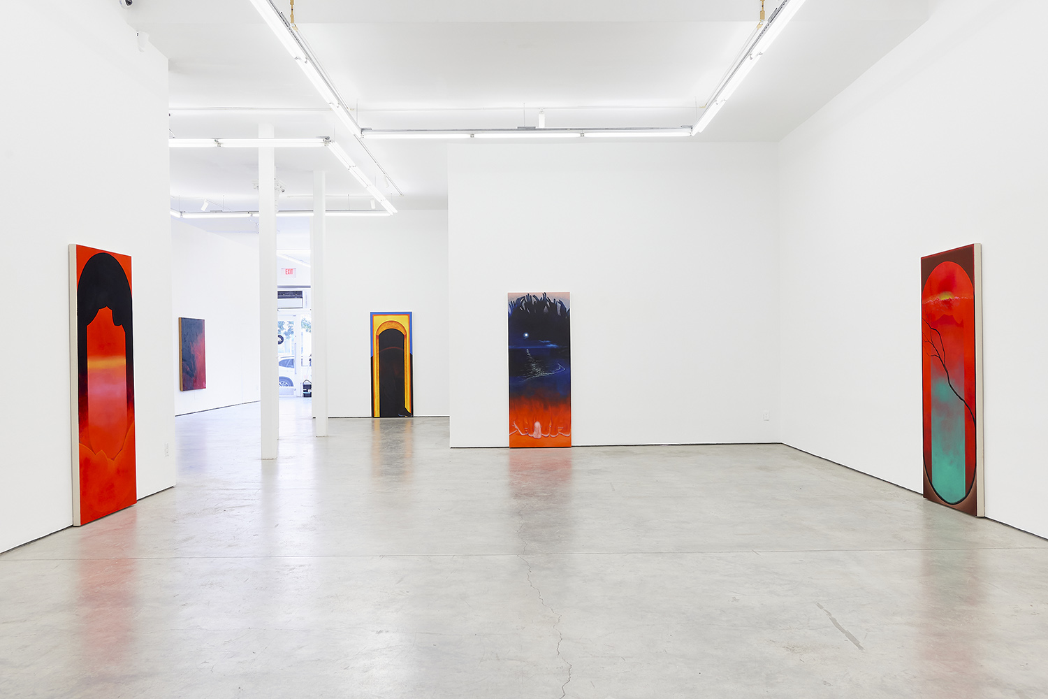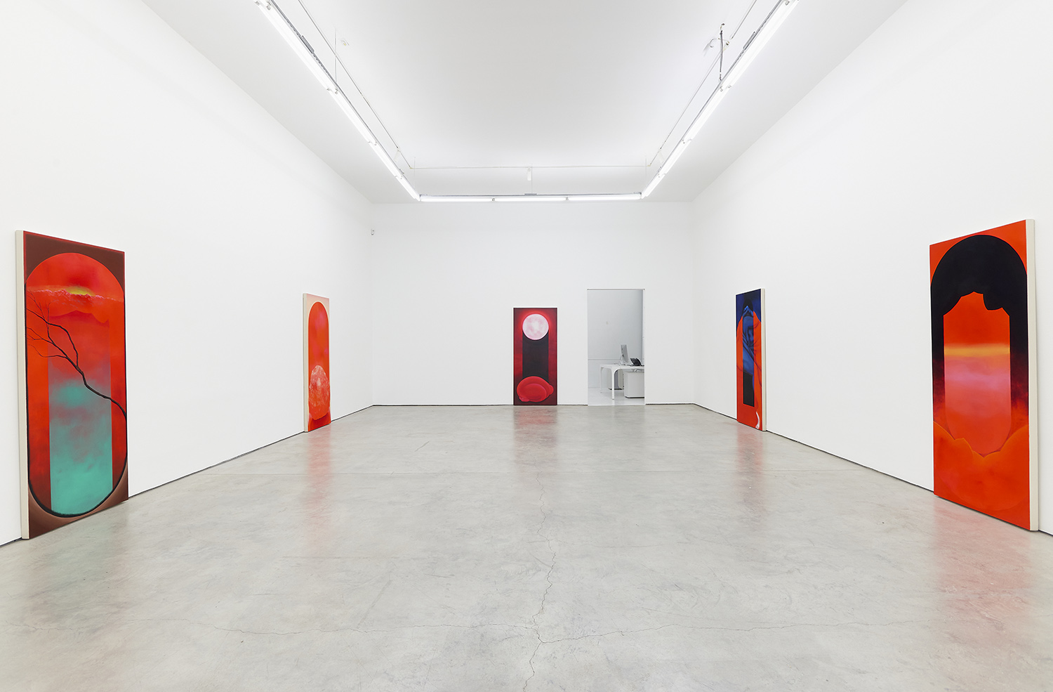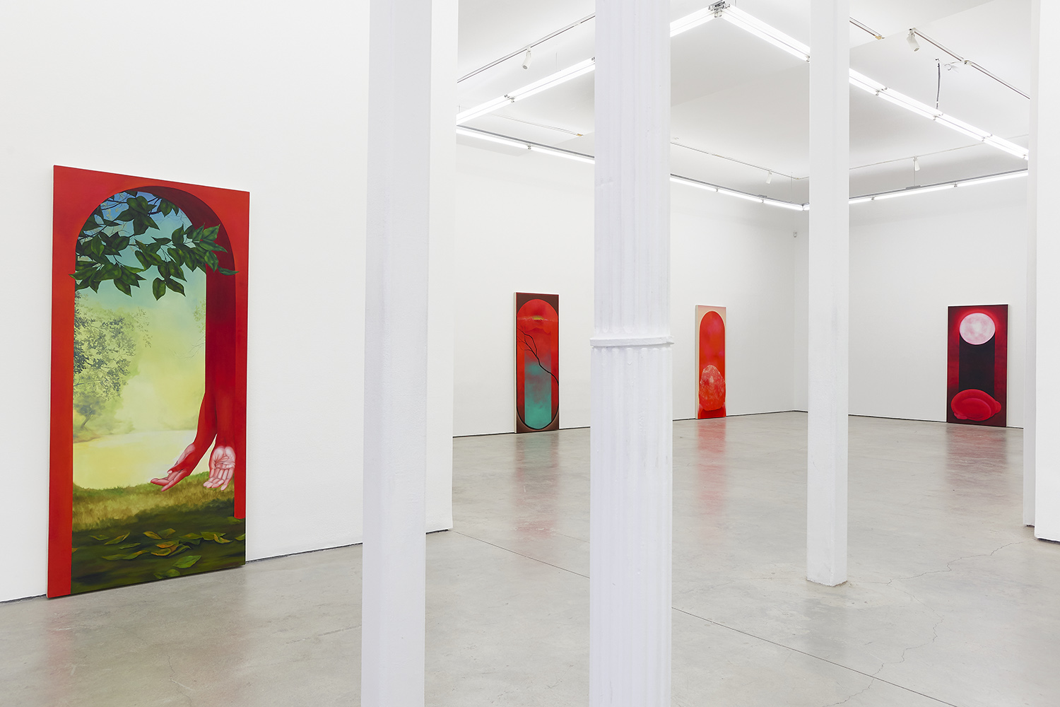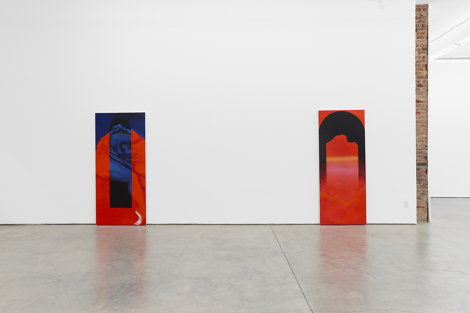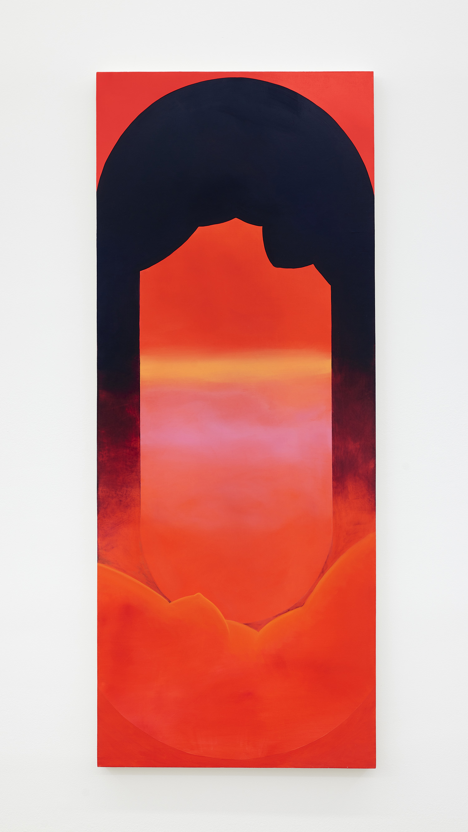 In The Body Knows Its Door, Williams employs a new method of framing using the standard measurements of a door (approx. 80×32-36 inches) to create nine surreal depictions of human experiences. The series depicts the bent or stooped body as both an anchor and passageway, supporting the dual forces of internal reality and the physical world. Rendered in her signature red palette with waves of temperate cool tones, Williams develops expansive emotional landscapes, evoking ambulance sirens, pools of water, dried foliage, and smoky terrain. Her colors signify psychological states of wonderment, anxiety, woundedness and beyond.