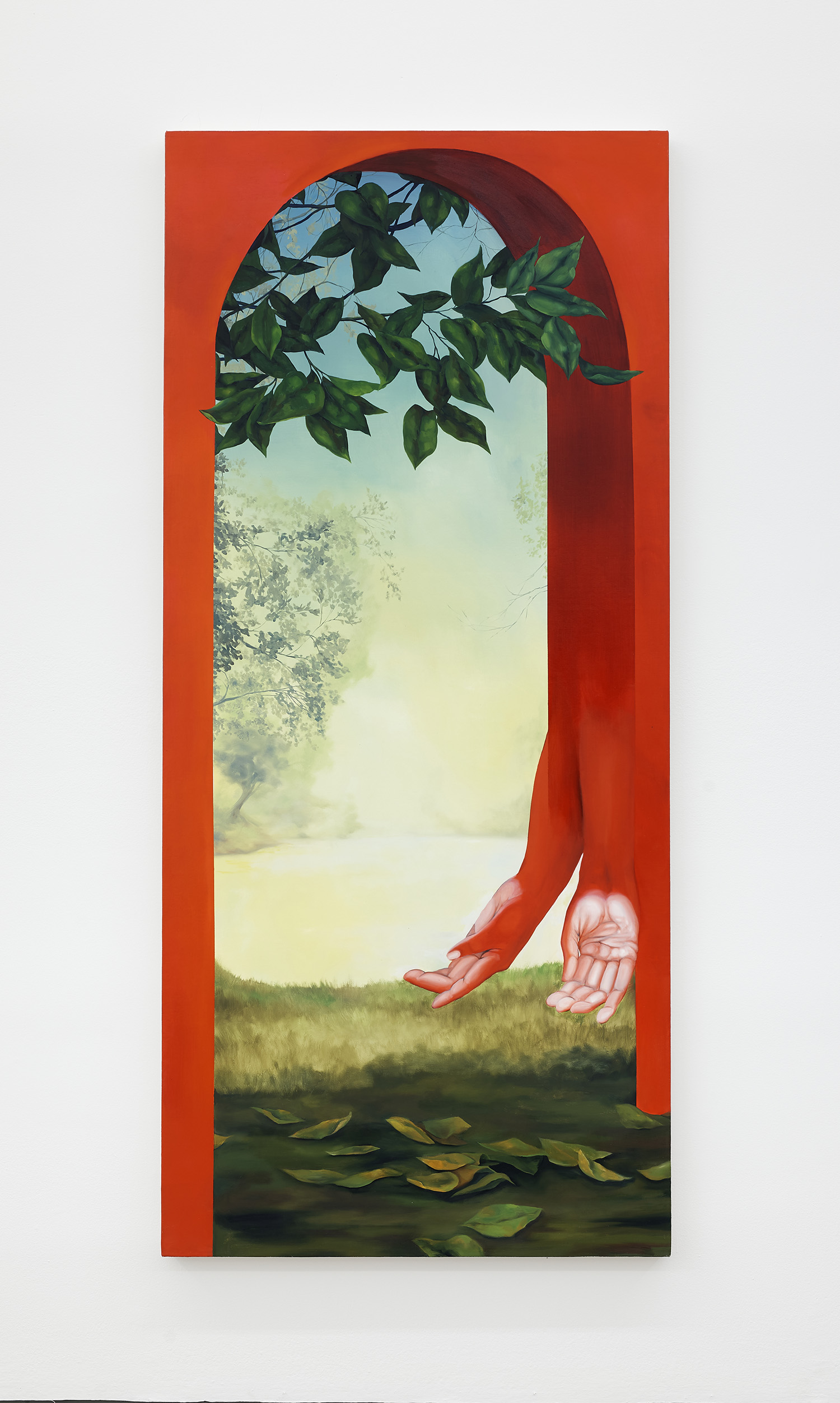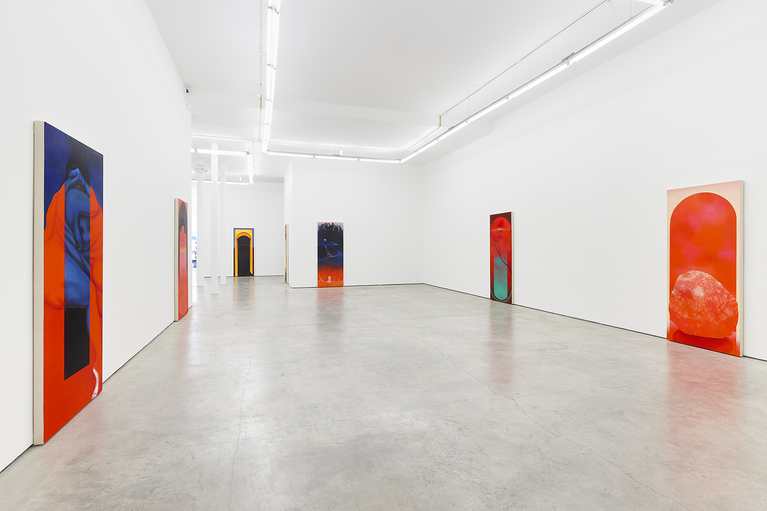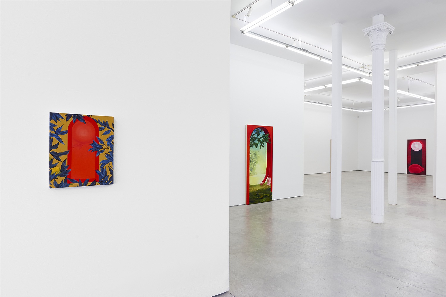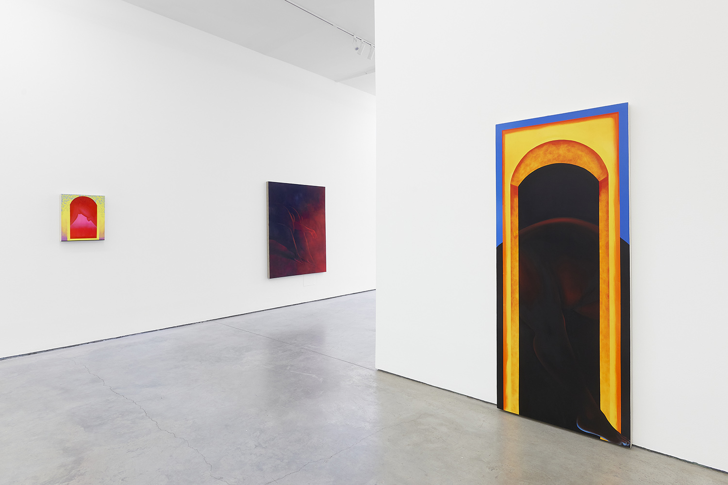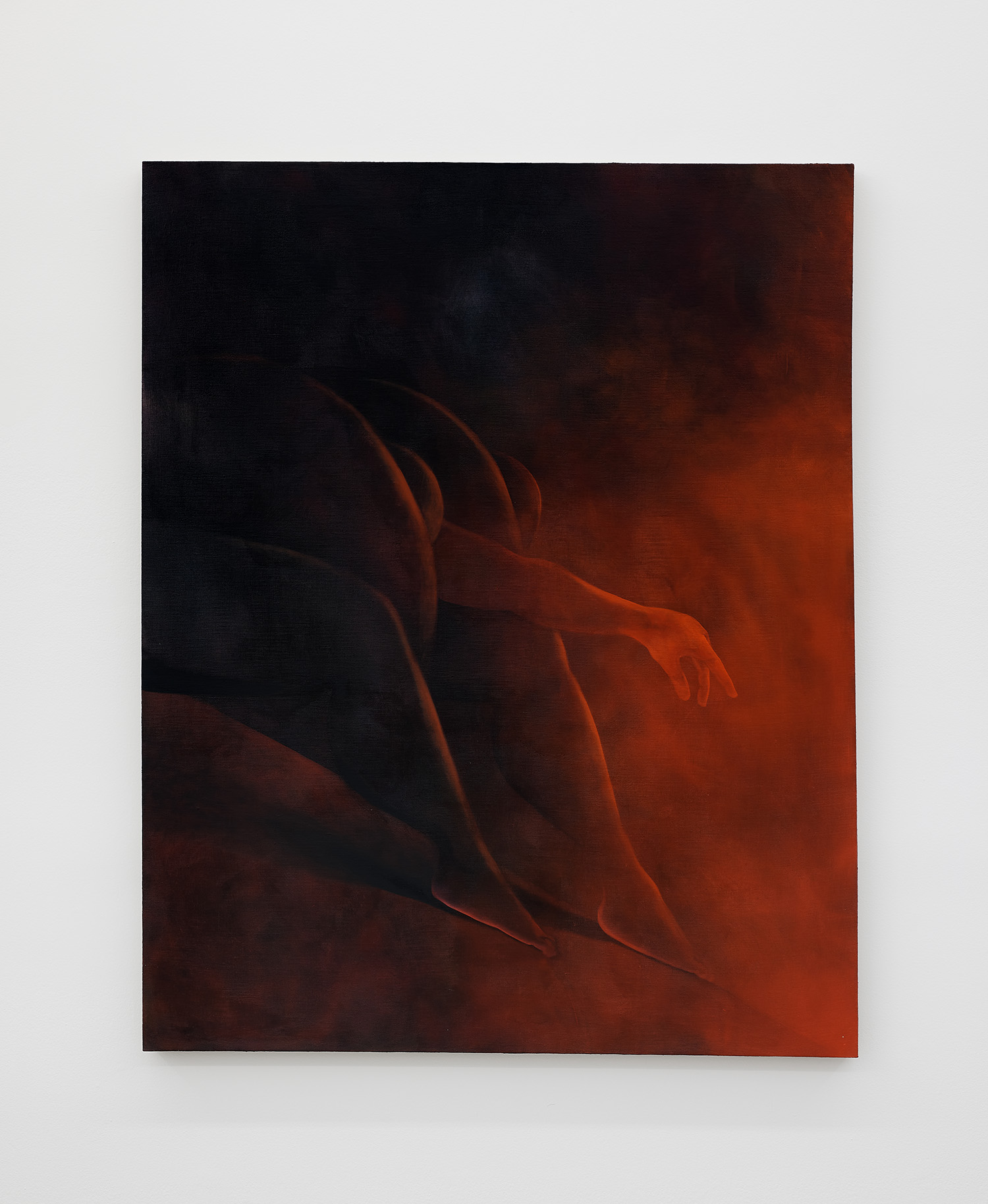 In The Body Knows Its Door, Williams employs a new method of framing using the standard measurements of a door (approx. 80×32-36 inches) to create nine surreal depictions of human experiences. The series depicts the bent or stooped body as both an anchor and passageway, supporting the dual forces of internal reality and the physical world. Rendered in her signature red palette with waves of temperate cool tones, Williams develops expansive emotional landscapes, evoking ambulance sirens, pools of water, dried foliage, and smoky terrain. Her colors signify psychological states of wonderment, anxiety, woundedness and beyond.