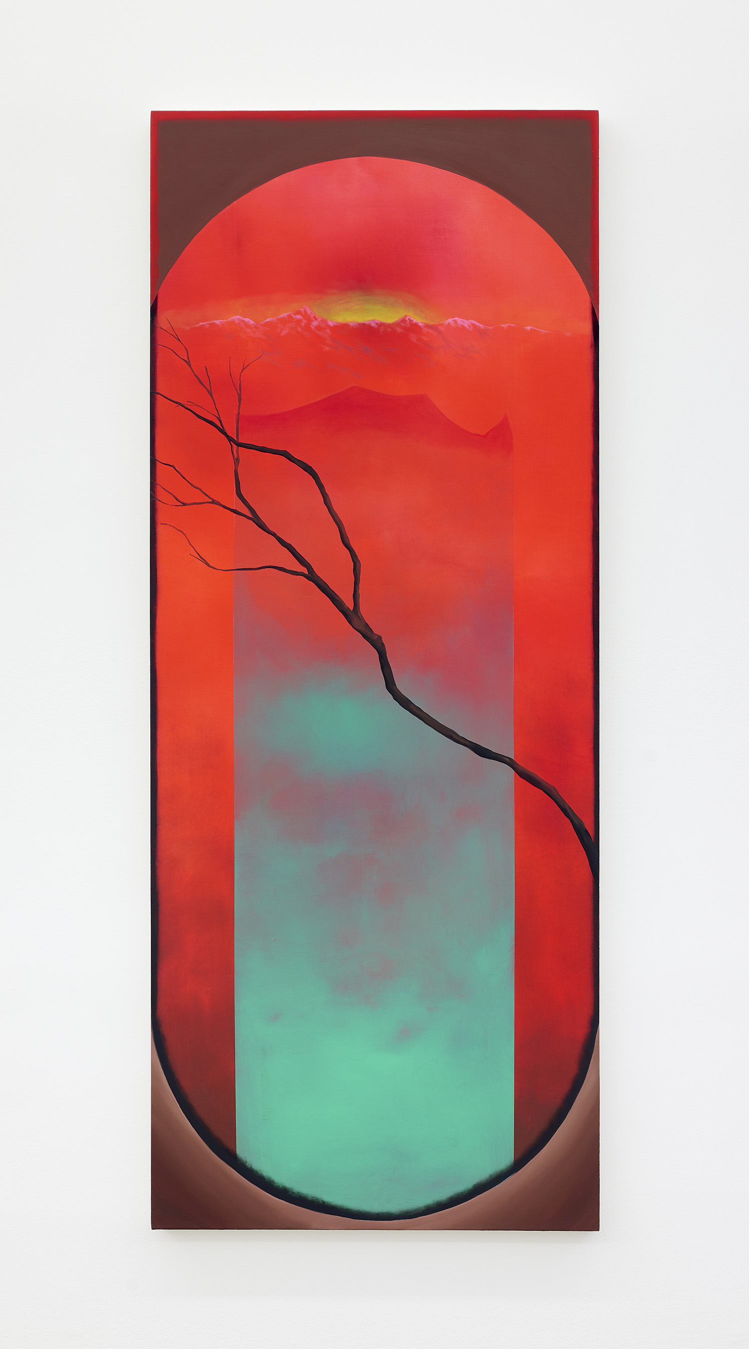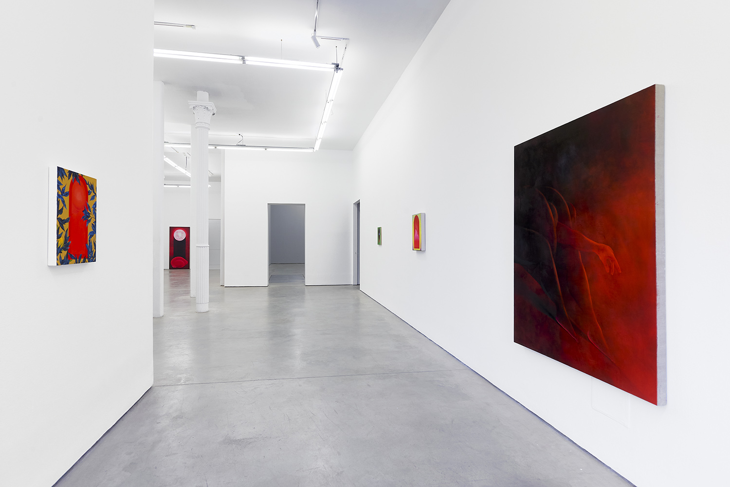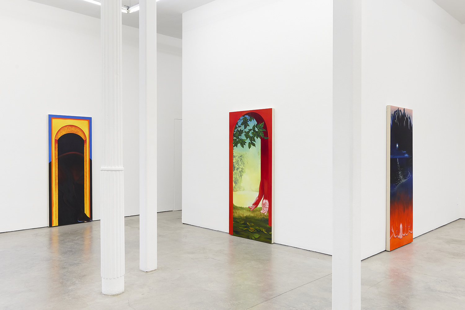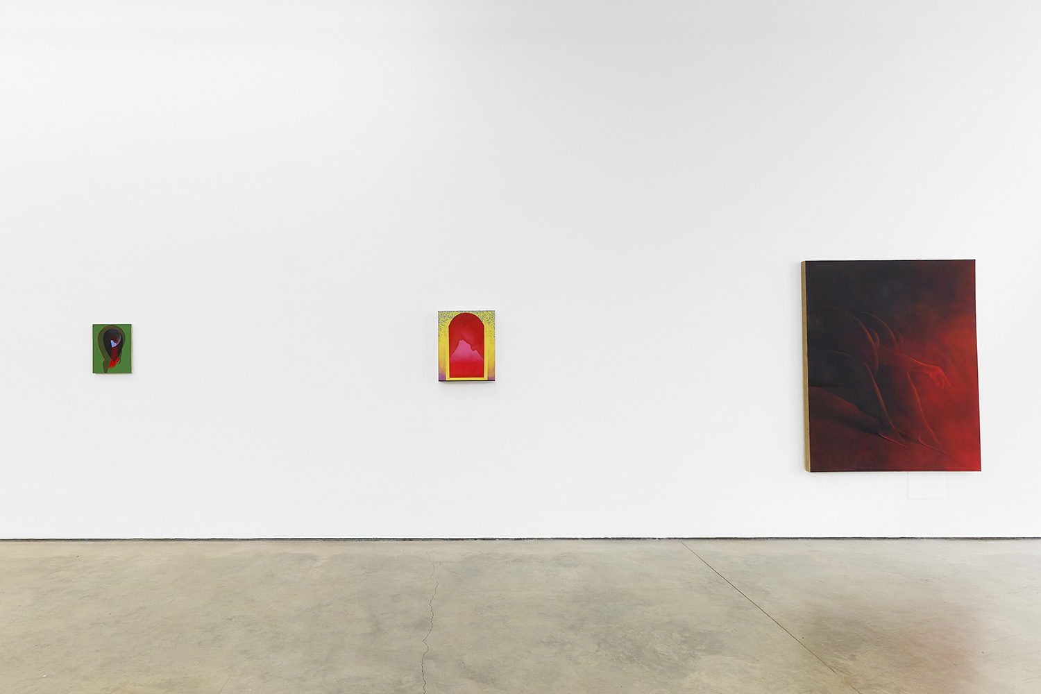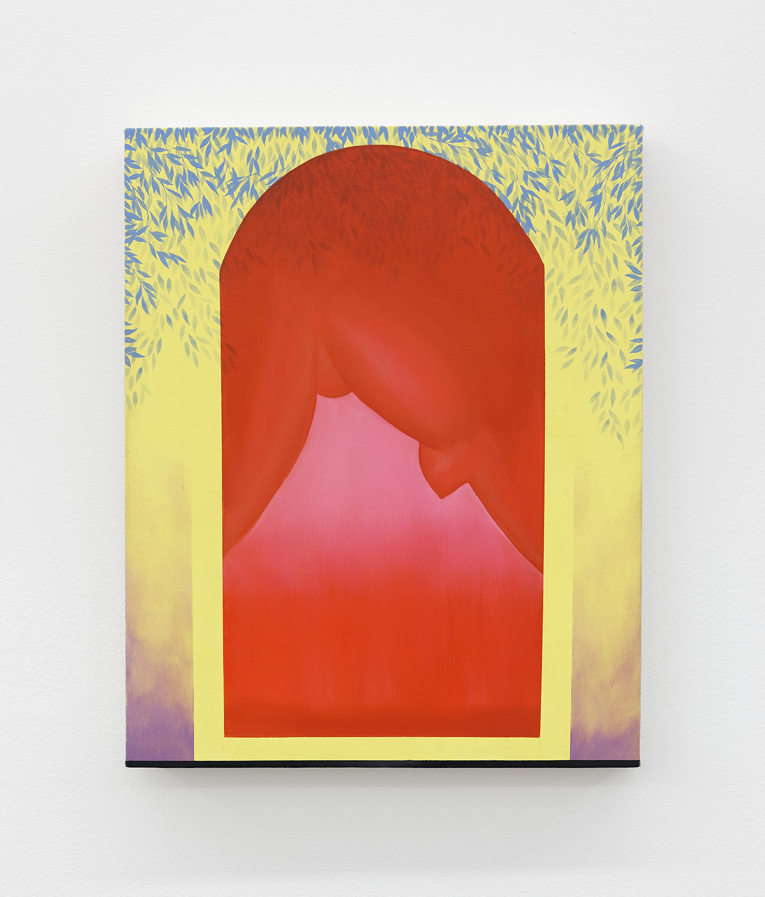 In The Body Knows Its Door, Williams employs a new method of framing using the standard measurements of a door (approx. 80×32-36 inches) to create nine surreal depictions of human experiences. The series depicts the bent or stooped body as both an anchor and passageway, supporting the dual forces of internal reality and the physical world. Rendered in her signature red palette with waves of temperate cool tones, Williams develops expansive emotional landscapes, evoking ambulance sirens, pools of water, dried foliage, and smoky terrain. Her colors signify psychological states of wonderment, anxiety, woundedness and beyond.