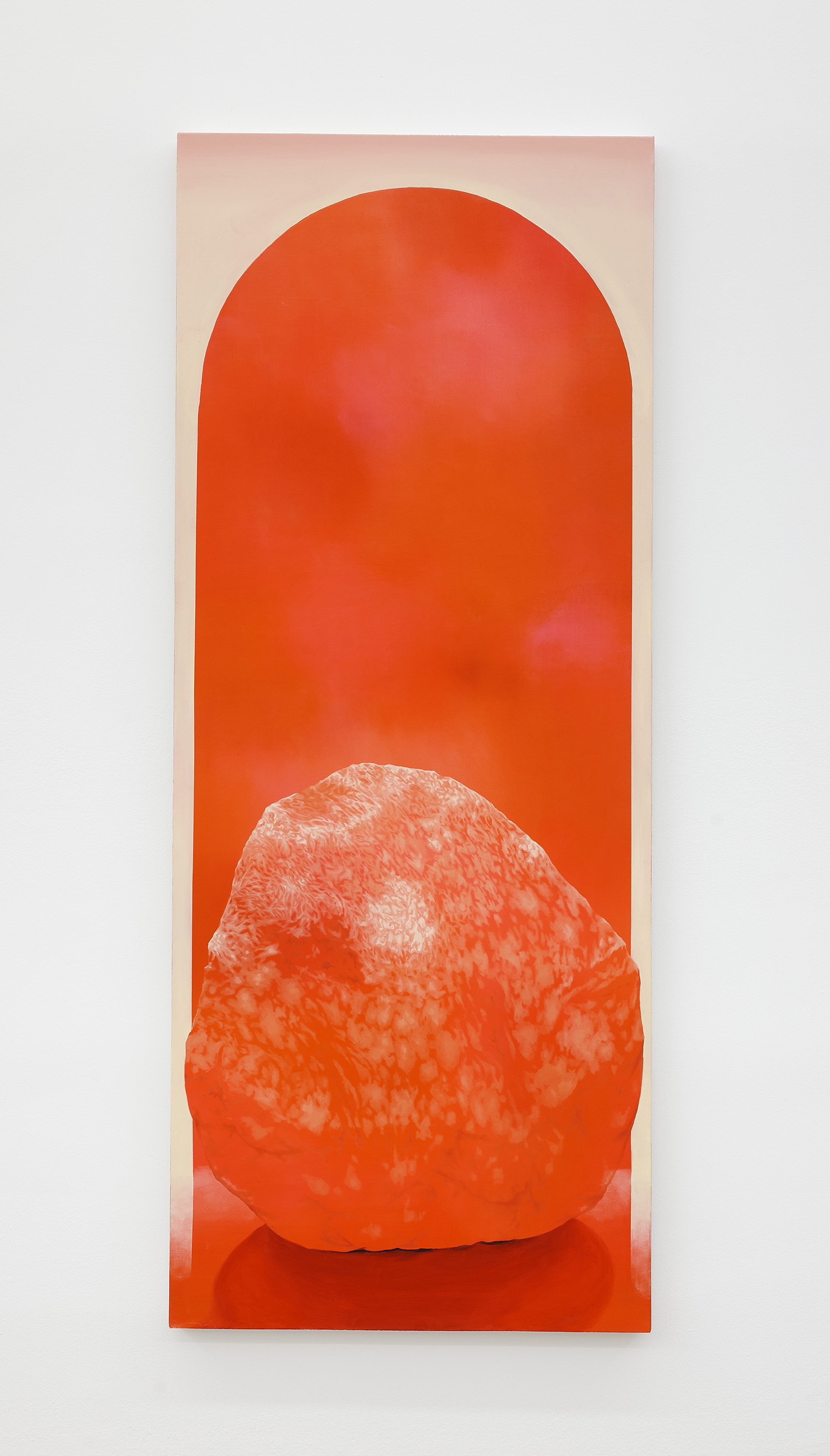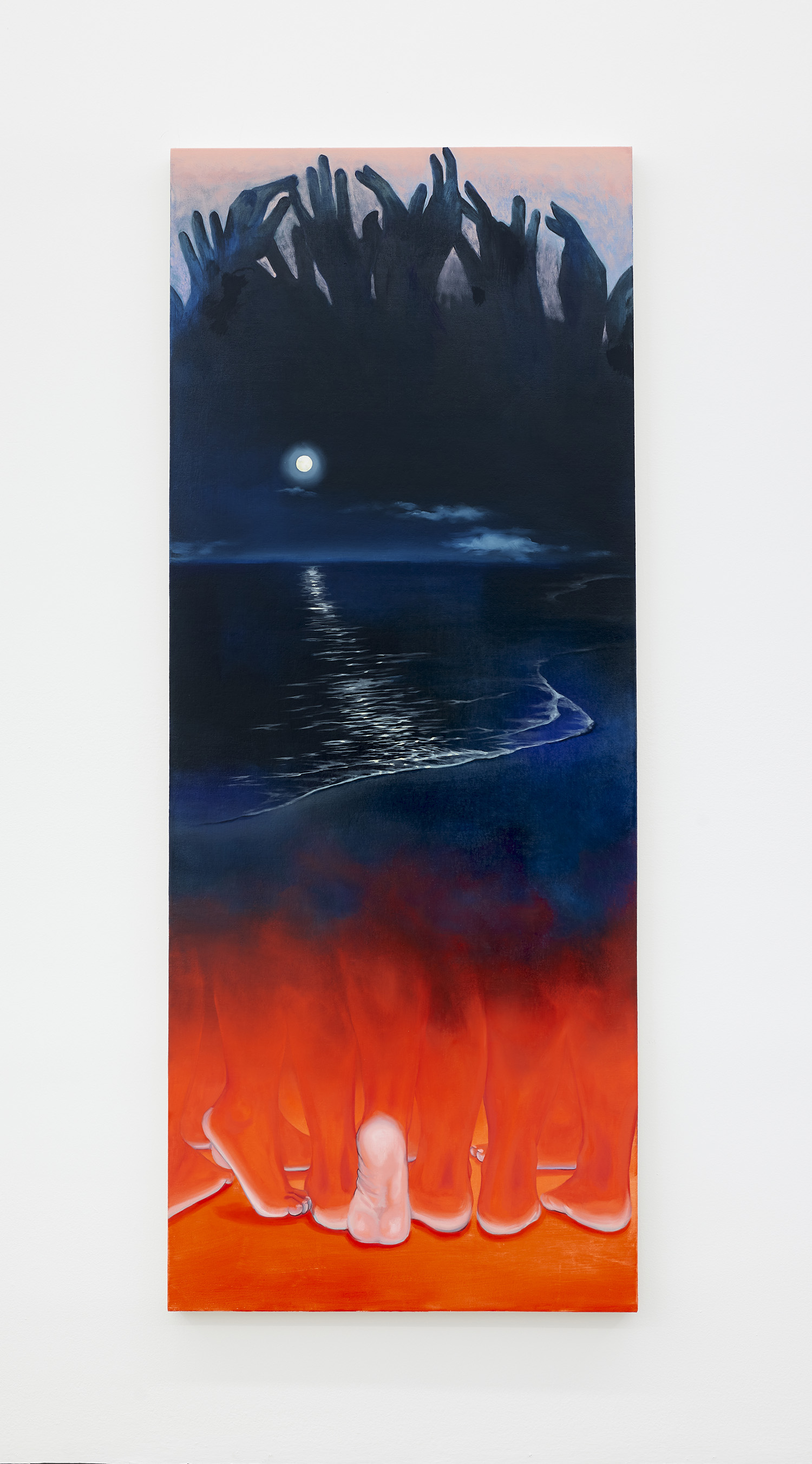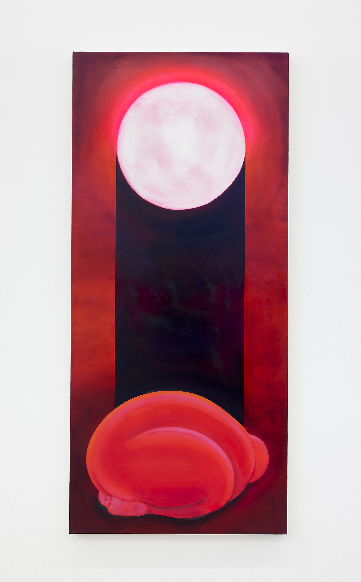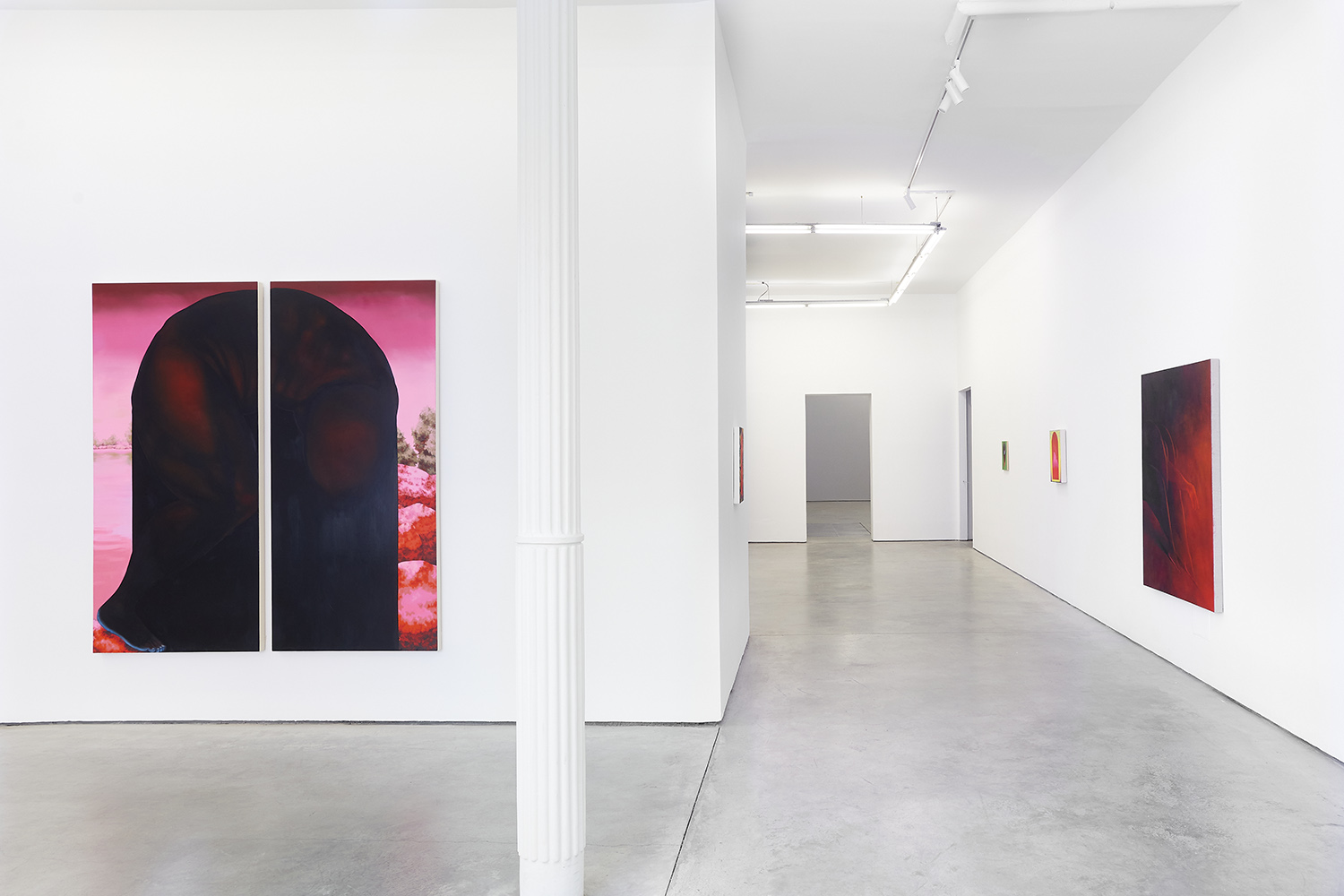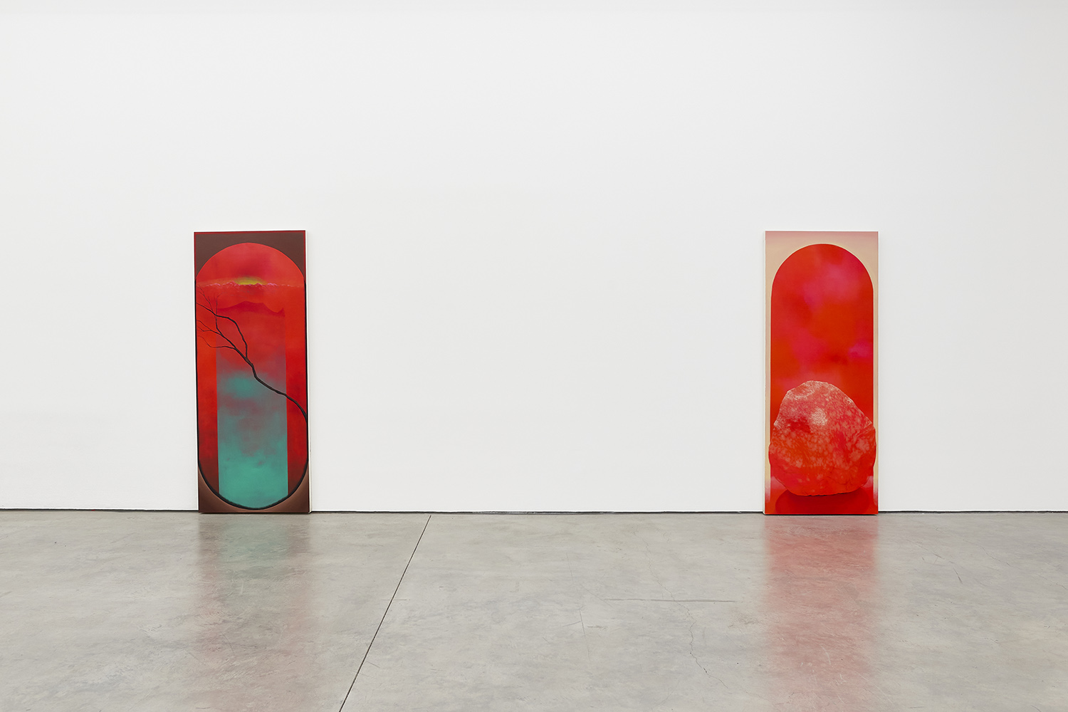 In The Body Knows Its Door, Williams employs a new method of framing using the standard measurements of a door (approx. 80×32-36 inches) to create nine surreal depictions of human experiences. The series depicts the bent or stooped body as both an anchor and passageway, supporting the dual forces of internal reality and the physical world. Rendered in her signature red palette with waves of temperate cool tones, Williams develops expansive emotional landscapes, evoking ambulance sirens, pools of water, dried foliage, and smoky terrain. Her colors signify psychological states of wonderment, anxiety, woundedness and beyond.