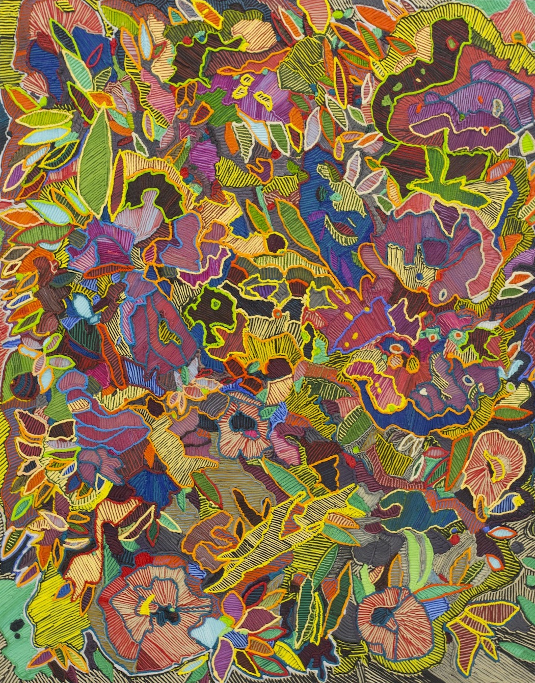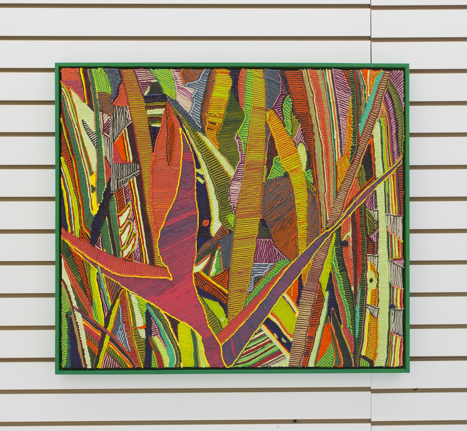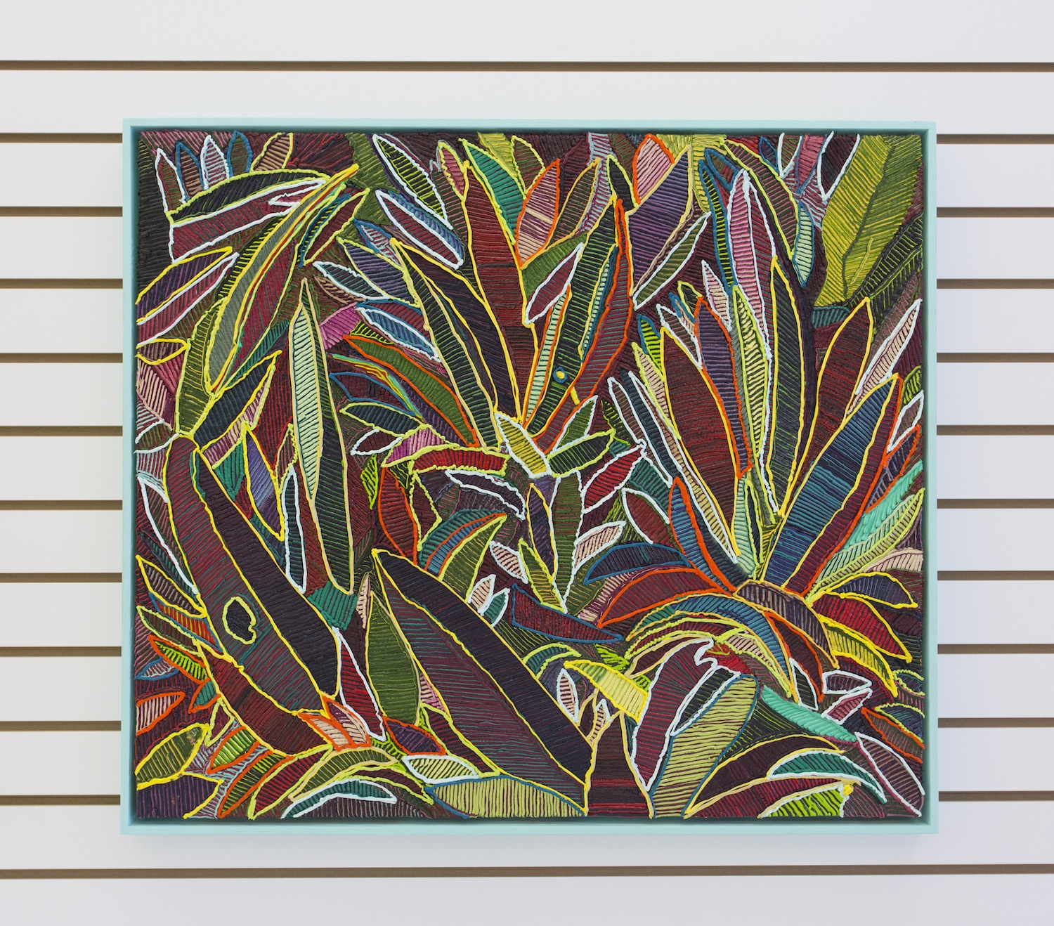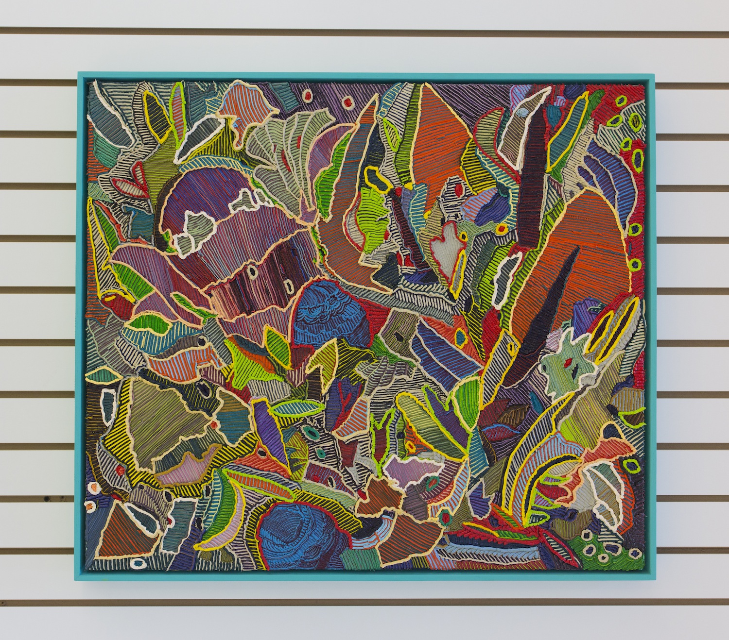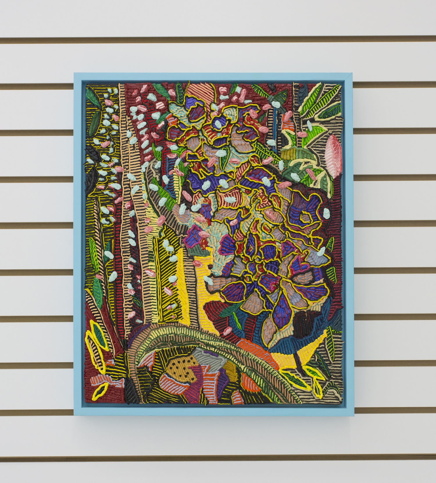 Dispensing paint through a pastry tube with varying nibs, Larsen is able to line, layer and weave colors together, sometimes blending them within the same extrusion. This technique can produce a variety of effects, from 8-bitish pointillism in the weaves, to a sort of jewel-like sculptural relief in the plants, or a tessellated warping mesh grid in the lined hybrid works. The pieces are composed either in a wonky top-down, left-to-right layering or a block-by-block patterning that is more articulated edges and paint-by-numbers.