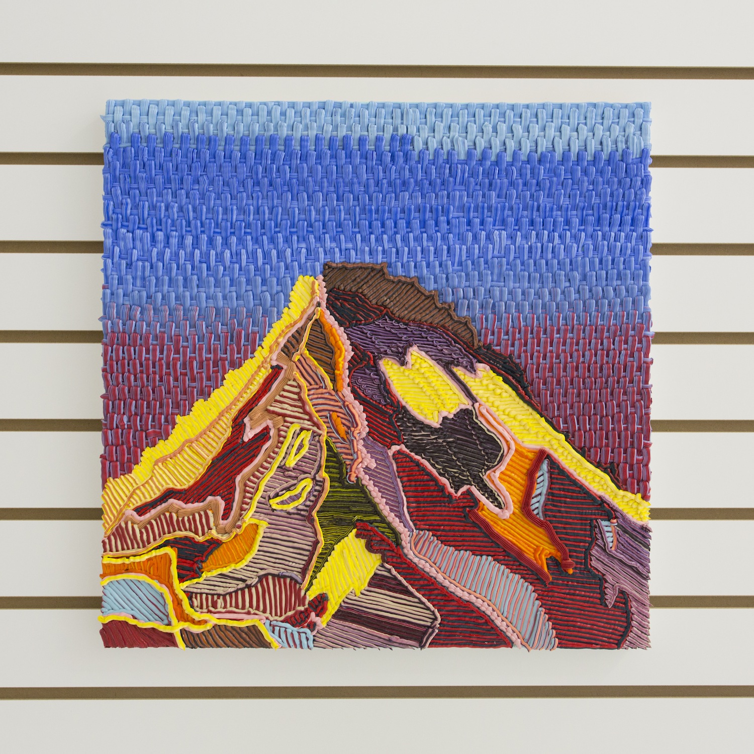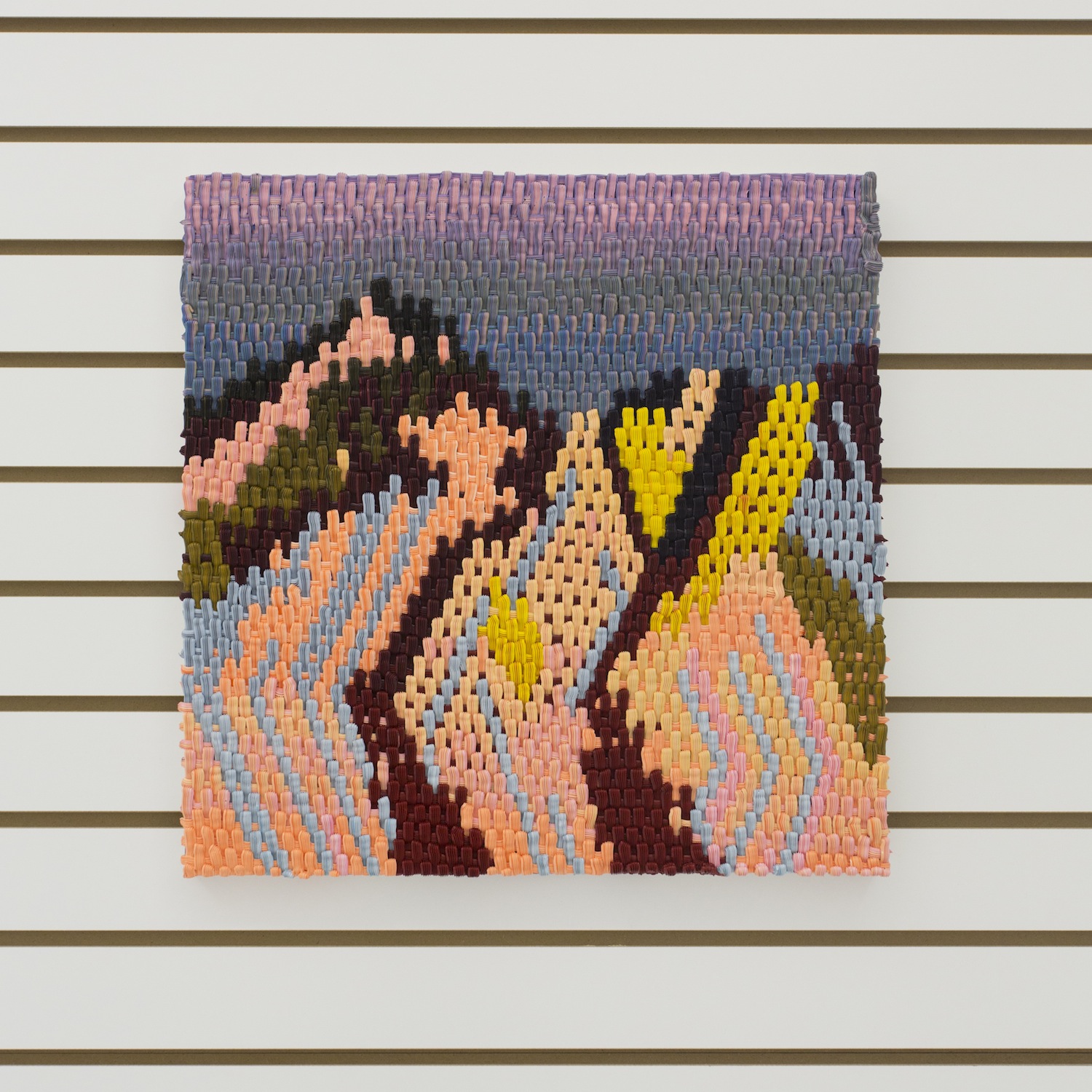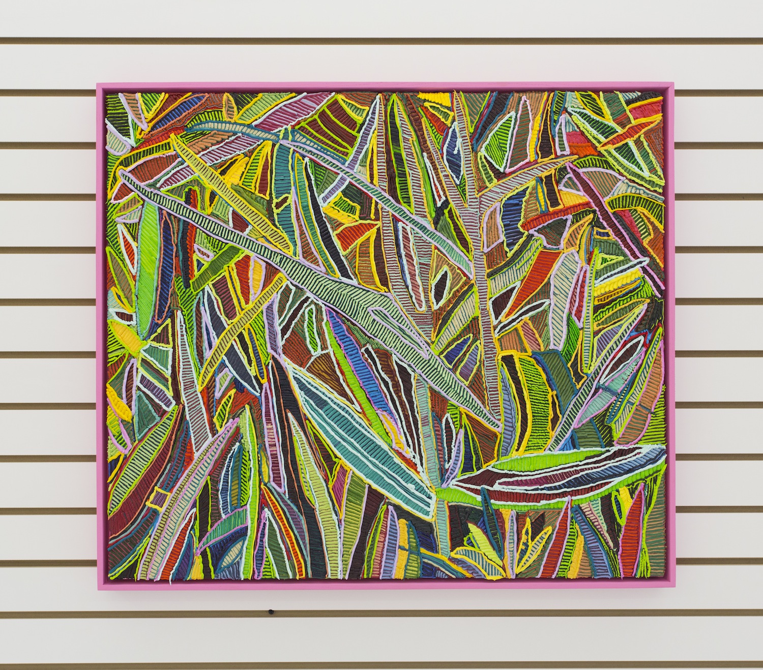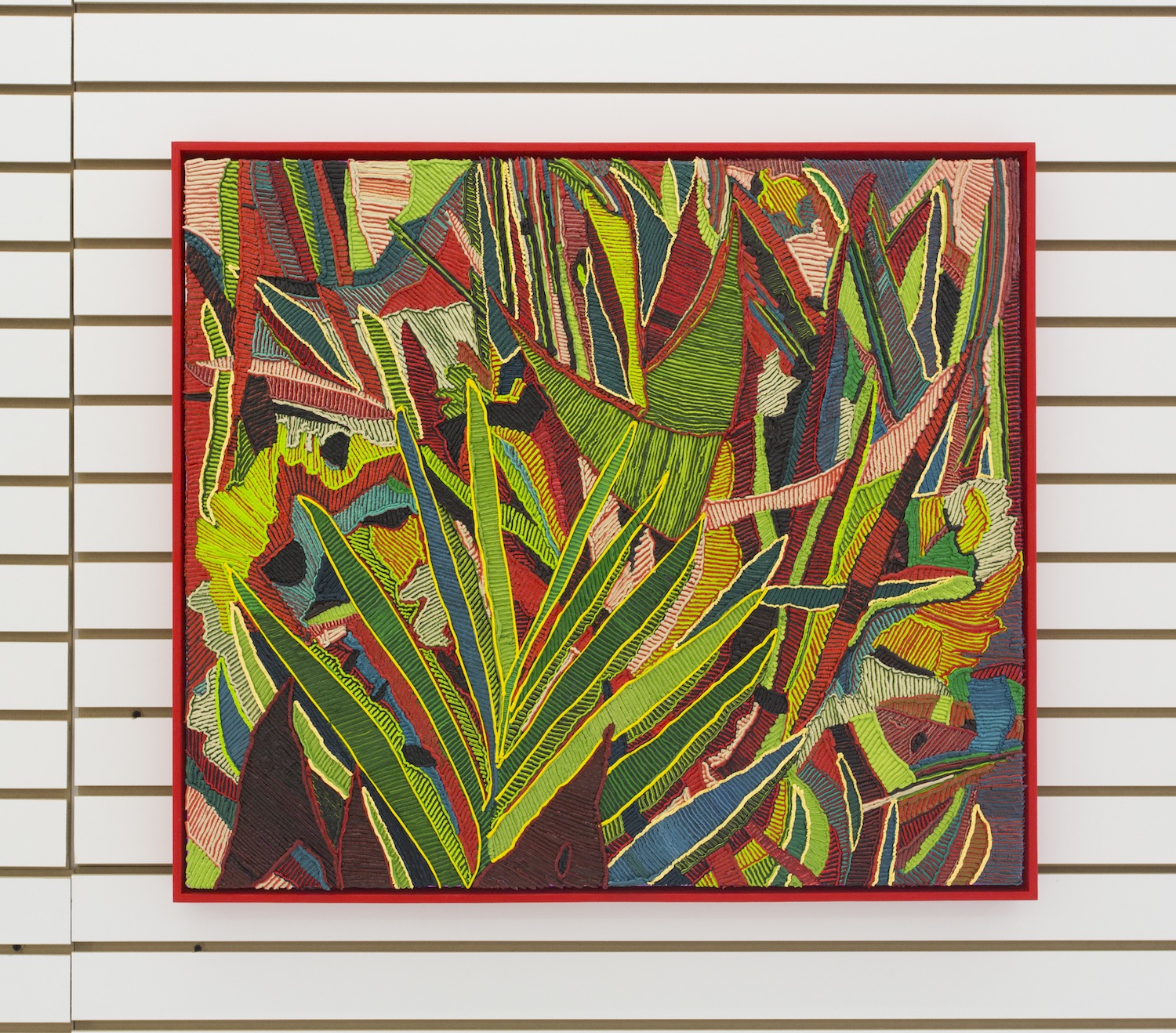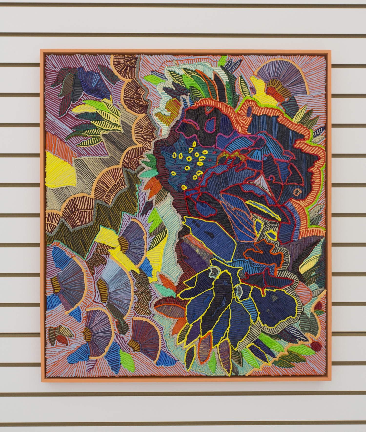 Dispensing paint through a pastry tube with varying nibs, Larsen is able to line, layer and weave colors together, sometimes blending them within the same extrusion. This technique can produce a variety of effects, from 8-bitish pointillism in the weaves, to a sort of jewel-like sculptural relief in the plants, or a tessellated warping mesh grid in the lined hybrid works. The pieces are composed either in a wonky top-down, left-to-right layering or a block-by-block patterning that is more articulated edges and paint-by-numbers.