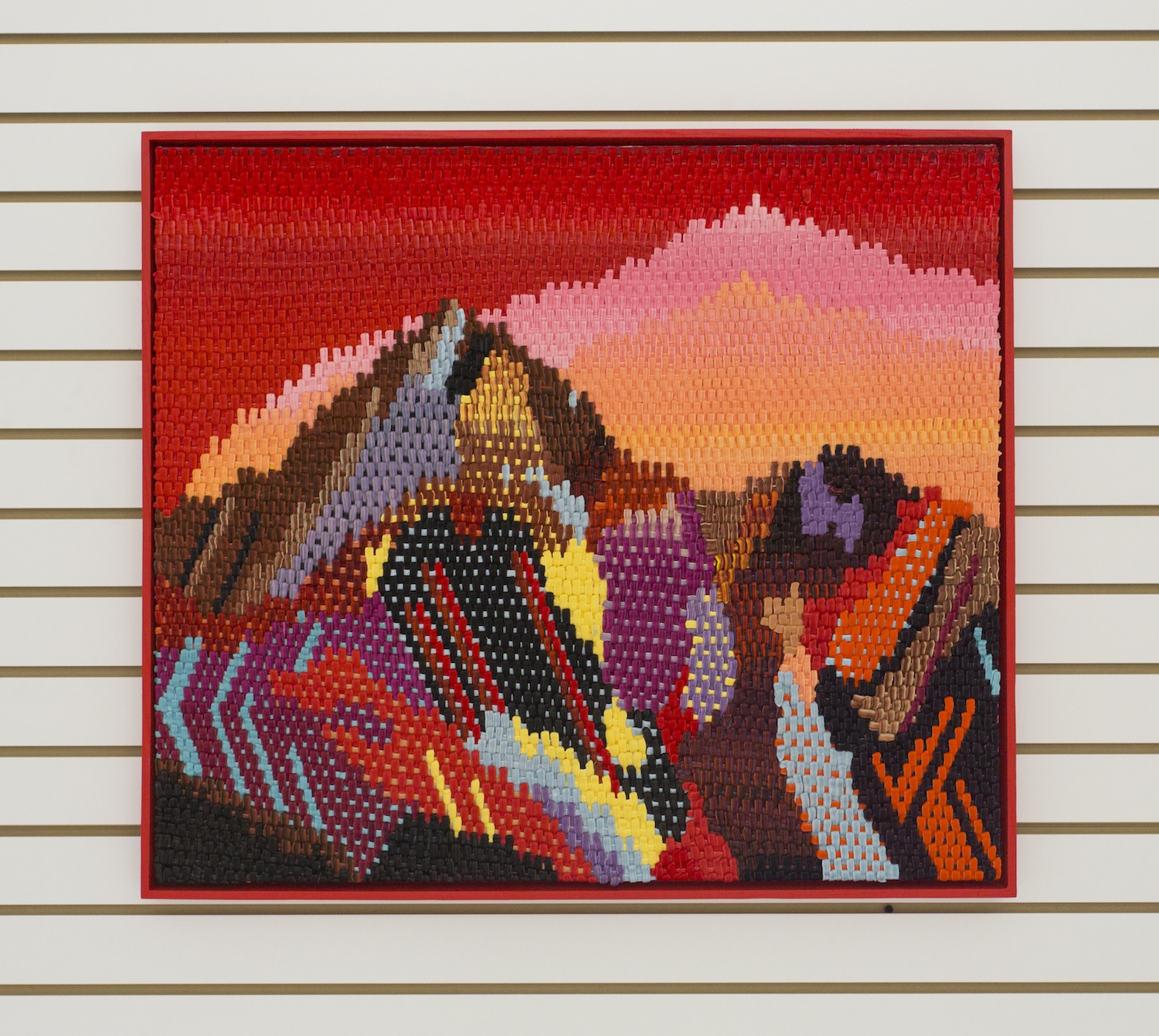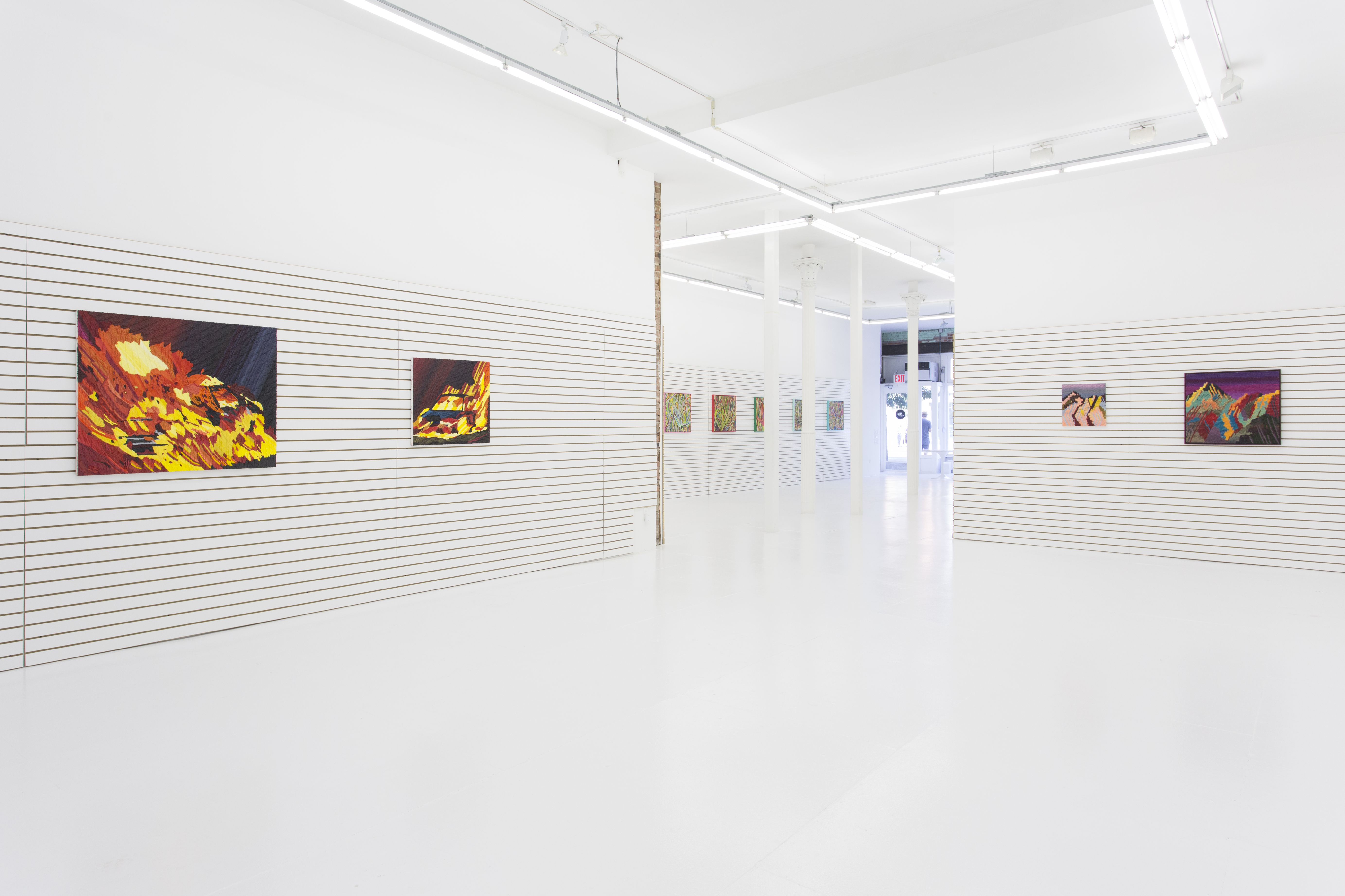 Their craftiness and kitchiness adds a layer of complication; the technique feels so lovingly homespun, so why did the artist spin a scene of fiery destruction for us? Is the appeal of a flaming box truck abstract or sincere? Over-articulated edges and hypersaturated colors make the paintings of flora hectic, psychedelic. The mountains are so crazy colored they look on fire with sunset, a postcard injected with saccharine, is that beautiful or beautified? As with the exhibition by Adam Parker Smith concurrently in Gallery 3, the viewer is asked to question their own notions of beauty and the real and the fake.