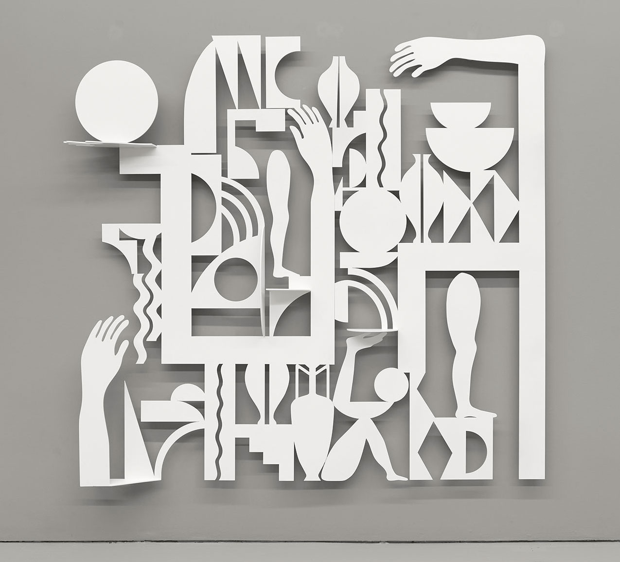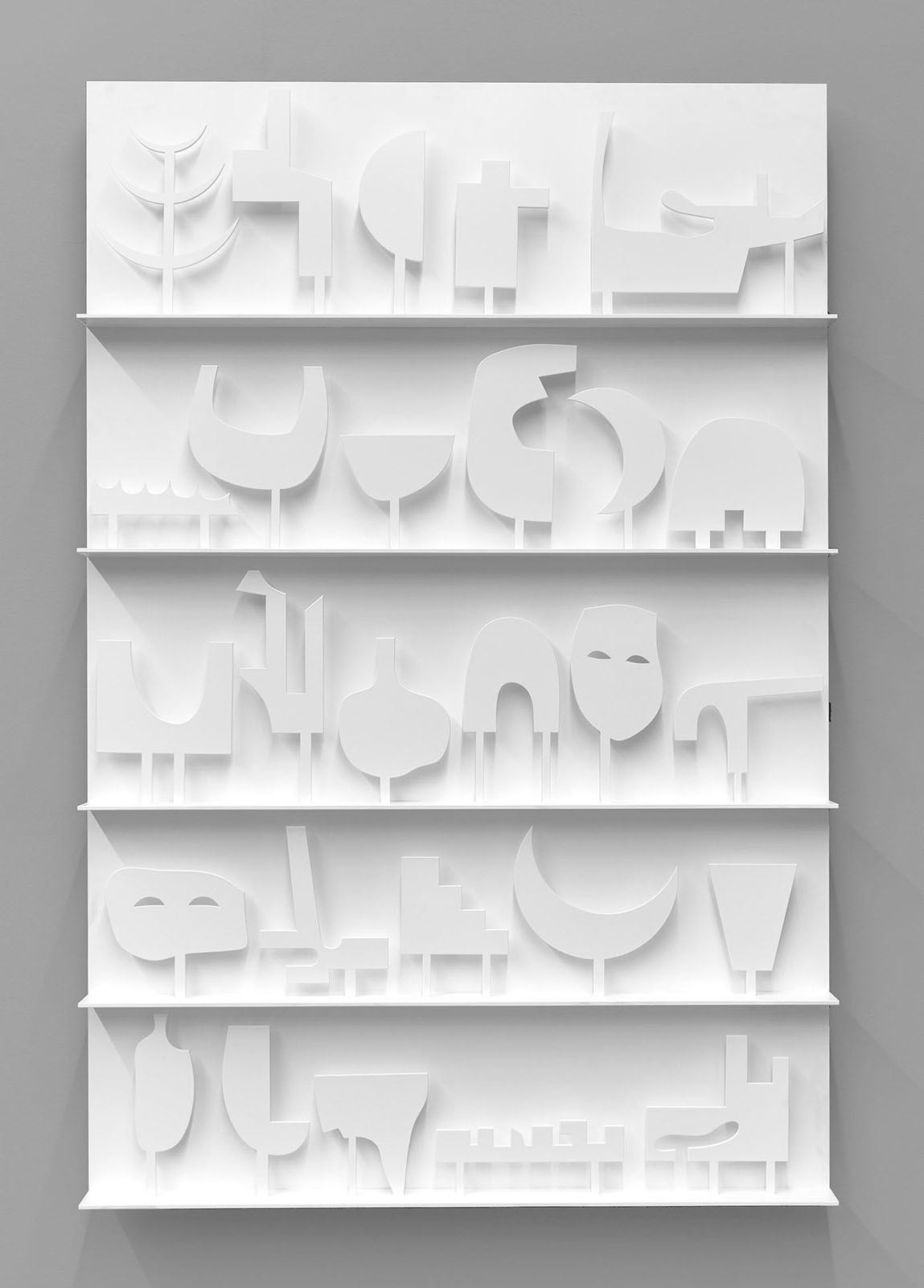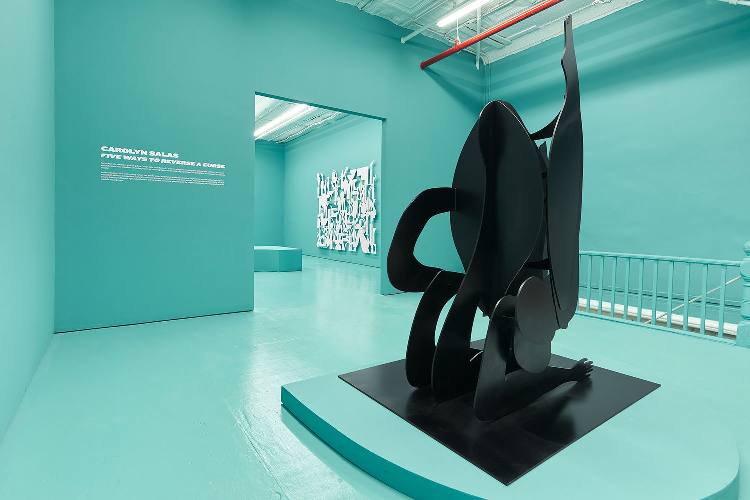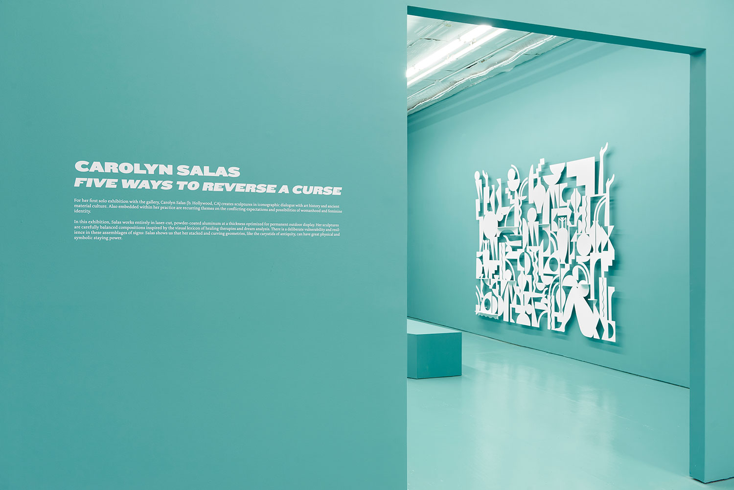 In this exhibition, Salas works entirely in laser-cut, powder-coated aluminum at a thickness optimized for permanent outdoor display. Her sculptures are carefully balanced compositions inspired by the visual lexicon of healing therapies and dream analysis. There is a deliberate vulnerability and resilience in these assemblages of signs: Salas shows us that her stacked and curving geometries, like the caryatids of antiquity, can have great physical and symbolic staying power.