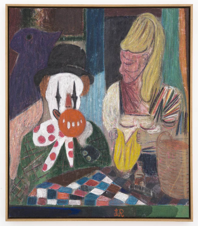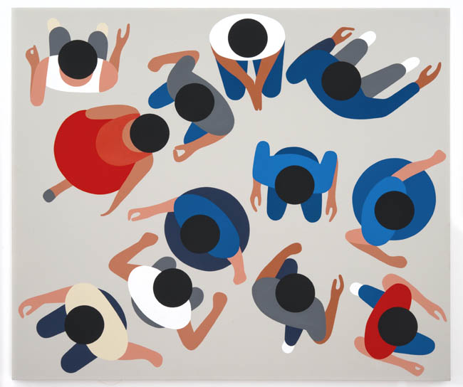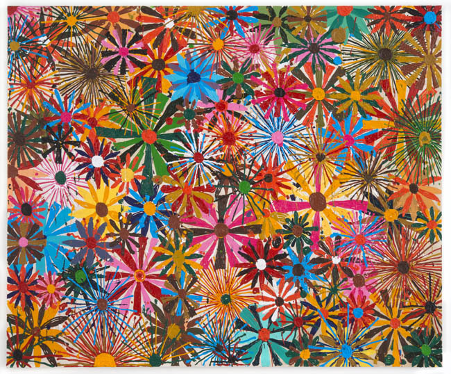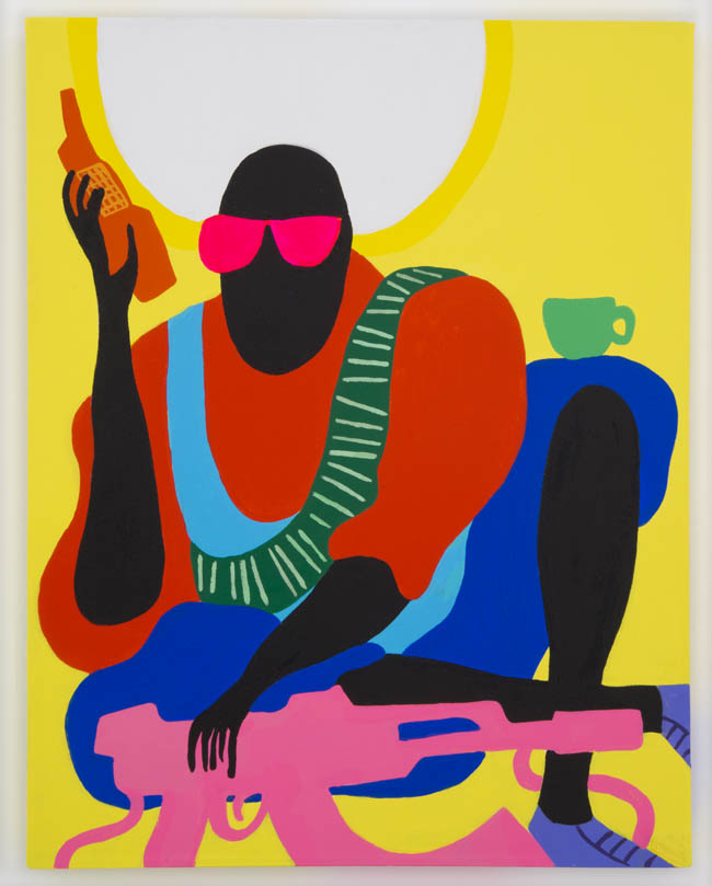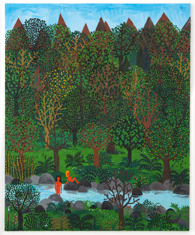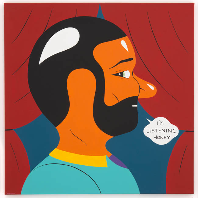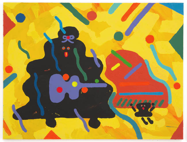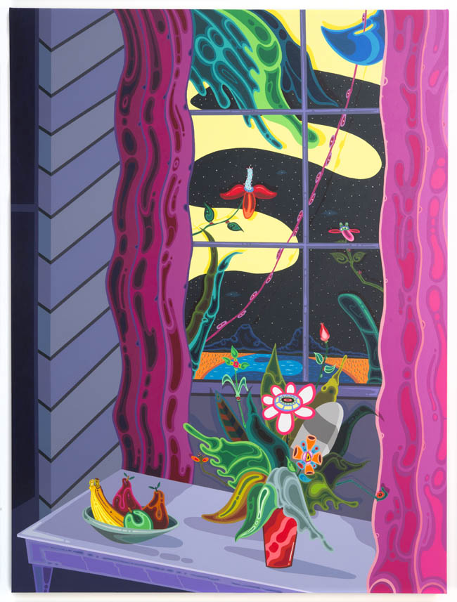 As opposed to creating two camps at odds, the show instead highlights the many similarities of approach, not just between the two regions but also between the more prominent artists in the group and their more emerging counterparts. The comic outlines and slapstick nudity of a Todd James painting appear in a Misaki Kawai work as well; Cecily Brown’s joyous brushstrokes find a counterpart in the abstracted opulence in Rosson Crow’s funerary flowers; Tal R’s circus figures and reduced palette resonate with young artist Keegan McHargue’s pastelled acrobats; and many more complementary themes that the viewer will enjoy discovering for themselves.