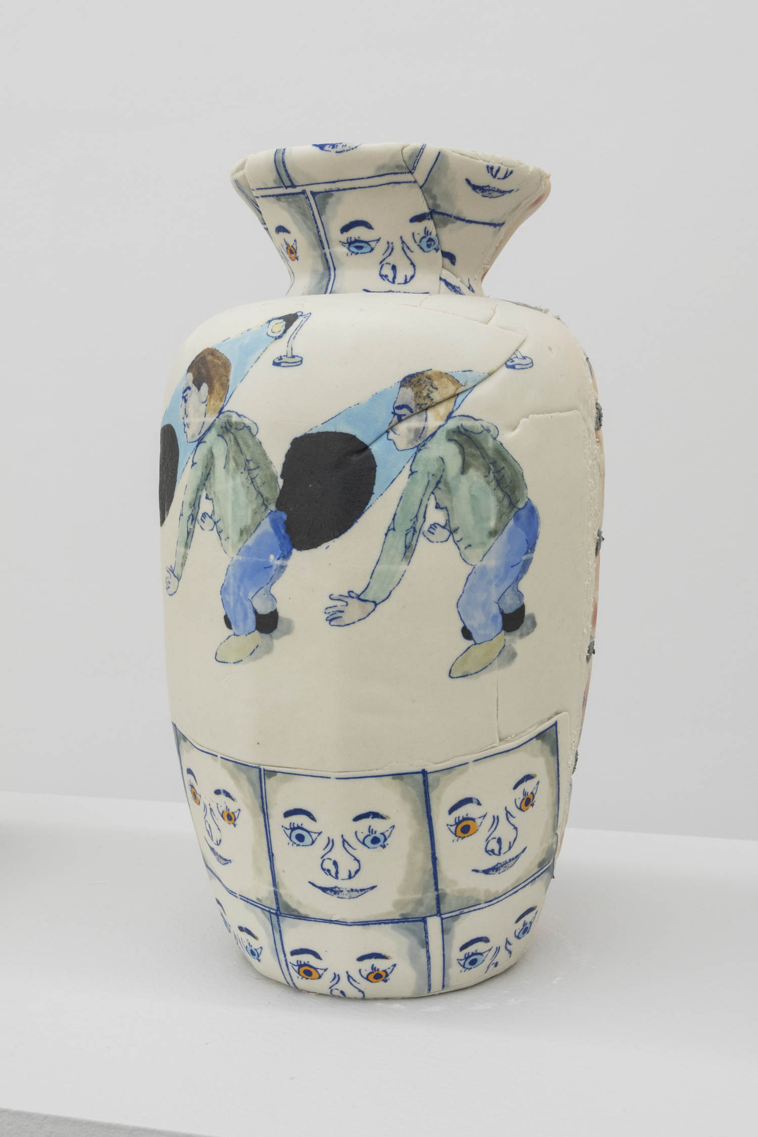 For ceramic as vessel, we have Jenny Hata Blumenfield assembling floppy failed pots into a wall piece with a silhouetted vessel overlaid. Trevor Baird contributes traditional enough vases but elaborately painted with comics and doodles, a sort of drawing/ceramic hybrid.