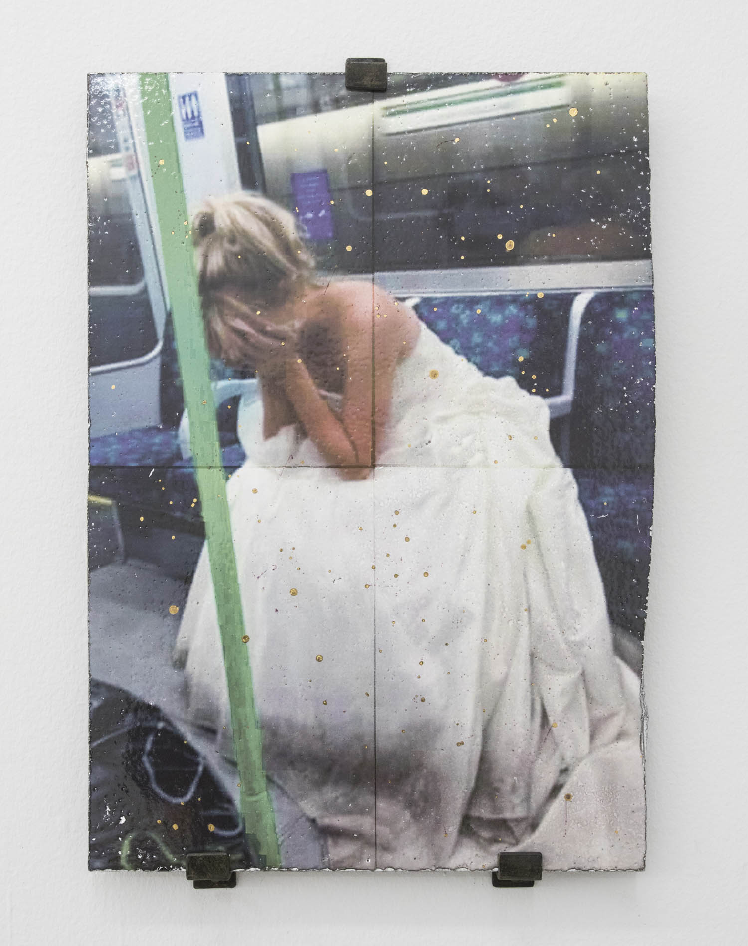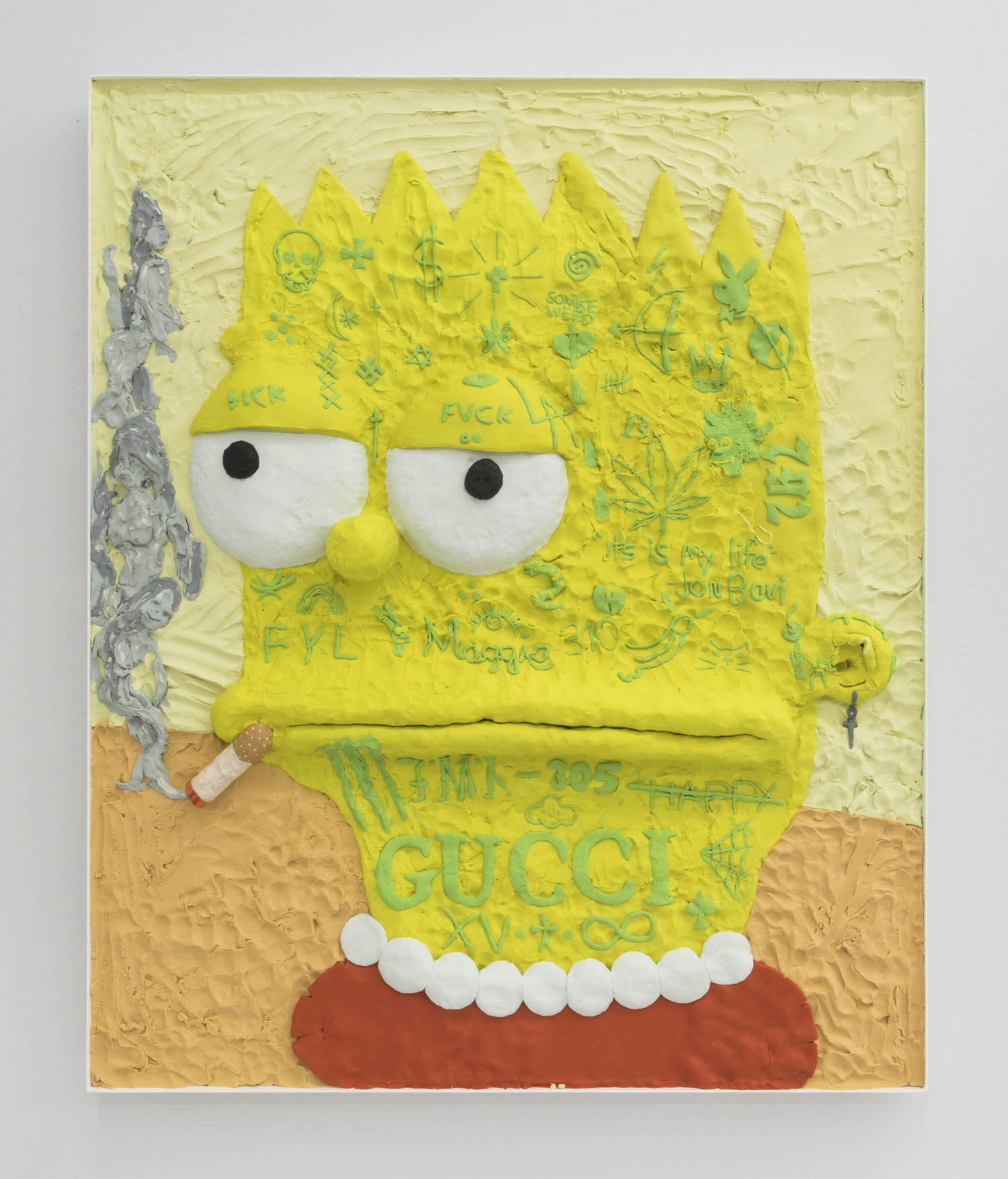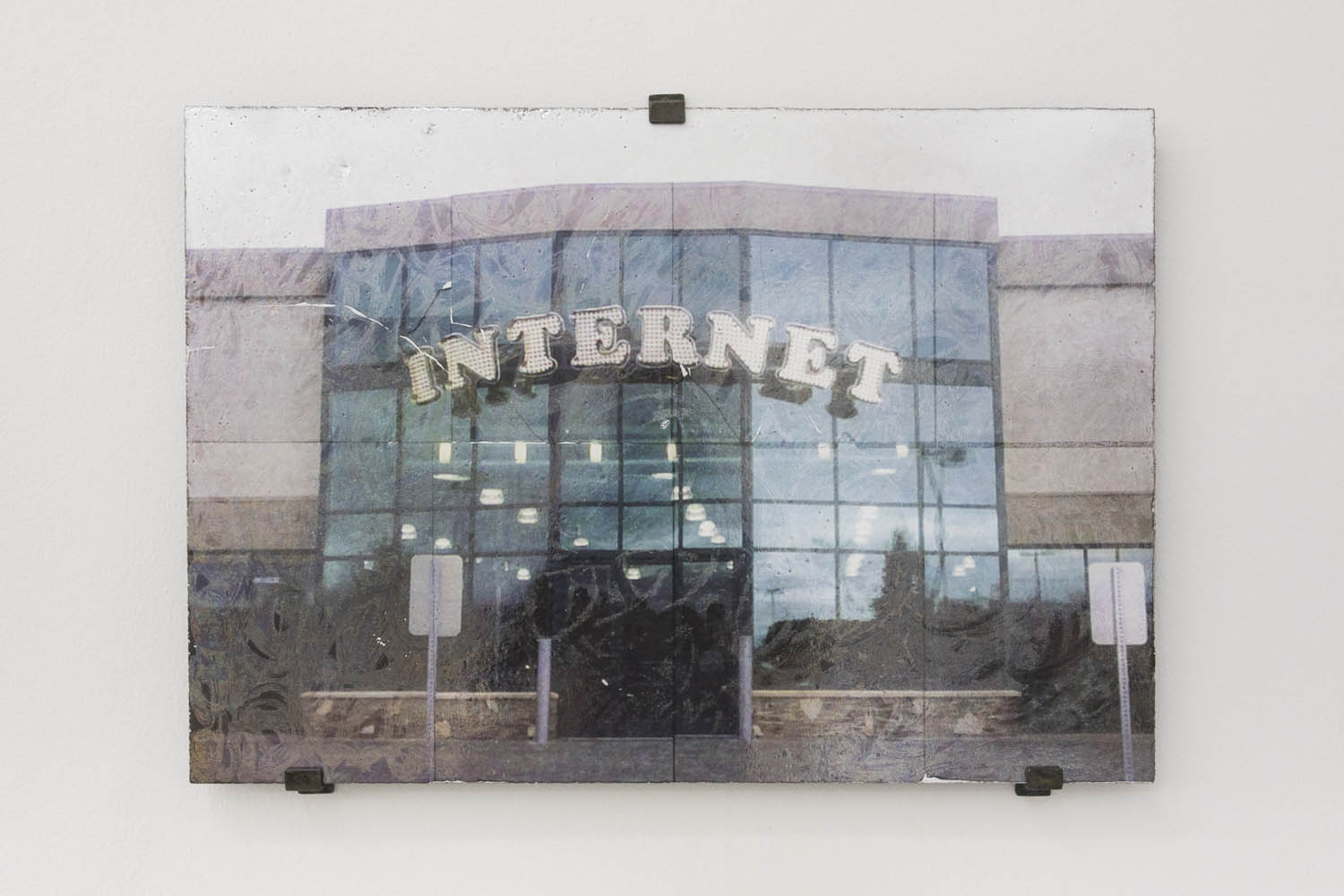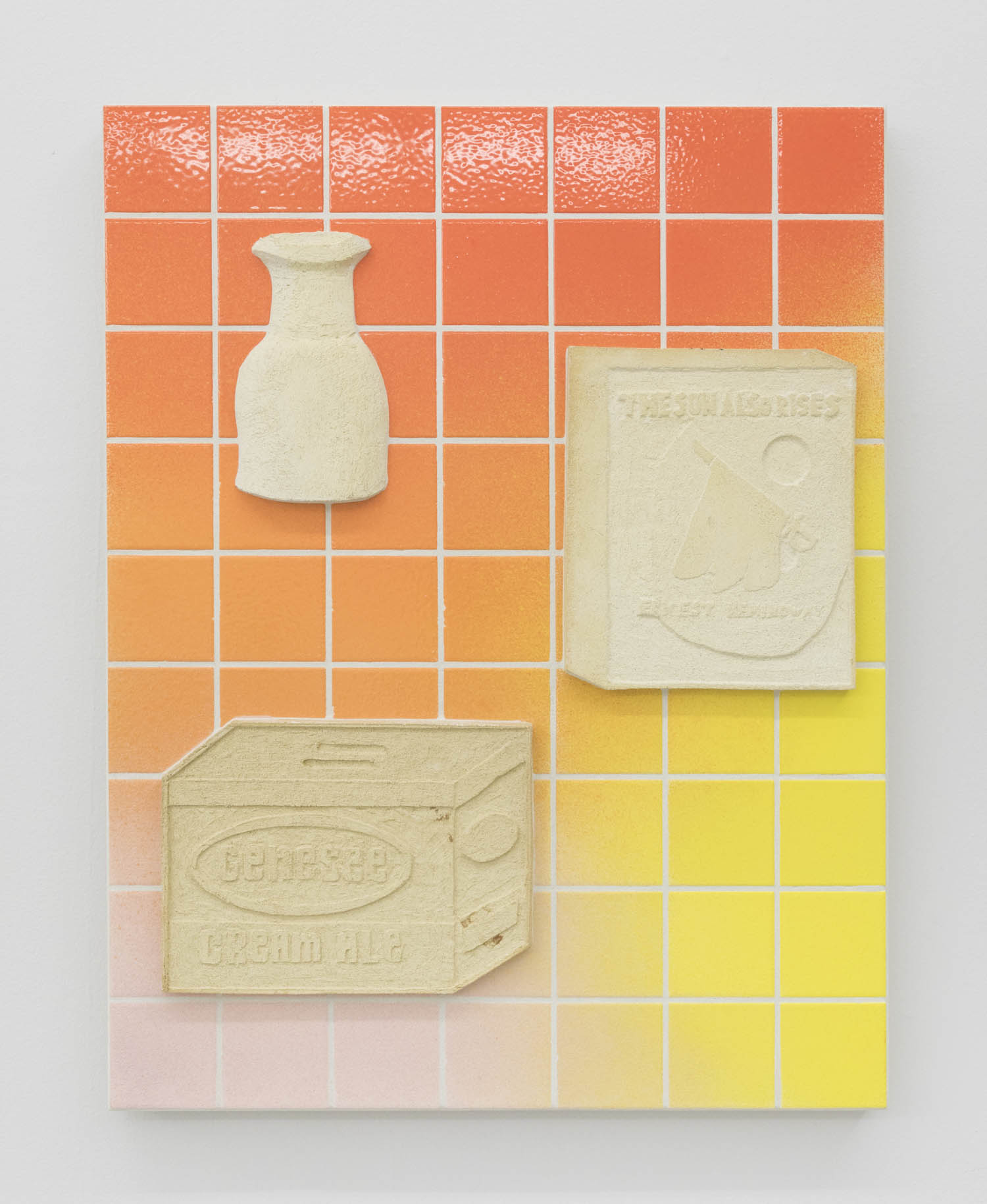 Thomas Mailaender also cultivates the randomly juxtaposed with snippets of internet debris baked into lava slabs. Like Gustav Hamilton’s wall piece nearby–which will send you googling what Ernest Hemmingway and Genesee Cream Ale have to do with each other—the notion of making permanent in fire something culturally ephemeral has an inherent humor.