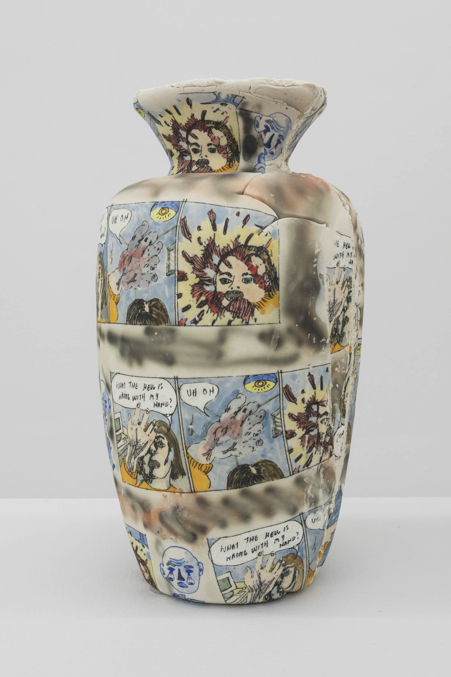 In the 2010s, the piling up of clay steadied. Slick fabrication has perhaps created this backlash in favor of the handmade and unique, and seeing ceramics by older much-loved artists like Ken Price or Betty Woodman go around the world in traveling museum retrospectives probably emboldens young artists to test their hand. The mutability and adaptability of the medium could also be seen as a great choice in times of cultural upheaval (LOL but what art isn’t?). Or it could just provide a cave-man escape getting mudded up to take us away from all the glowing screens.