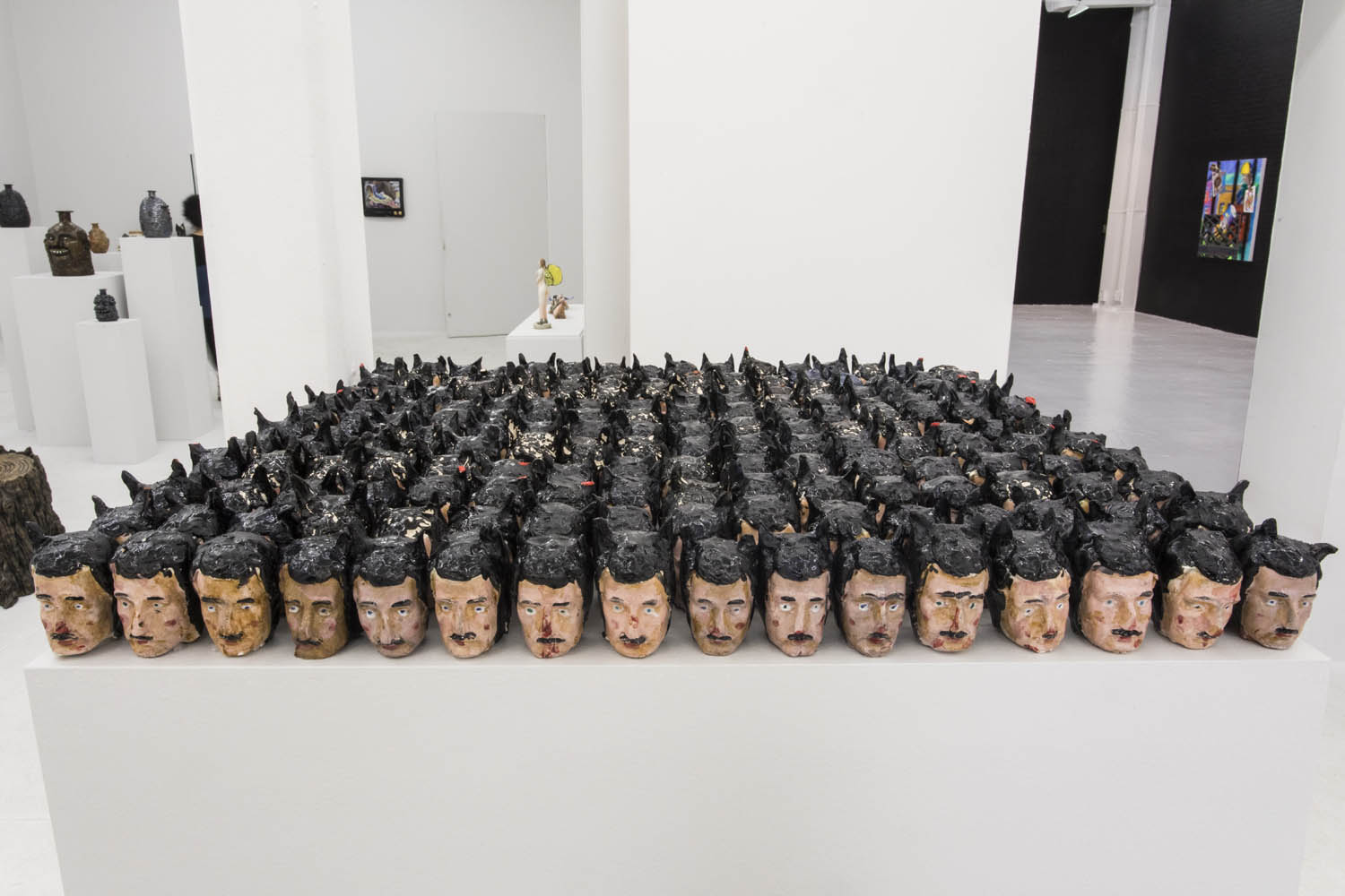 Pushing humor and idiosyncrasy even further would be Joakim Ojanen and his squid posse, Rebecca Morgan and her ugly pot people, Christian Vargas’ 200-member two-faced superhero army. FriendsWithYou’s Play-Doh-ish punk Bart Simpson has the defaced quality of a middle school desk while Theo Rosenblum places the most bizarrely enigmatic “King Carrot” in the middle of the gallery, epoxy clay painted in detail with acrylic paint.