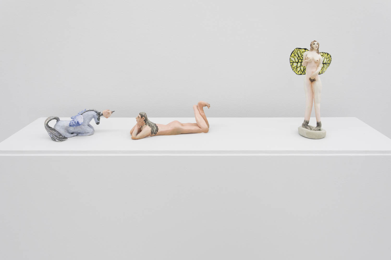 In a kind of mythical realm pushing the glazes to their unicorn best are works by Roxanne Jackson and Kaley Flowers, creating works in ceramic that look like treasures from another dimension, like the detailed bowl filled with pearlescent pigments by Allison Schulnik. The fantastical exterior is contrasted with the physical reality of the glazes pooling inside the pot in a super thick, vitreous puddle. Kate Klingbeil’s dark fantasy scene of magical nudes depicts a fairy, nude apart from socks, caressing her own body as a woman admires her pet’s kill- a decapitated man’s head, freshly impaled by pegasus’ shiny horn.