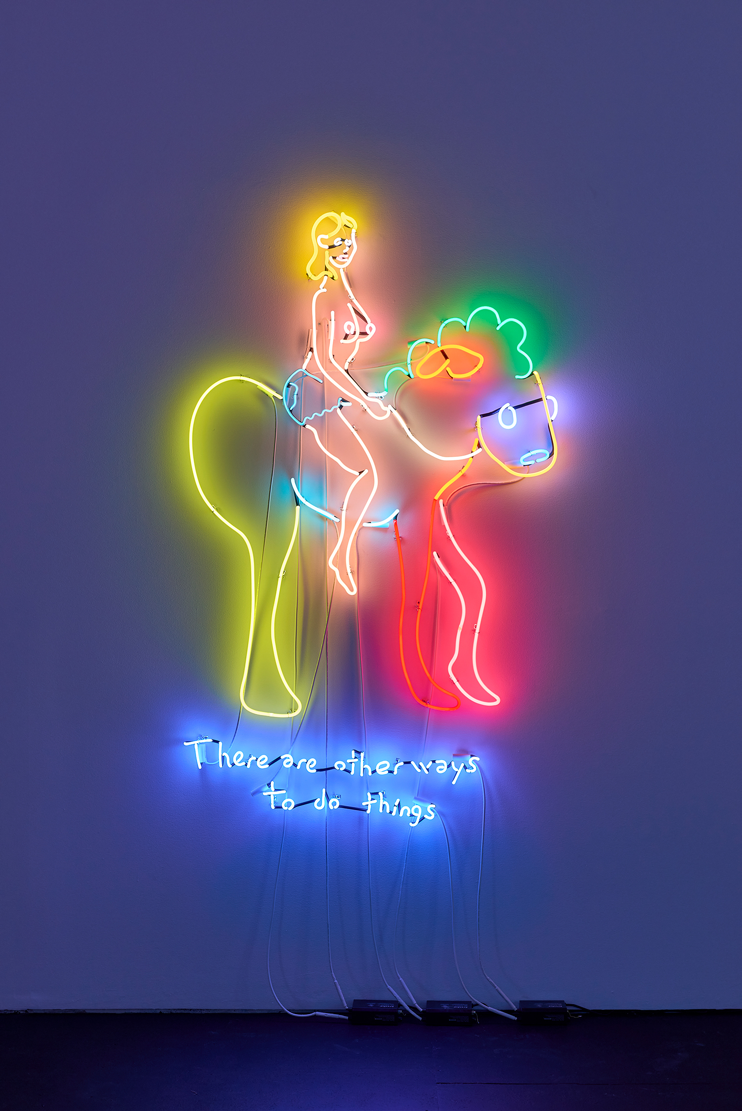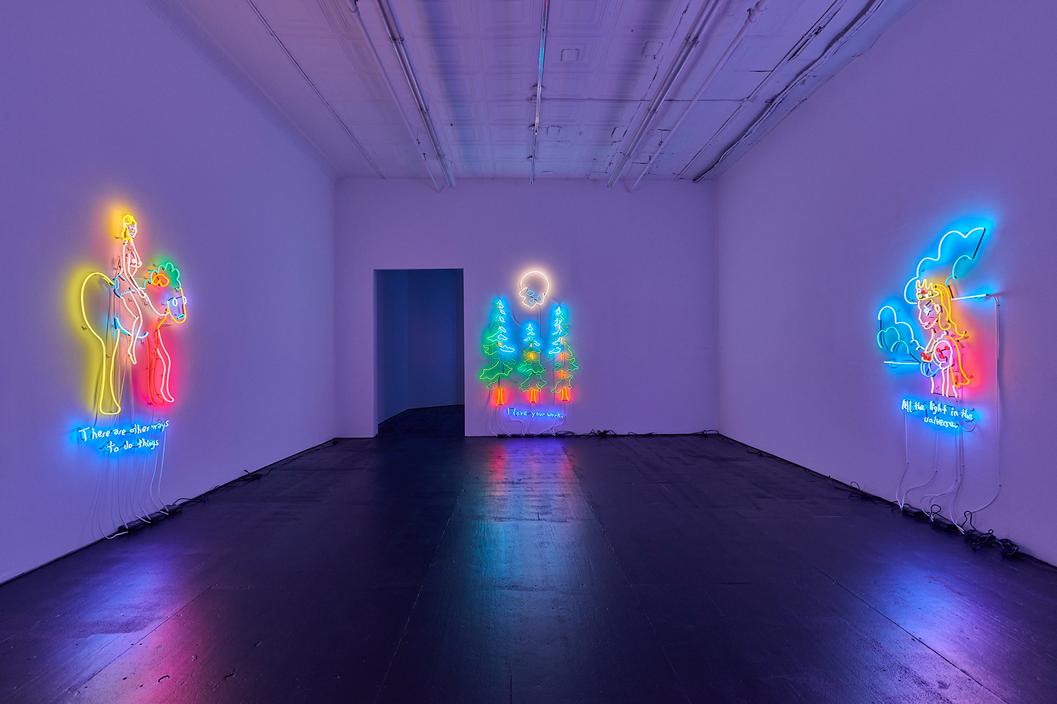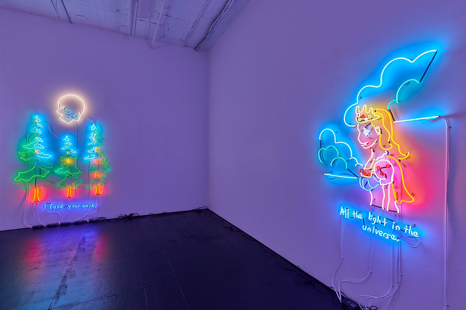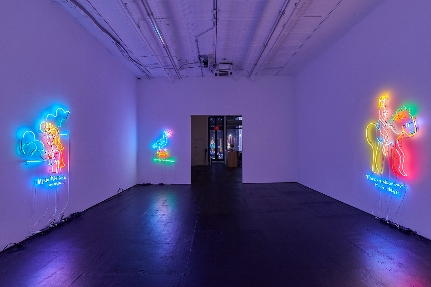 Two illuminating ladies offer some light at the end of the winter tunnel, tho perhaps quixotically. One Lady Godiva in jeans shorts straddles what looks like a horse drawn by someone who has never seen a horse. The other is a pretty princess, insipidly offering “all the light in the universe.” These works bring us back to the reason Attoe has maintained a relationship to neon which is its ability to connote both Las Vegas seduction and dive bar philosophy; we are drawn to the flame but it provides no comforting warmth.