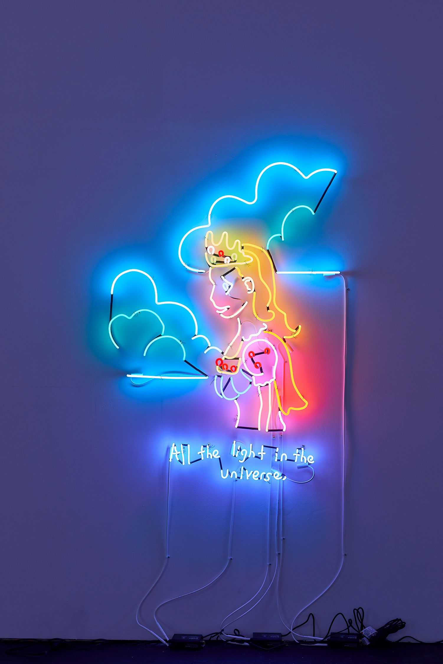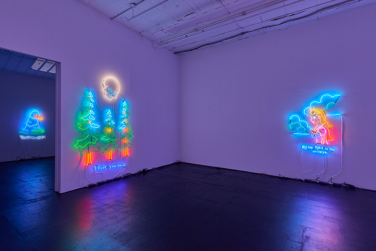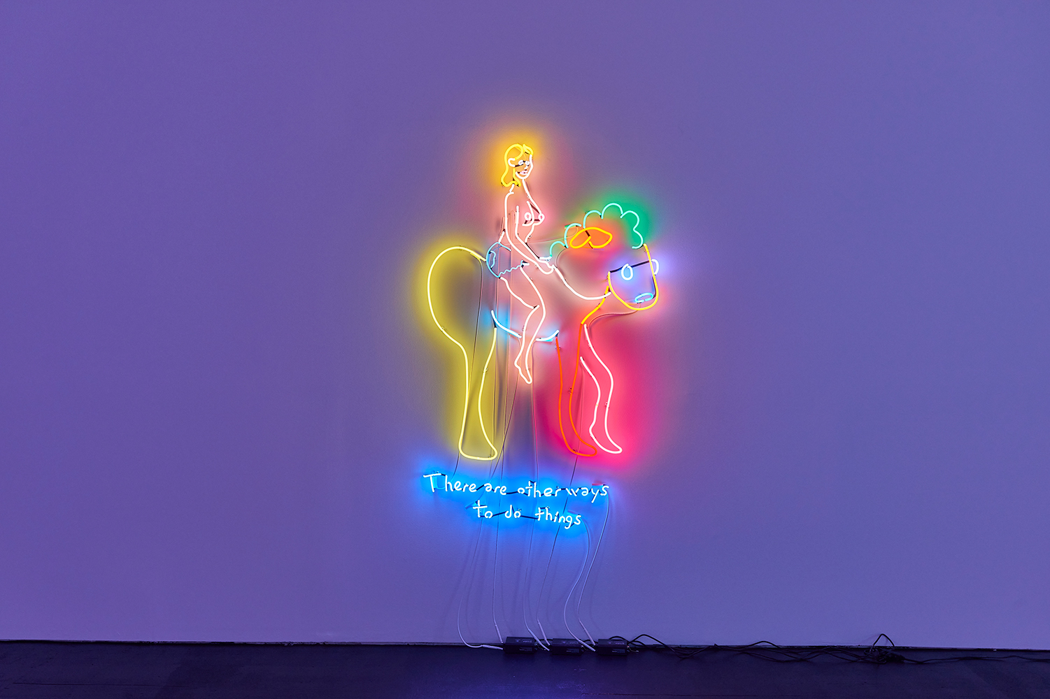 Two illuminating ladies offer some light at the end of the winter tunnel, tho perhaps quixotically. One Lady Godiva in jeans shorts straddles what looks like a horse drawn by someone who has never seen a horse. The other is a pretty princess, insipidly offering “all the light in the universe.” These works bring us back to the reason Attoe has maintained a relationship to neon which is its ability to connote both Las Vegas seduction and dive bar philosophy; we are drawn to the flame but it provides no comforting warmth.